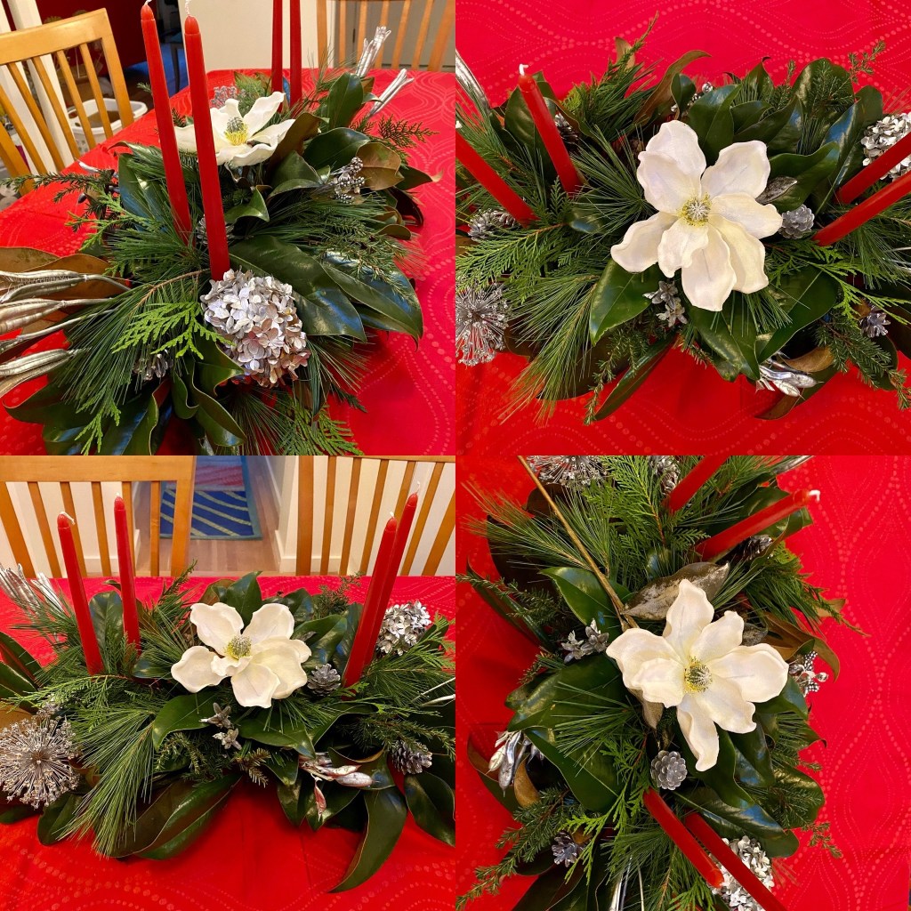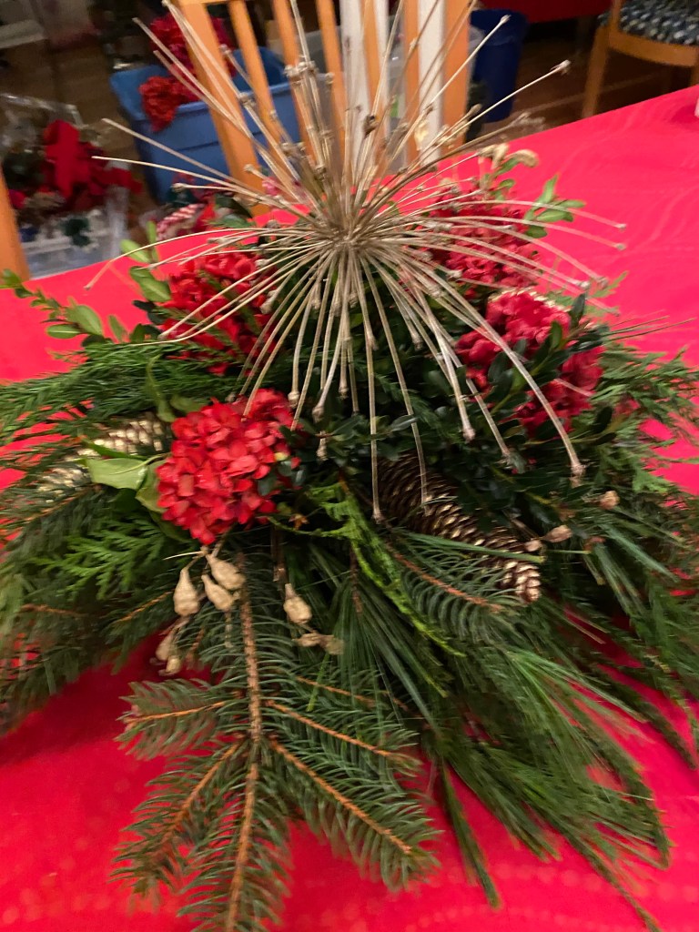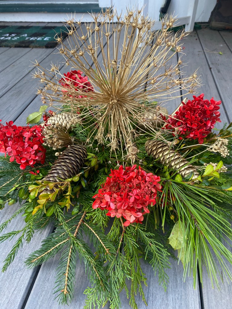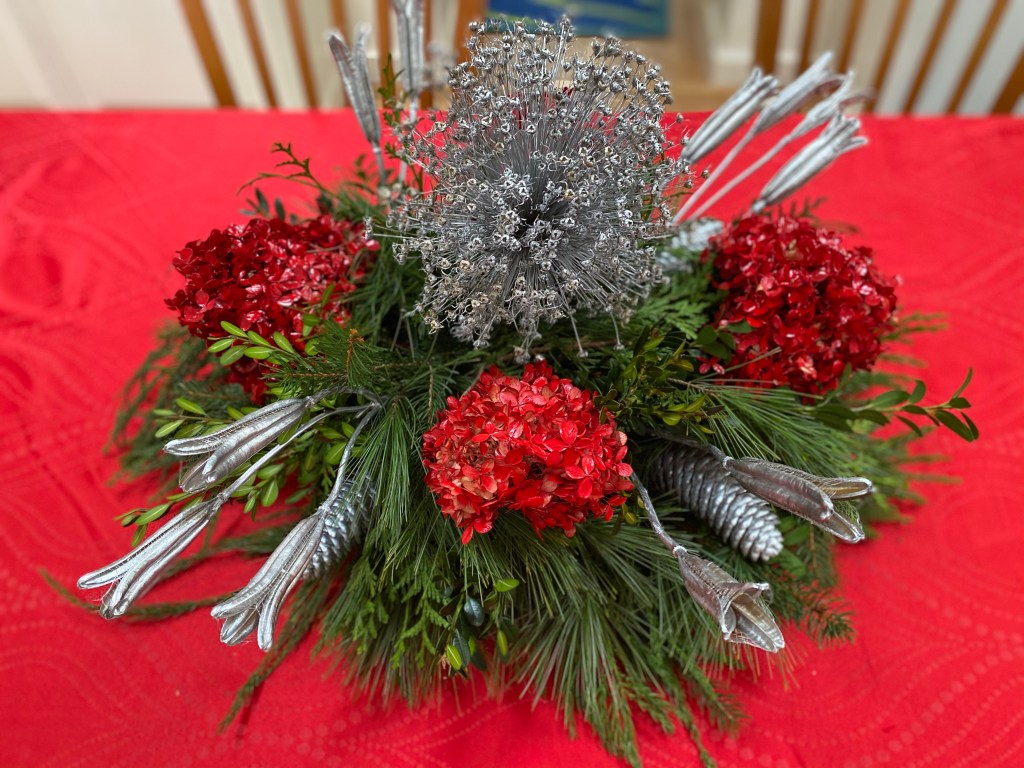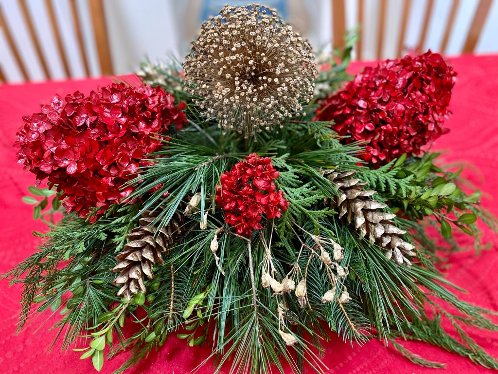 Let me custom create a joyful, fresh, unique, long lasting (4 weeks or more) centerpiece with seven types evergreens from my yard, spray painted pinecones, hydrangeas, allium, blackberry lily, formosa lily, and velvetleaf pods in silver, gold, red, or mixed tones. Starting at $45 each for average table size, larger available priced per order.
