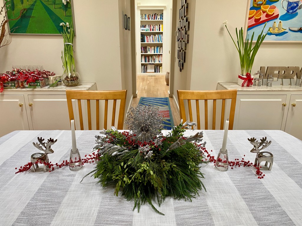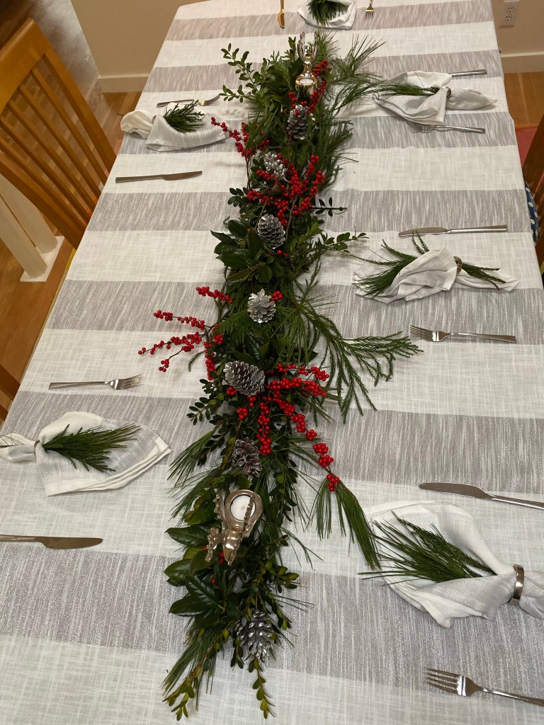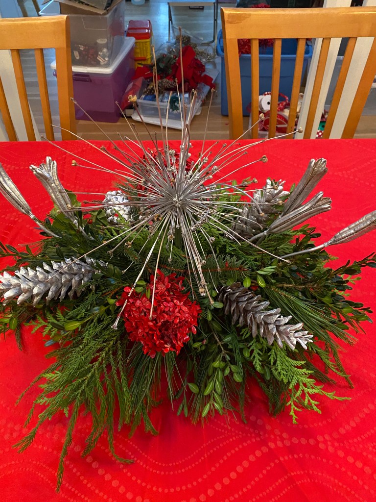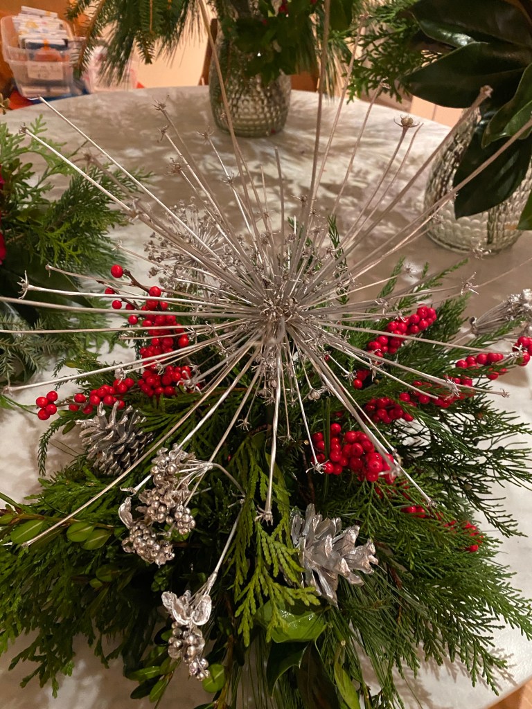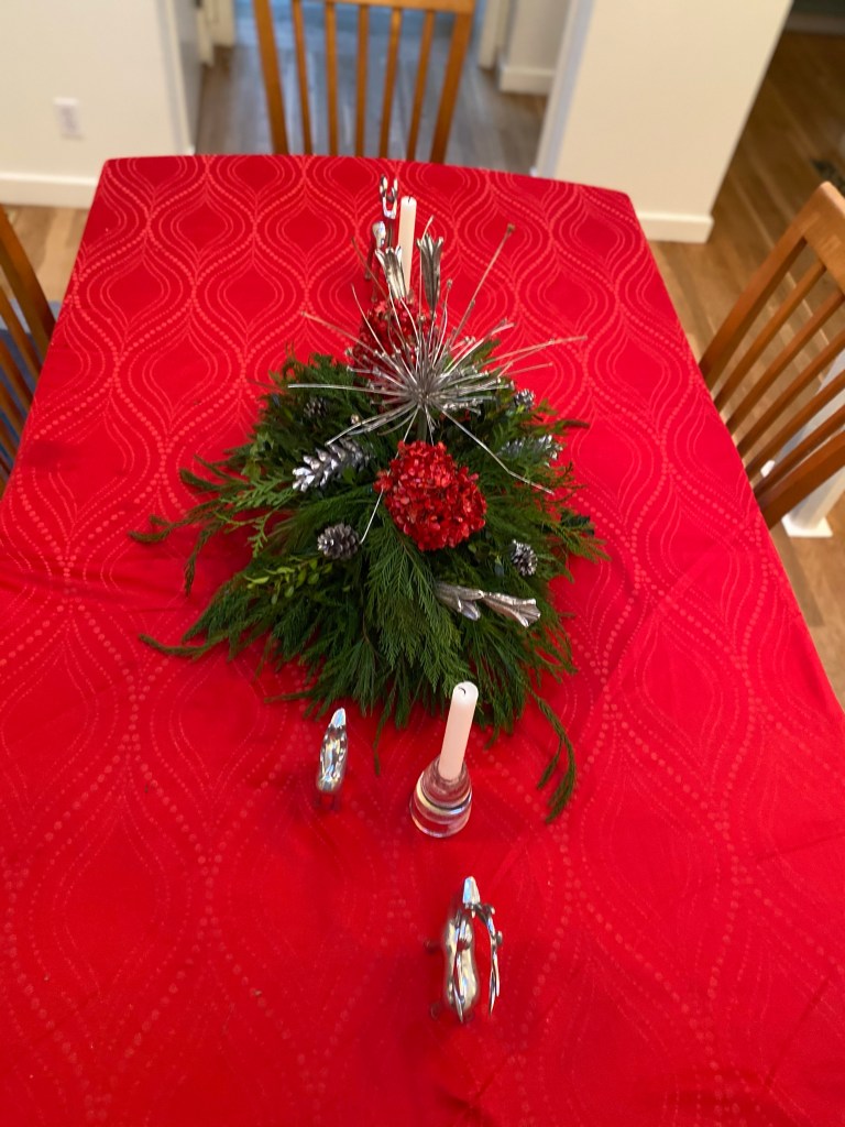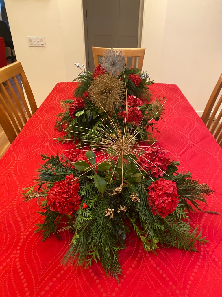 Let me custom create a joyful, fresh, unique, long lasting (4 weeks or more) centerpiece with seven types evergreens from my yard, spray painted pinecones, hydrangeas, allium, blackberry lily, formosa lily, and velvetleaf pods in silver, gold, red, or mixed tones. Starting at $45 each for average table size, larger available priced per order.