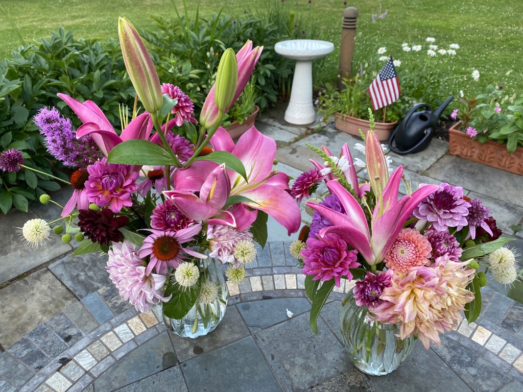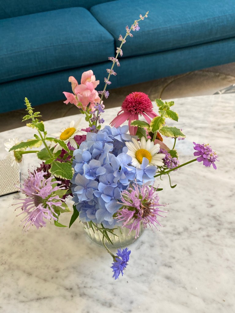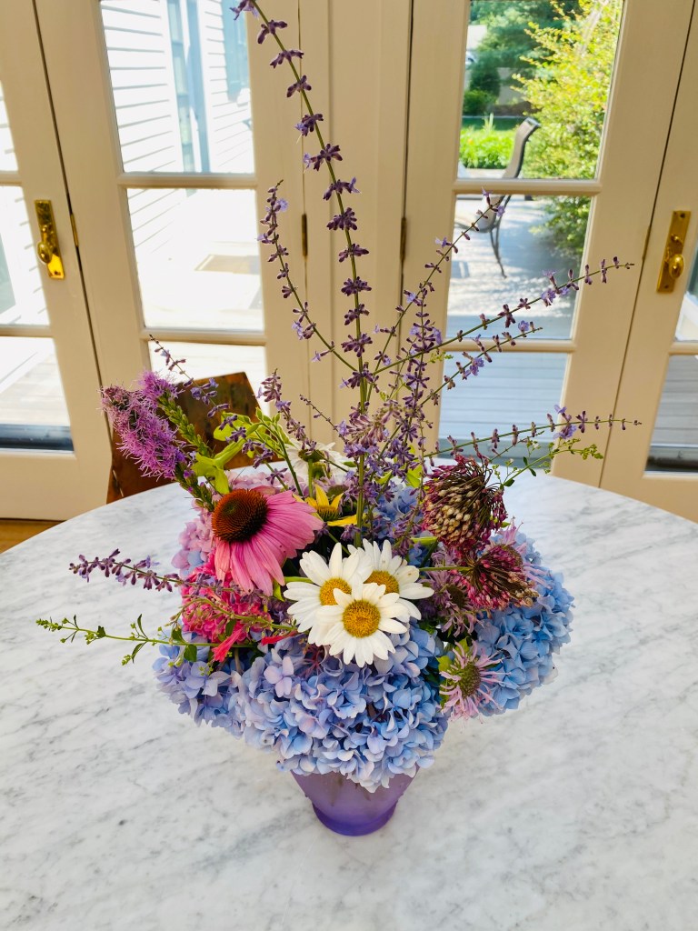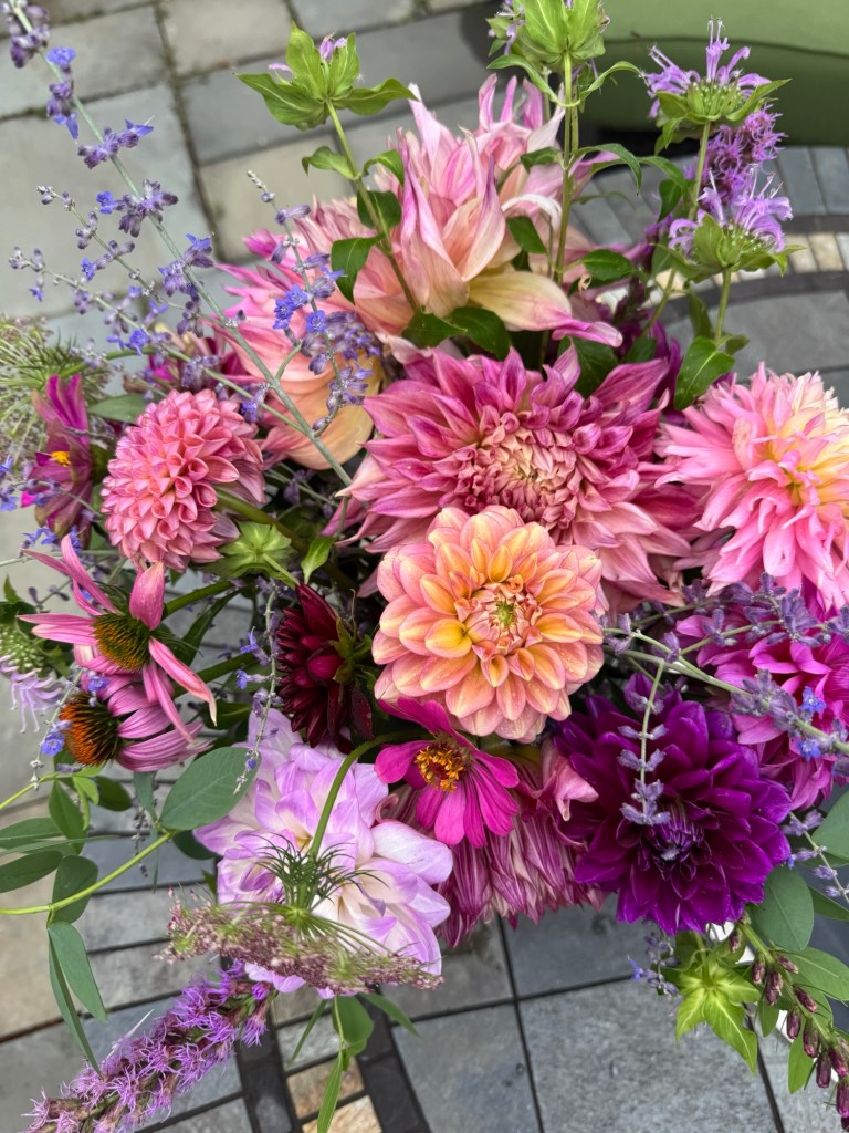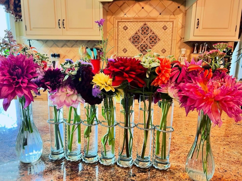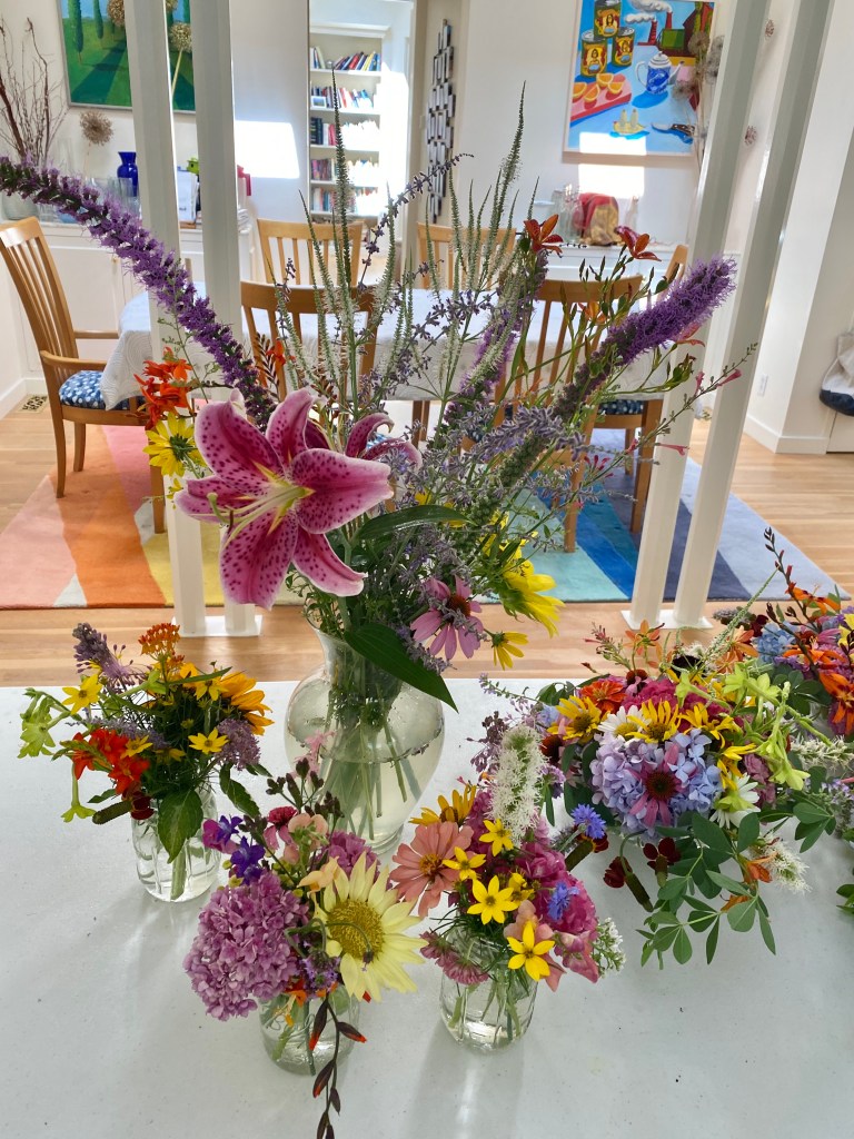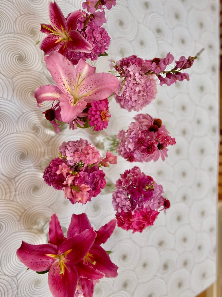 Magical blue, pink, and purple hydrangeas combine with daisies, heliopsis, Russian sage, ascleplias, crocosimia, feverfew, roses, delphinium, pin cushion flower, zinnias, Japanese anemone, Culver’s root, coreopsis, nicotinia, verbena, Maltese cross, mountain mint, liatris, native bee balm, echinacea, lilies and so much more. Many of the annual seedlings I started indoors in March, along with potting up dahlias for an early start and transferred outside, are blooming. I love introducing new, unusual, and good cut flower annuals each year. Annuals include Sultan’s basket, salvia, celosia, zinnias, cosmos, nasturtium, and so much more. Look at these gorgeous and fun variations on pink in bud vases that brightened a Sweet 16 birthday party, and low centerpieces for a 50th birthday where cherished friends each went home with the gift of flowers.