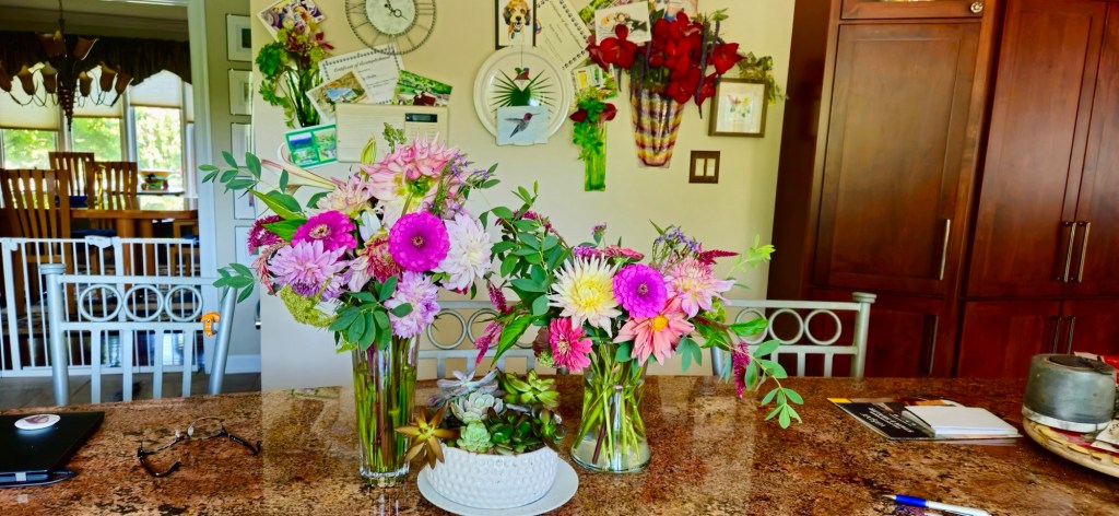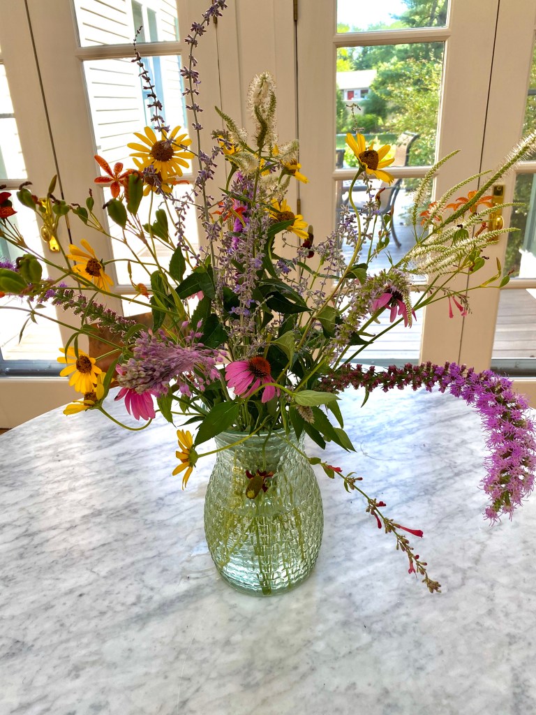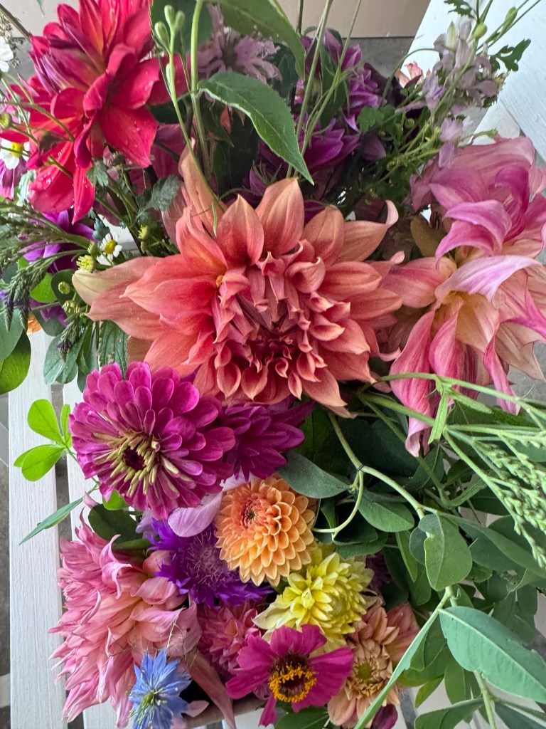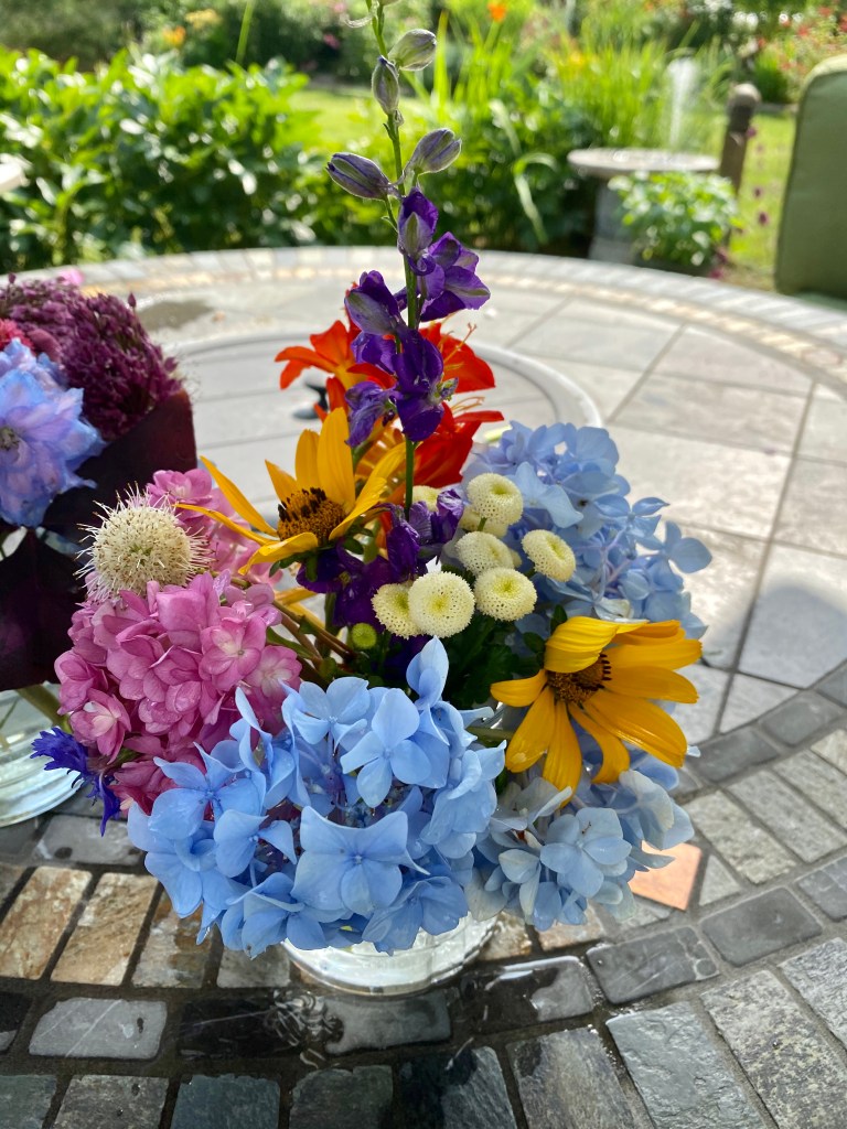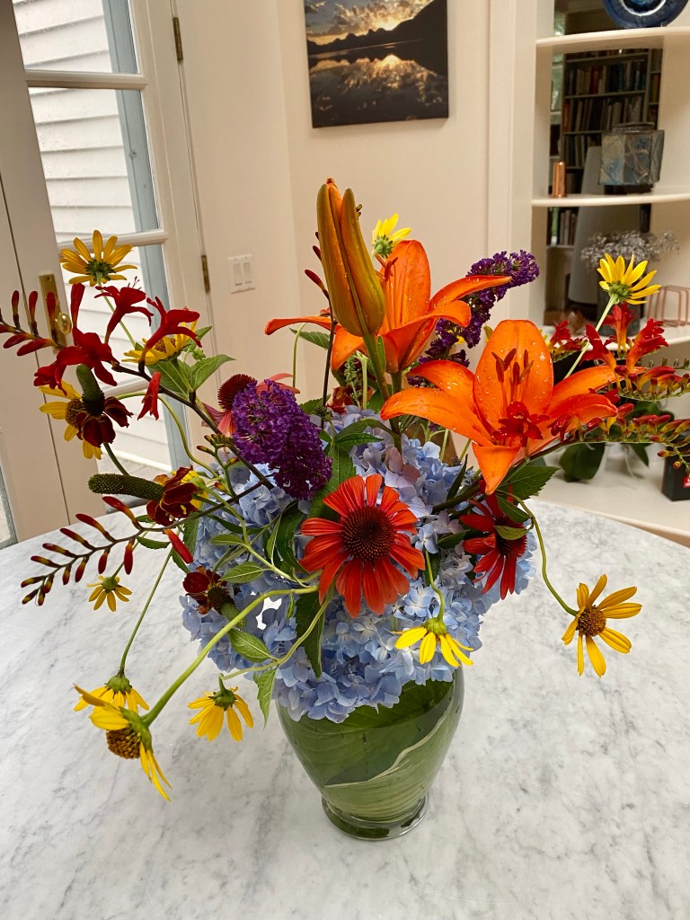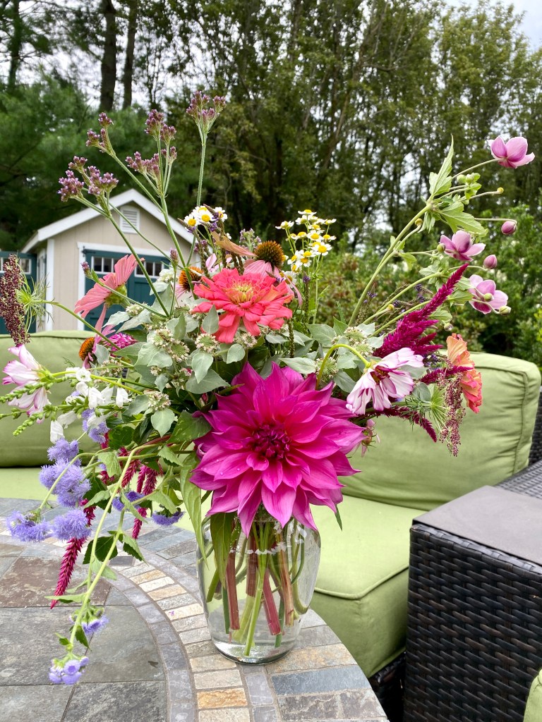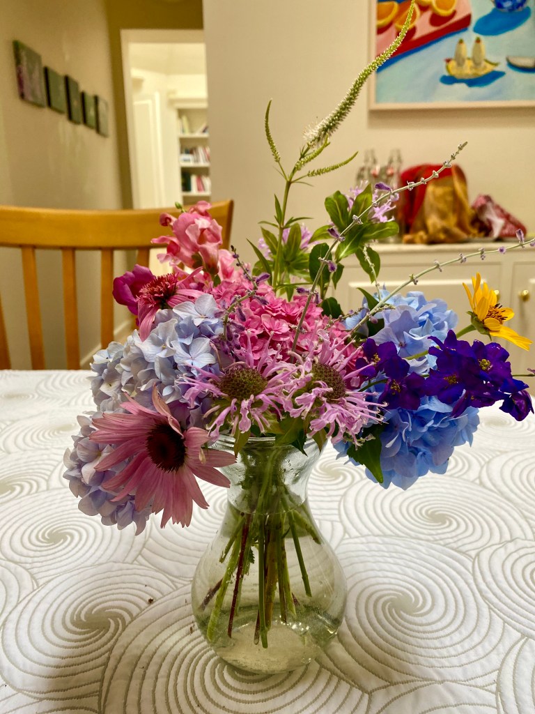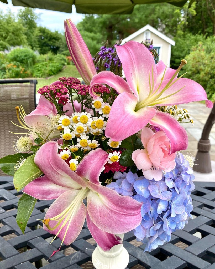 Magical blue, pink, and purple hydrangeas combine with daisies, heliopsis, Russian sage, ascleplias, crocosimia, feverfew, roses, delphinium, pin cushion flower, zinnias, Japanese anemone, Culver’s root, coreopsis, nicotinia, verbena, Maltese cross, mountain mint, liatris, native bee balm, echinacea, lilies and so much more. Many of the annual seedlings I started indoors in March, along with potting up dahlias for an early start and transferred outside, are blooming. I love introducing new, unusual, and good cut flower annuals each year. Annuals include Sultan’s basket, salvia, celosia, zinnias, cosmos, nasturtium, and so much more. Look at these gorgeous and fun variations on pink in bud vases that brightened a Sweet 16 birthday party, and low centerpieces for a 50th birthday where cherished friends each went home with the gift of flowers.
