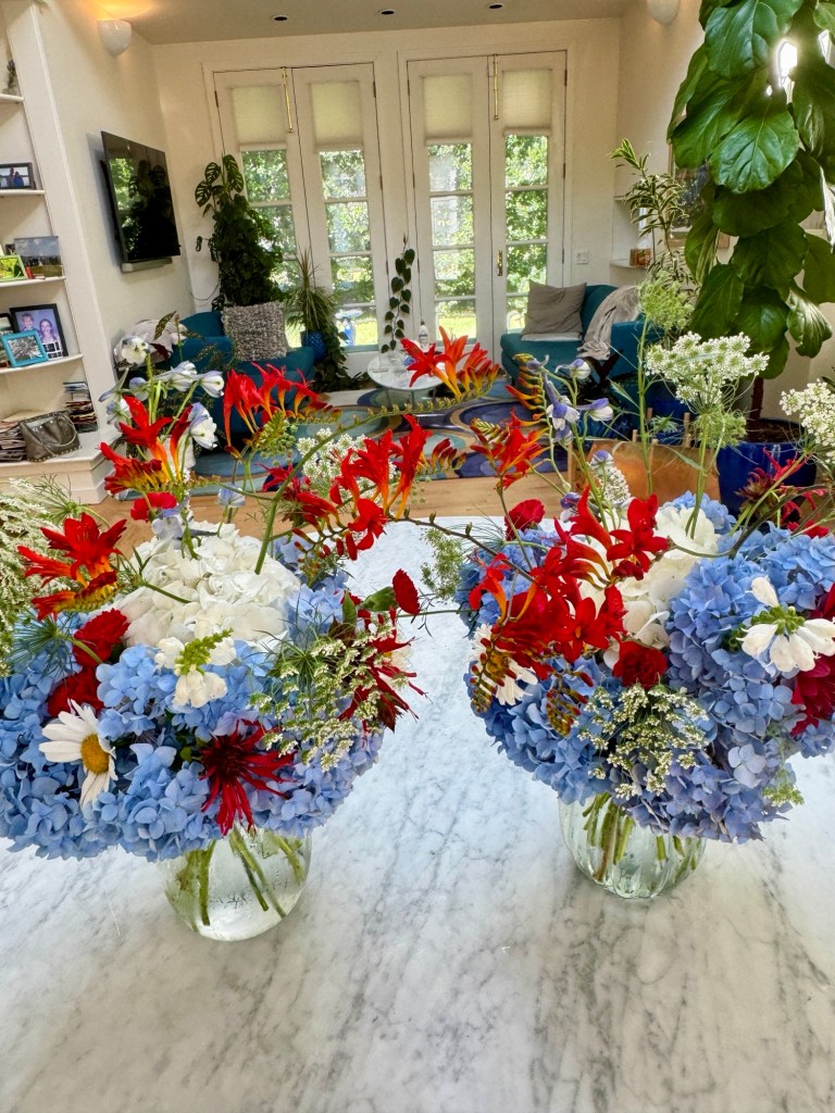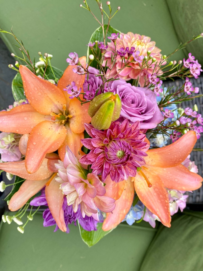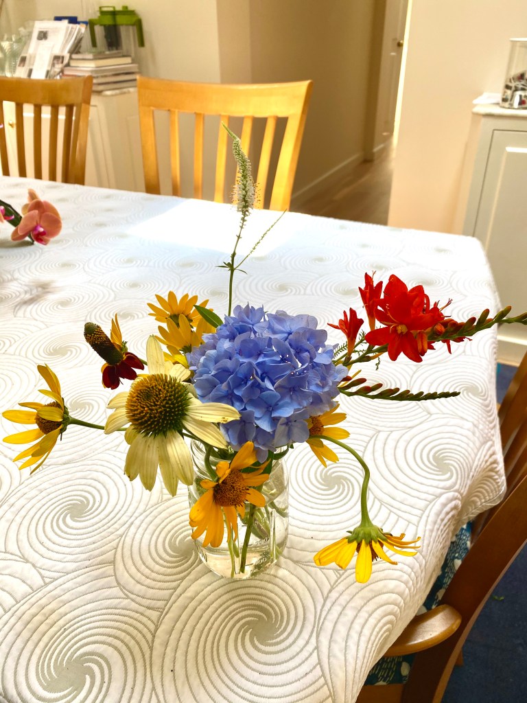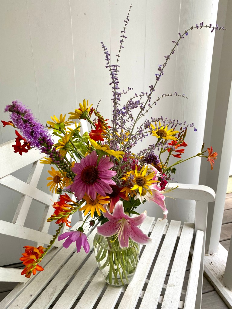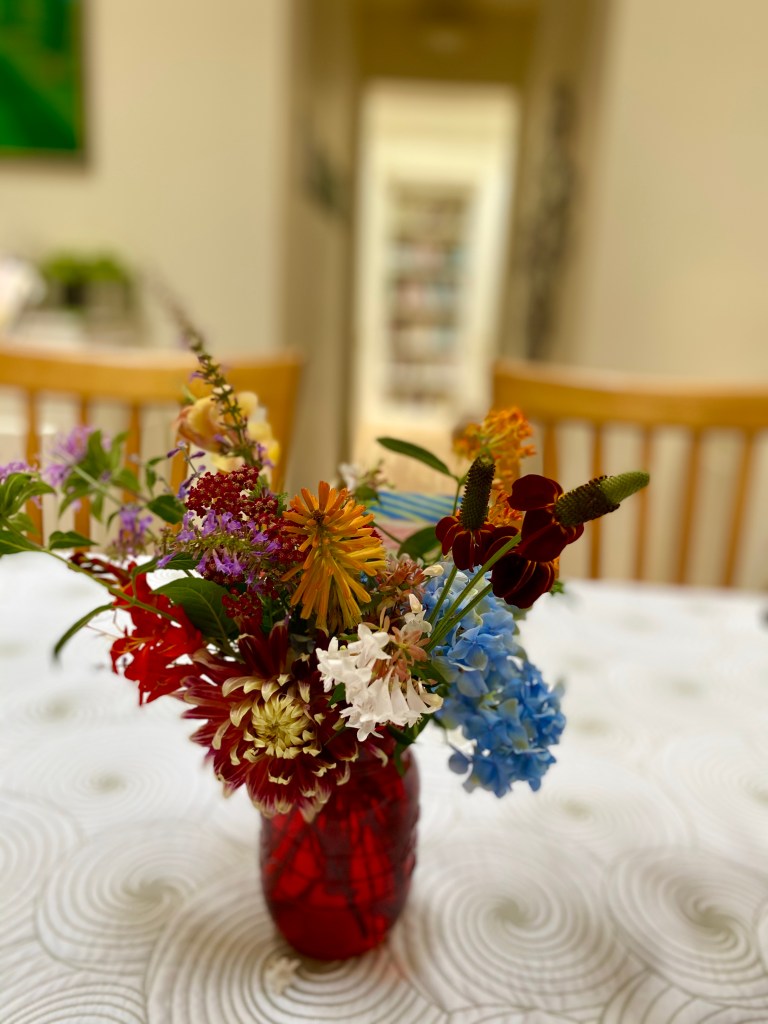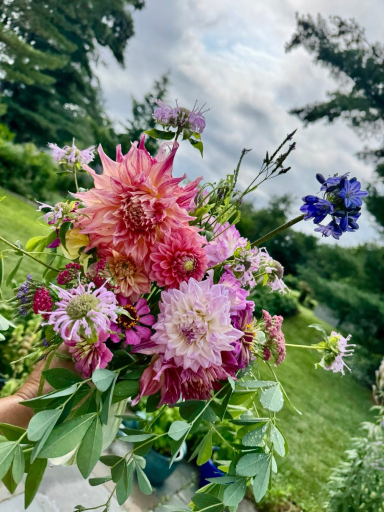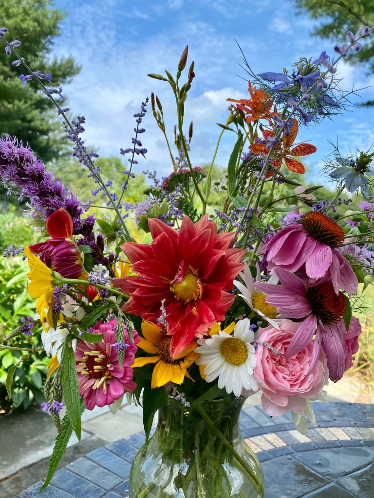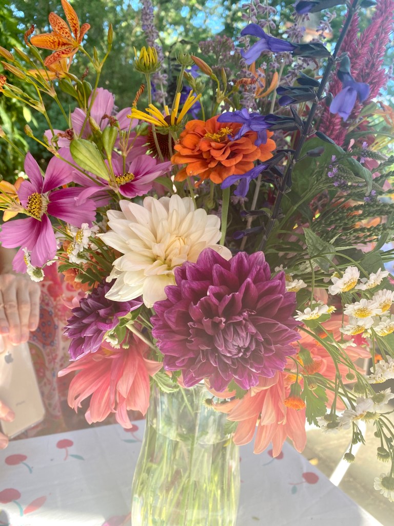 Magical blue, pink, and purple hydrangeas combine with daisies, heliopsis, Russian sage, ascleplias, crocosimia, feverfew, roses, delphinium, pin cushion flower, zinnias, Japanese anemone, Culver’s root, coreopsis, nicotinia, verbena, Maltese cross, mountain mint, liatris, native bee balm, echinacea, lilies and so much more. Many of the annual seedlings I started indoors in March, along with potting up dahlias for an early start and transferred outside, are blooming. I love introducing new, unusual, and good cut flower annuals each year. Annuals include Sultan’s basket, salvia, celosia, zinnias, cosmos, nasturtium, and so much more. Look at these gorgeous and fun variations on pink in bud vases that brightened a Sweet 16 birthday party, and low centerpieces for a 50th birthday where cherished friends each went home with the gift of flowers.
