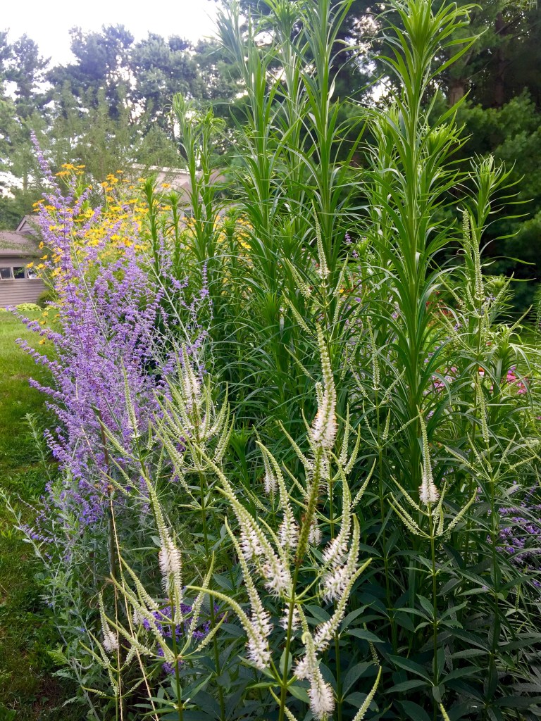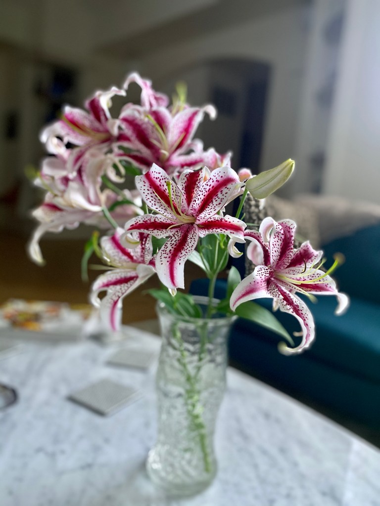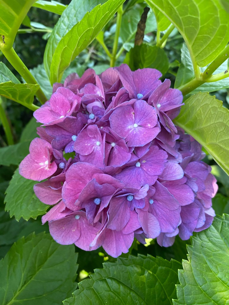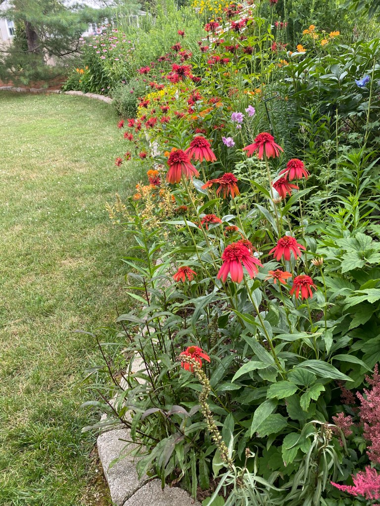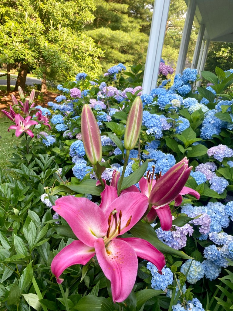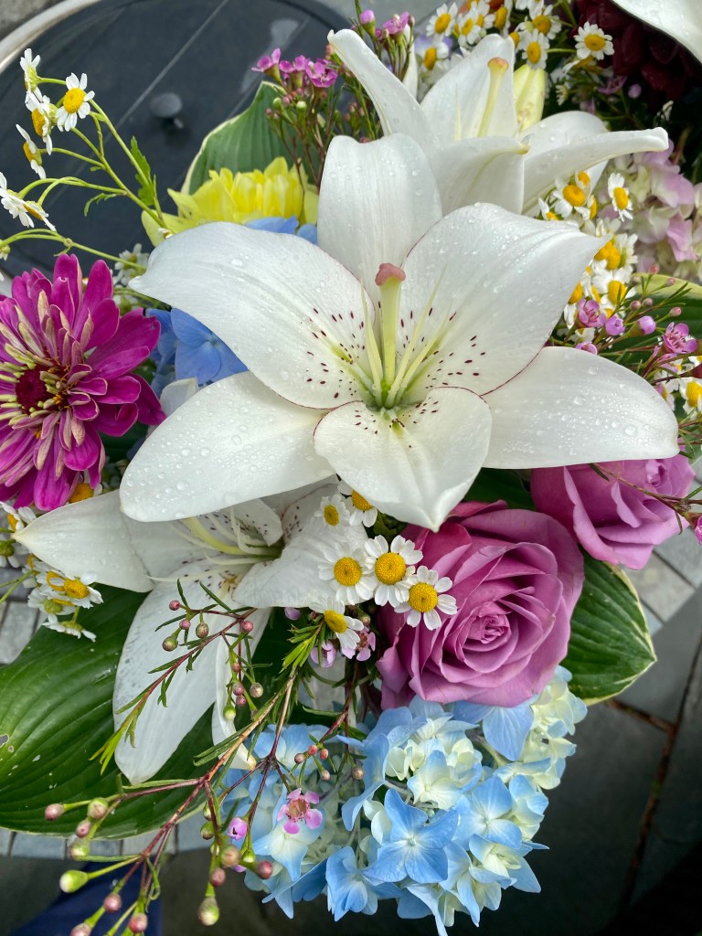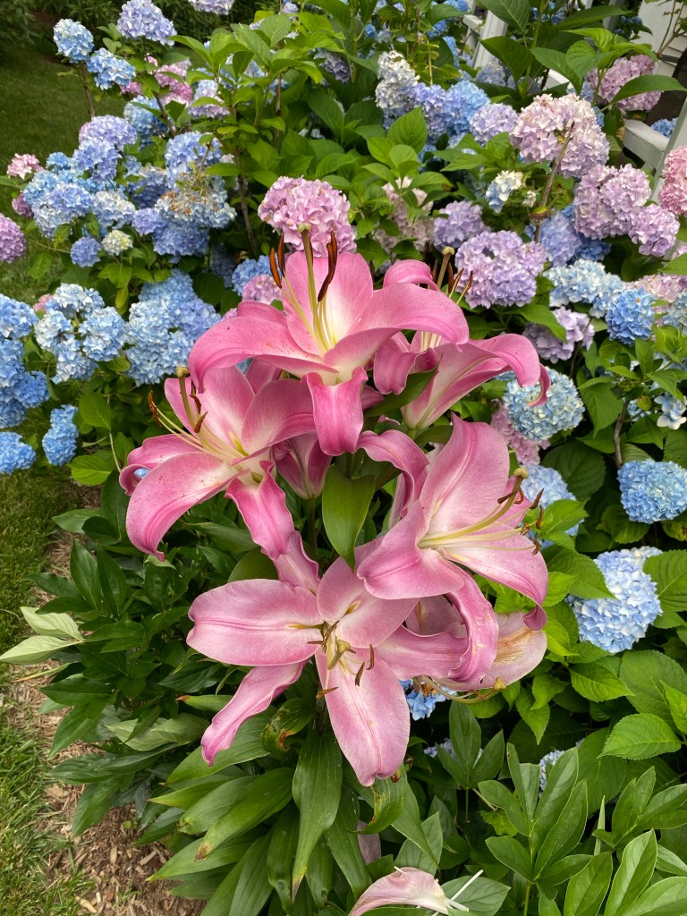 Magical blue, pink, and purple hydrangeas combine with daisies, heliopsis, Russian sage, ascleplias, crocosimia, feverfew, roses, delphinium, pin cushion flower, zinnias, Japanese anemone, Culver’s root, coreopsis, nicotinia, verbena, Maltese cross, mountain mint, liatris, native bee balm, echinacea, lilies and so much more. Many of the annual seedlings I started indoors in March, along with potting up dahlias for an early start and transferred outside, are blooming. I love introducing new, unusual, and good cut flower annuals each year. Annuals include Sultan’s basket, salvia, celosia, zinnias, cosmos, nasturtium, and so much more. Look at these gorgeous and fun variations on pink in bud vases that brightened a Sweet 16 birthday party, and low centerpieces for a 50th birthday where cherished friends each went home with the gift of flowers.