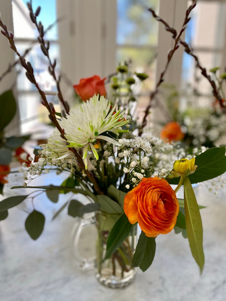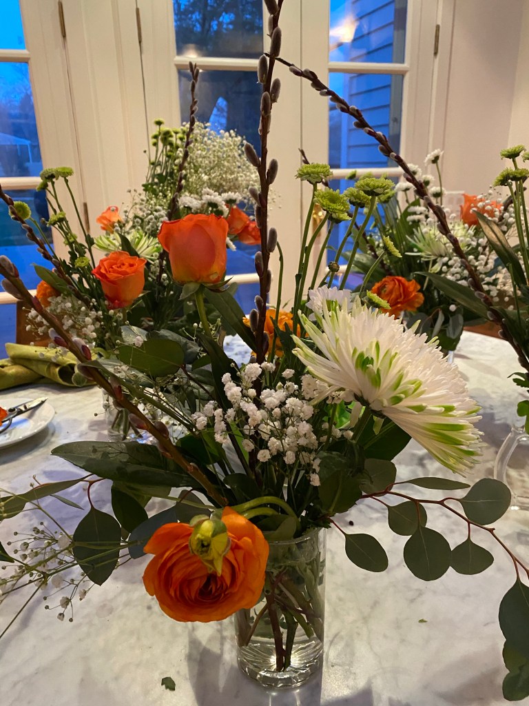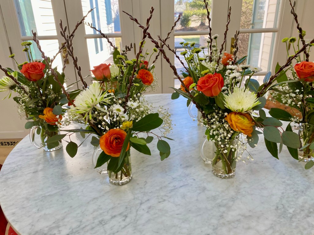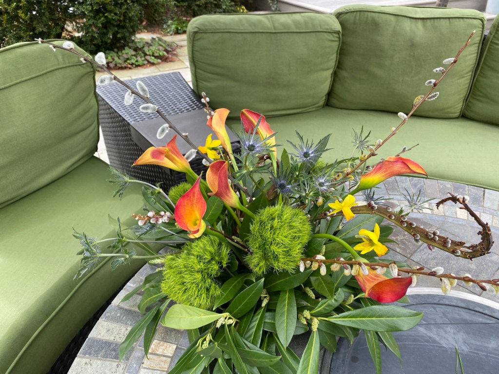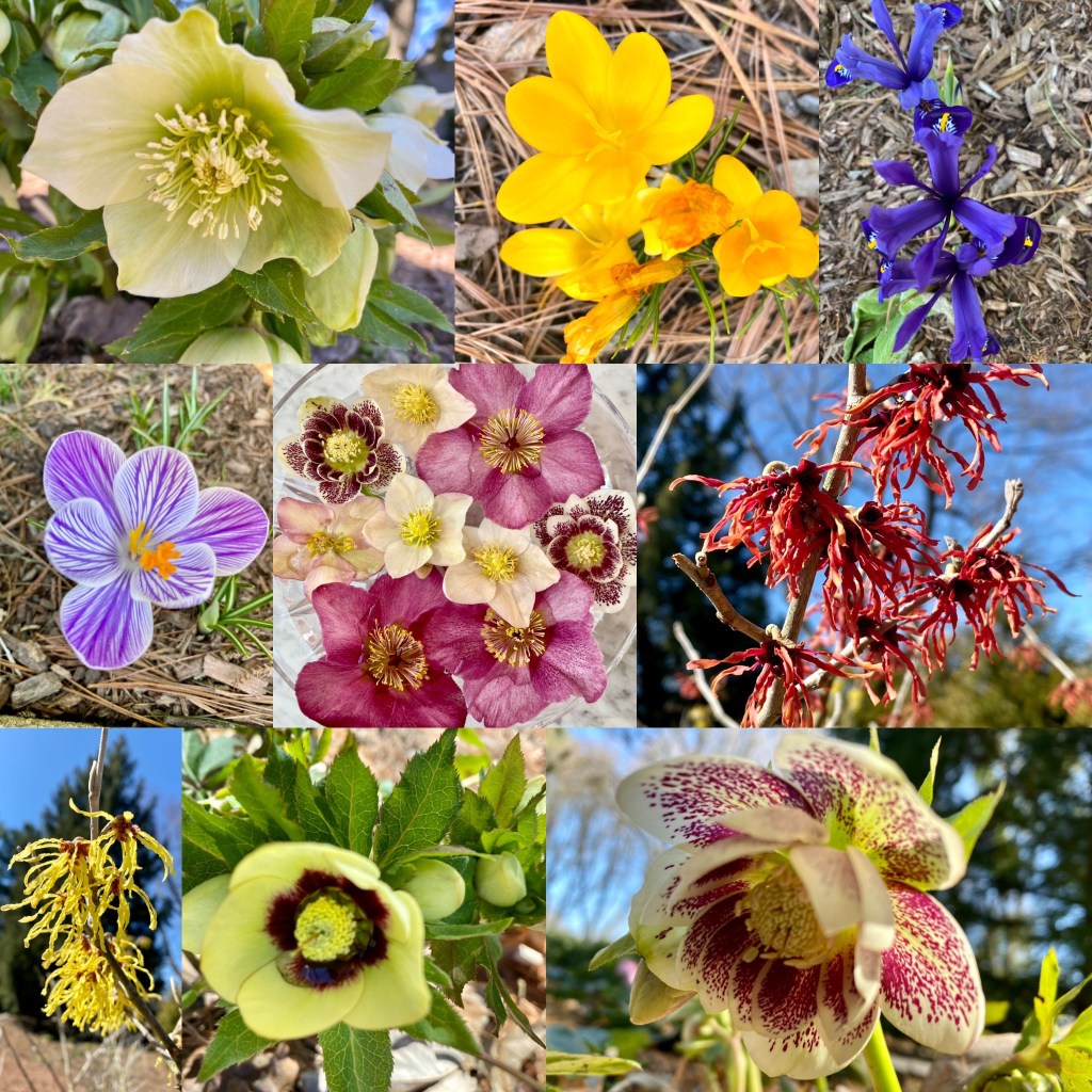 Hellebores, pussywillows, daffodils, crocuses, snow drops, winter aconite, witch hazel are blooming in my yard in March. Floating hellebores/lenten roses in a low dish, bowl or saucer can be magical. I have been arranging flowers for customers during the first three months of the year, that I have purchased and augmented with early spring bloomers, from my yard. St. Patrick day themed birthday celebrations in beer steins, floral crowns and more! I also like to start my front door urns in February through April with a combination of silk flowers, and natural elements like pussywillows and laurel, encircled by a grape vine wreath. Happy to make any of these things to brighten your home!
