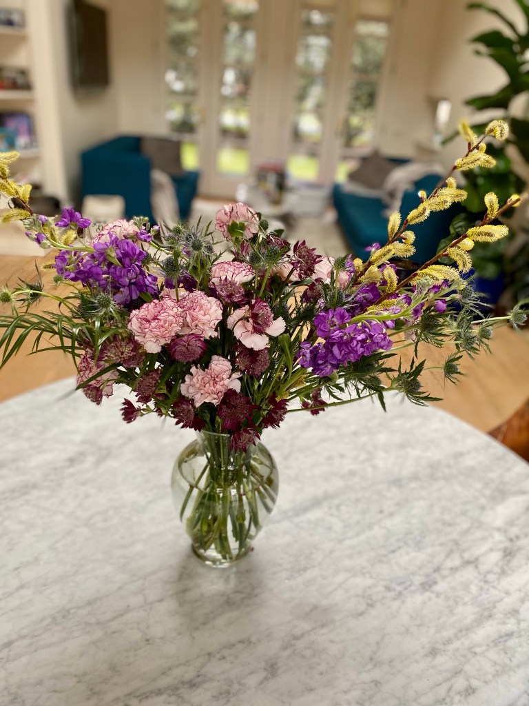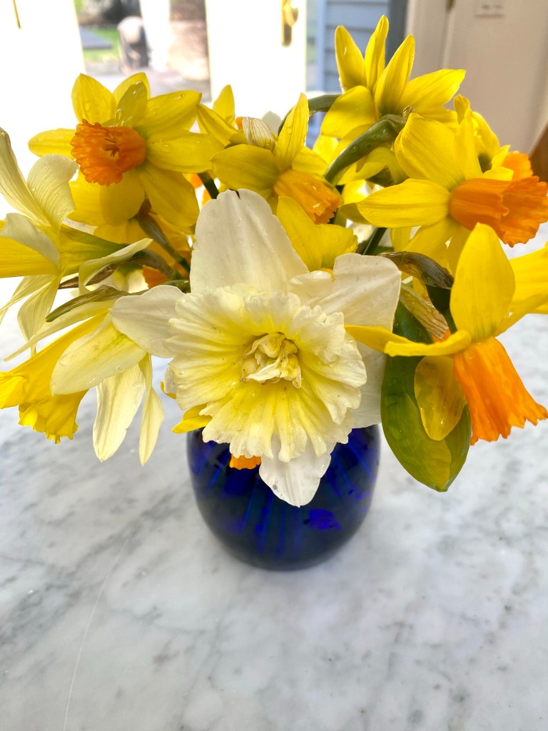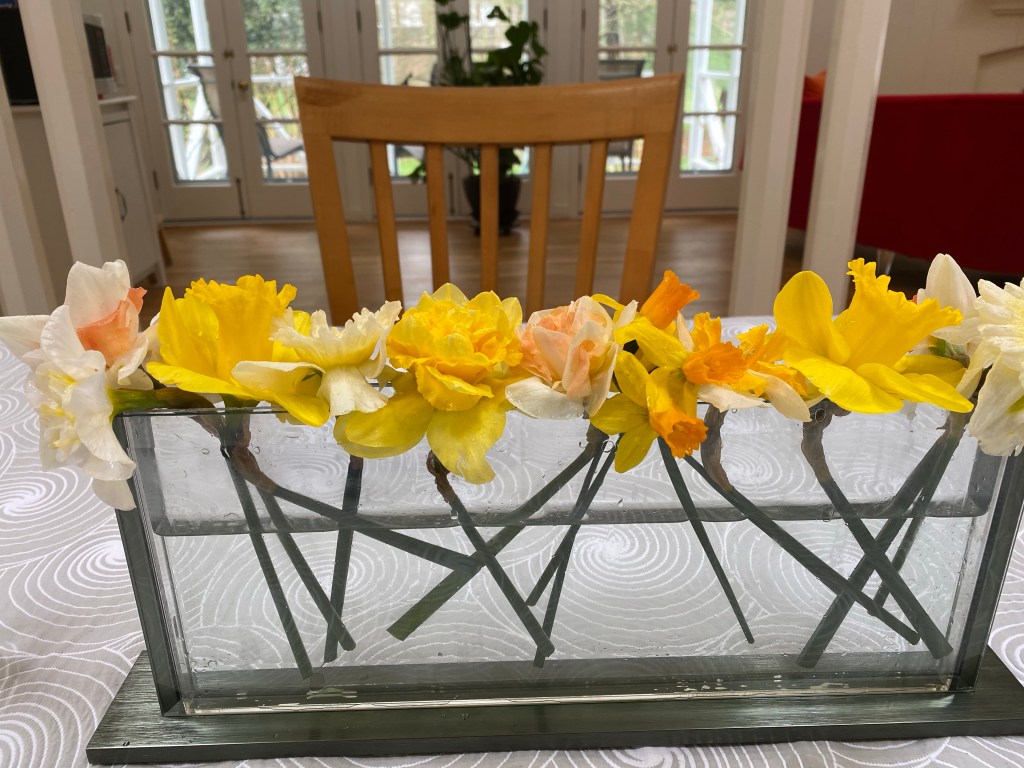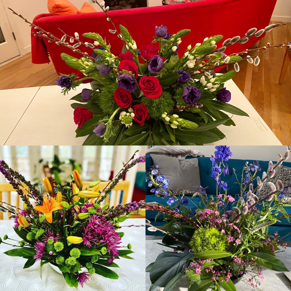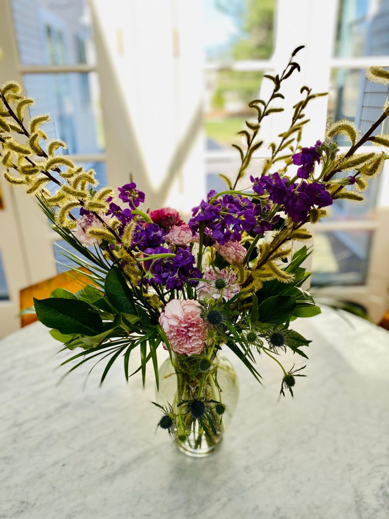 Hellebores, pussywillows, daffodils, crocuses, snow drops, winter aconite, witch hazel are blooming in my yard in March. Floating hellebores/lenten roses in a low dish, bowl or saucer can be magical. I have been arranging flowers for customers during the first three months of the year, that I have purchased and augmented with early spring bloomers, from my yard. St. Patrick day themed birthday celebrations in beer steins, floral crowns and more! I also like to start my front door urns in February through April with a combination of silk flowers, and natural elements like pussywillows and laurel, encircled by a grape vine wreath. Happy to make any of these things to brighten your home!
