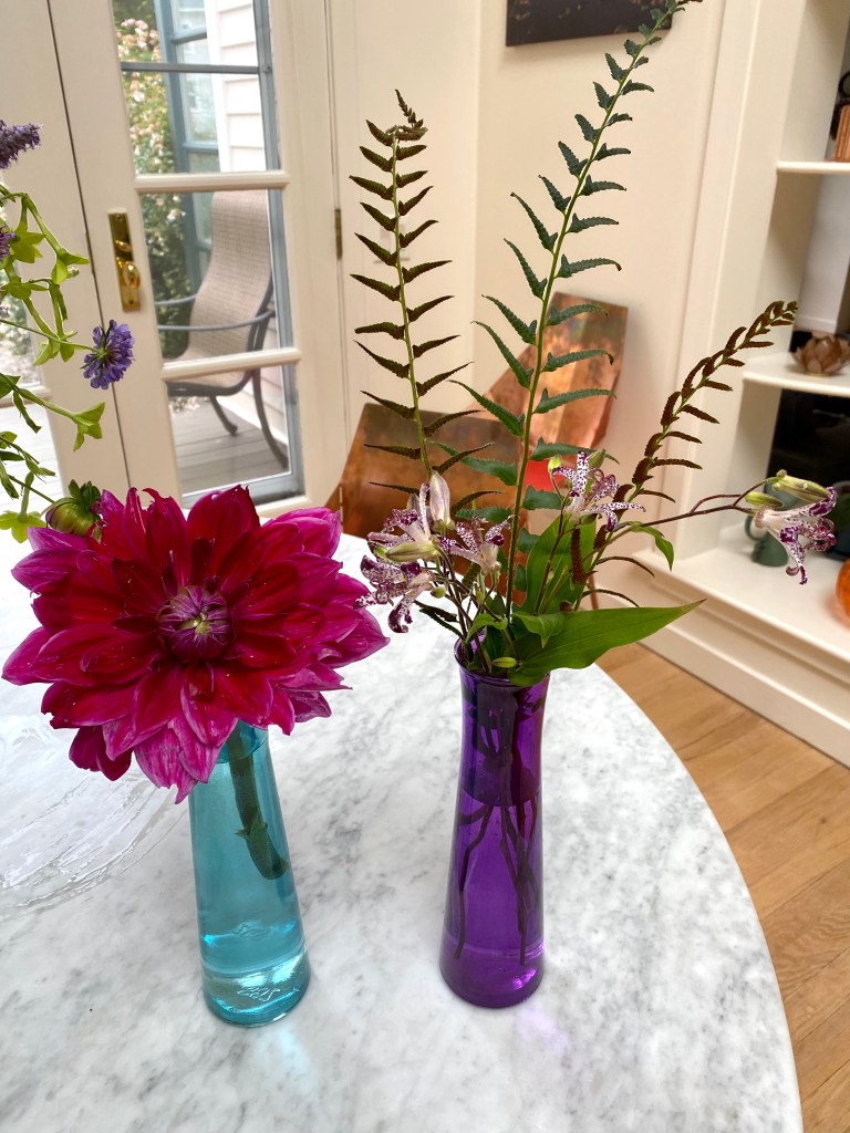 Flowers are available until first frost, which is the first or second week of November. In addition to dahlias which thrive in October temperatures, the garden has echinacea, agastache/hyssop, verbena, fragrant abelia, roses, celosia and soligado that keep on giving, I have magical toad lilies whose flecked flowers match the underside spores of the ferns, late blooming Montauk daises, and have added spoon tipped and Japanese chrysanthemum, October skies asters, temple asters, and limelight hydrangeas, all of which are in their glory in October. Some of my favorite bouquets are these glorious late season flowers in vibrant hues, or muted tones with tall grasses or the rich burgundy tones of oak leaf hydrangea leaves added in. I just added two varieties of St. John’s wort for foliage, flower, and seed head interests.