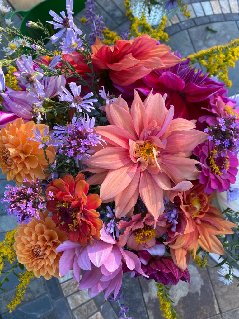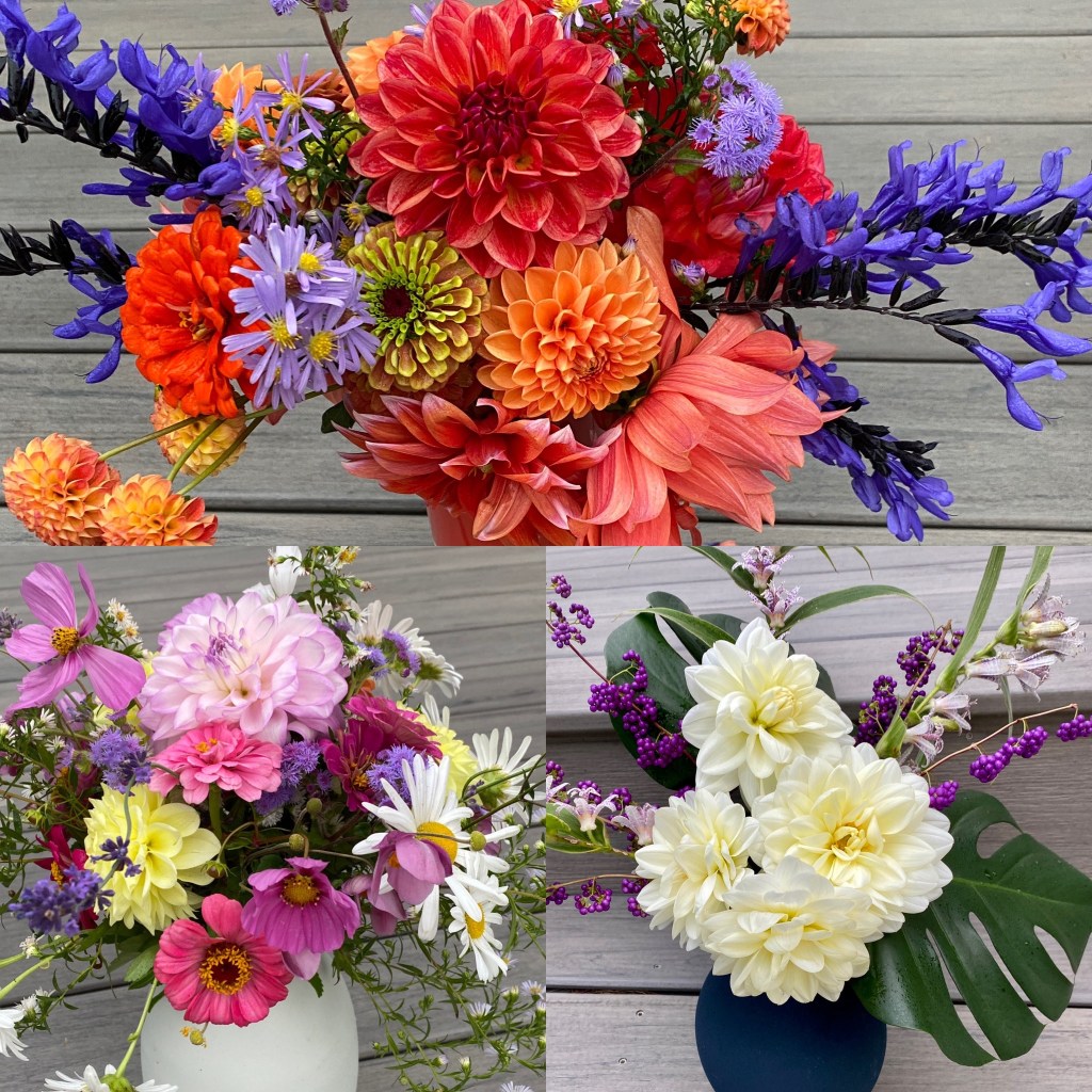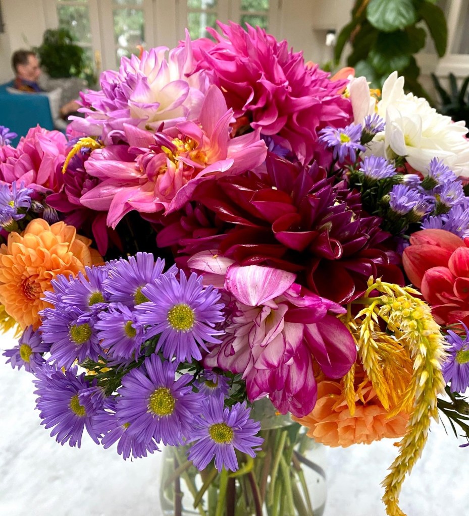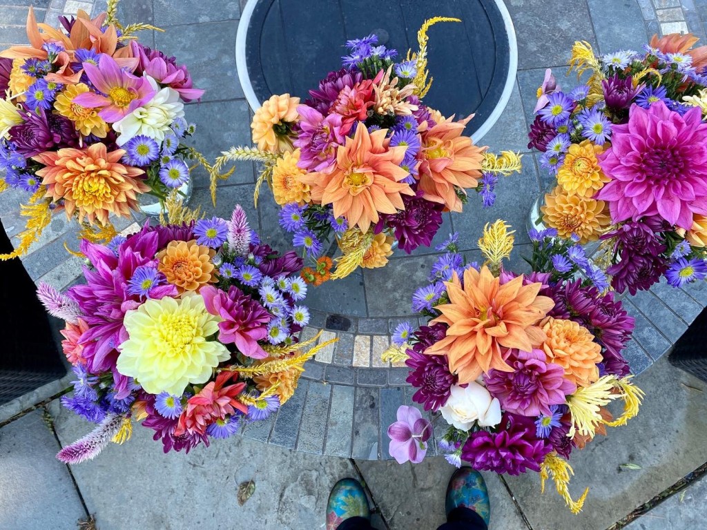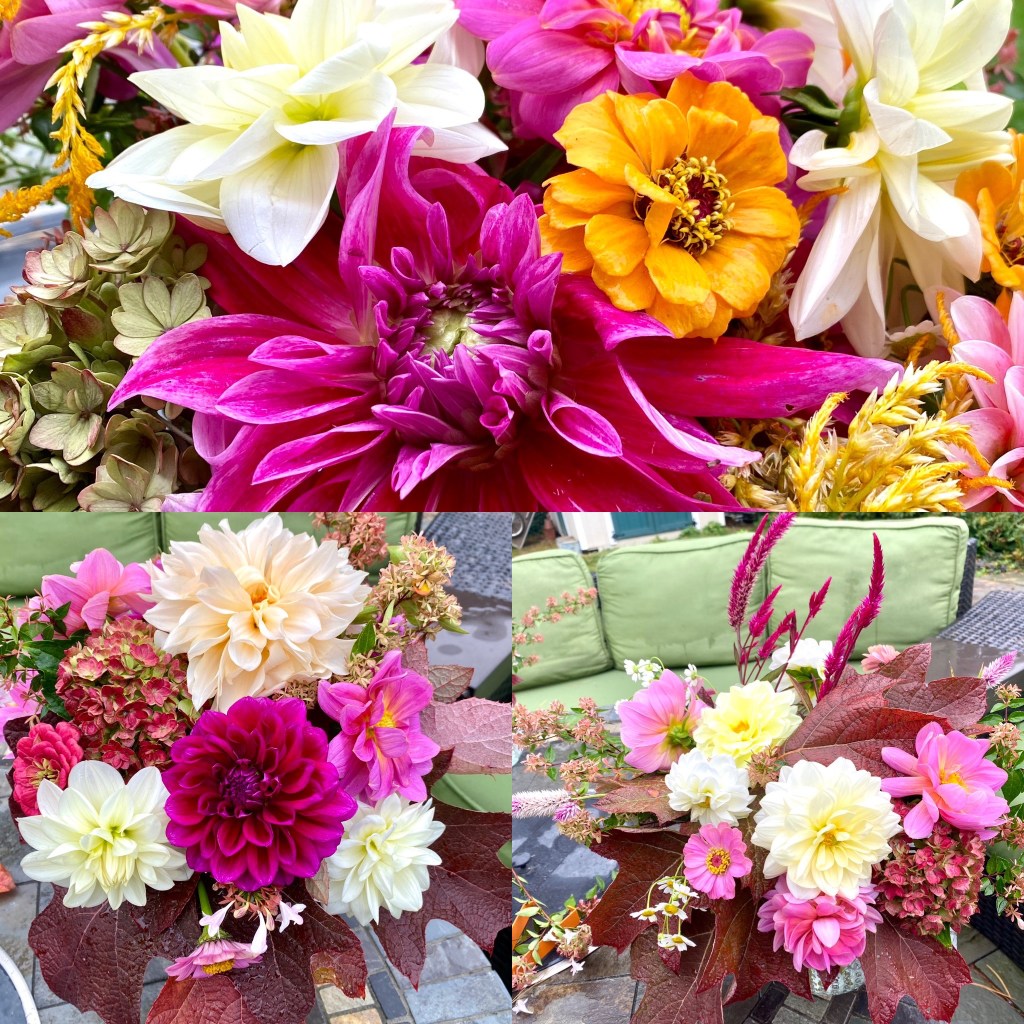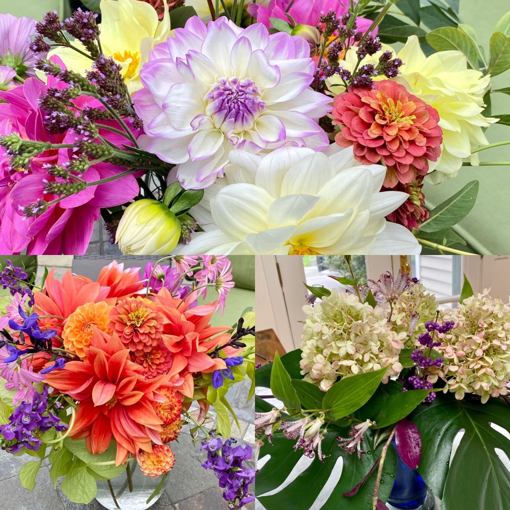 October 18th 4 more gorgeous arrangements featuring the magnificent Dahlias October 112 regular vases, 8 smaller baptismal Celebration flowersMontauk daisies echoed white and yellow with white asters, anemone, lots of dahlias and a few zinniasSimilar to the one above. In love with the penhill watermelon Dahlia.Bridal shower centerpieces Oct 1Pastel request early OctoberThis image and the one below, bridal shower flowers with a statement piece and smaller arrangementsOctober 16-18 beautiesCelebratory flowers for a birthday luncheon, October 2Slapwrist corsage for a teen fall harvest dance in requested orange, blue and yellowMagical DahliasAut5 arrangements to go down a long rectangular table at a restaurant for a mid October birthday celebrationEarly October magicOctober 25th Dahlia magicPeach centerpiece, spoon-tipped chrysanthemum is a perennial that only blooms for a few weeks (an accent flower in each of these bouquets from mid-October). My garden has been designed to have perennials blooming from March through November. It makes every bouquet seasonal to those few weeks, mixed with annual blooms. Mid October centerpieces, with beauty berries soaked in glycerin for 10 days prior, and laurel leaves3 vases October 26 with oak-leaf hydrangeas, fragrant Abelia, dahlias, Celosia, and zinniasFour square vases were placed down a long table on a pink tablecloth to celebrate a 90th birthday, October 23. The coral pink Dahlia with golden highlights is Pennhill watermelon.One regular sized vase of happiness, two small mason jars; a customer is gifting to friends, October 1Two small square vases and two regular to celebrate Jewish holiday, family gatheringsThree gorgeous custom arrangements inspired by a client’s vases. October 6th, with magical monstera leaves and beauty berries on the bottom right.Late bloomer: giggles a collarette dahlia. The garden continues to surprise and delight. In addition to pre-potting Dahlia tubers I had dug up and stored last winter, I mail ordered new tubers varieties that arrived late Spring and had to keep turning over chunks of soil and amending it to get them in the ground. I was also working on several customer landscapes in the spring so the Dahlia picture today was one of the very last to get in the ground and its first bloom is today October 11. Three views of a glorious October 4 bouquetDahlias, Asters, Daisies, Roses…October 1stWeekly pickupCreams (sensational cafe au lait), pinks, and blush roseDahlia magic on October 8Client’s vase and a request for tall flowers is the jumping off point for this tall arrangement of flowering secretia, toad lillies, laurel, dahlias, and anenomeThree more vases of happiness October 3October 10thOctober 26, Oakleaf hydrangeas leaves, Abelia, dahlias, Zinnias and a roseOctober 26 overhead view3 beauties to brighten a home while a gardener mother visits. October 13October 24October 20October 30October 28thNovember 4Front door fall happiness with a twist for a fun customerNeutral tones requestedChampagne themed birthday partyNovember 8Bud Vases1st Communion Bud VasesPeach Spoon-tipped ChrysanthemumFollow me on Instagram at BluebellgardenjoyMonarch in OctoberMontauk DaisiesPerennials for Fall plantingEarly NovemberEarly NovemberEarly NovemberNovember 5