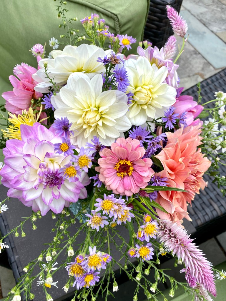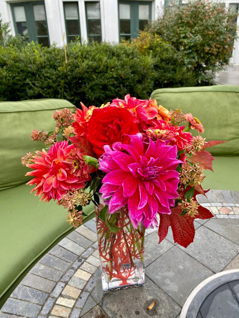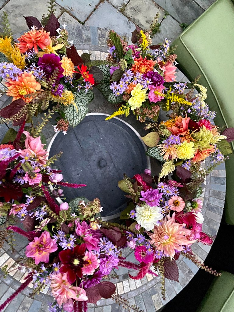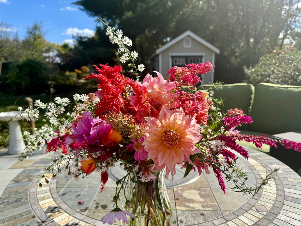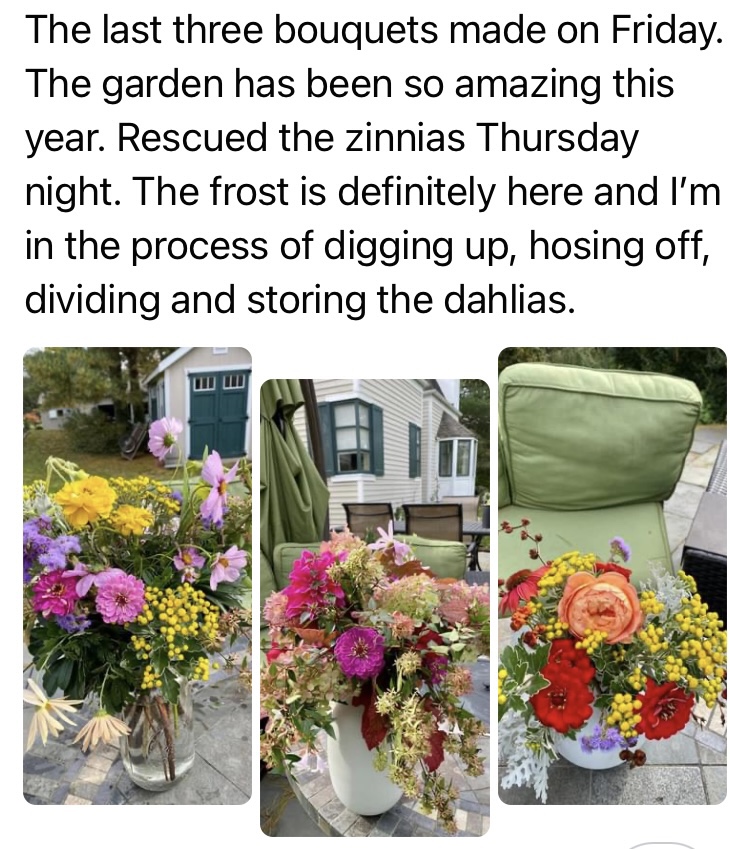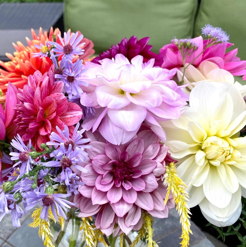 October 18th 4 more gorgeous arrangements featuring the magnificent Dahlias October 112 regular vases, 8 smaller baptismal Celebration flowersMontauk daisies echoed white and yellow with white asters, anemone, lots of dahlias and a few zinniasSimilar to the one above. In love with the penhill watermelon Dahlia.Bridal shower centerpieces Oct 1Pastel request early OctoberThis image and the one below, bridal shower flowers with a statement piece and smaller arrangementsOctober 16-18 beautiesCelebratory flowers for a birthday luncheon, October 2Slapwrist corsage for a teen fall harvest dance in requested orange, blue and yellowMagical DahliasAut5 arrangements to go down a long rectangular table at a restaurant for a mid October birthday celebrationEarly October magicOctober 25th Dahlia magicPeach centerpiece, spoon-tipped chrysanthemum is a perennial that only blooms for a few weeks (an accent flower in each of these bouquets from mid-October). My garden has been designed to have perennials blooming from March through November. It makes every bouquet seasonal to those few weeks, mixed with annual blooms. Mid October centerpieces, with beauty berries soaked in glycerin for 10 days prior, and laurel leaves3 vases October 26 with oak-leaf hydrangeas, fragrant Abelia, dahlias, Celosia, and zinniasFour square vases were placed down a long table on a pink tablecloth to celebrate a 90th birthday, October 23. The coral pink Dahlia with golden highlights is Pennhill watermelon.One regular sized vase of happiness, two small mason jars; a customer is gifting to friends, October 1Two small square vases and two regular to celebrate Jewish holiday, family gatheringsThree gorgeous custom arrangements inspired by a client’s vases. October 6th, with magical monstera leaves and beauty berries on the bottom right.Late bloomer: giggles a collarette dahlia. The garden continues to surprise and delight. In addition to pre-potting Dahlia tubers I had dug up and stored last winter, I mail ordered new tubers varieties that arrived late Spring and had to keep turning over chunks of soil and amending it to get them in the ground. I was also working on several customer landscapes in the spring so the Dahlia picture today was one of the very last to get in the ground and its first bloom is today October 11. Three views of a glorious October 4 bouquetDahlias, Asters, Daisies, Roses…October 1stWeekly pickupCreams (sensational cafe au lait), pinks, and blush roseDahlia magic on October 8Client’s vase and a request for tall flowers is the jumping off point for this tall arrangement of flowering secretia, toad lillies, laurel, dahlias, and anenomeThree more vases of happiness October 3October 10thOctober 26, Oakleaf hydrangeas leaves, Abelia, dahlias, Zinnias and a roseOctober 26 overhead view3 beauties to brighten a home while a gardener mother visits. October 13October 24October 20October 30October 28thNovember 4Front door fall happiness with a twist for a fun customerNeutral tones requestedChampagne themed birthday partyNovember 8Bud Vases1st Communion Bud VasesPeach Spoon-tipped ChrysanthemumFollow me on Instagram at BluebellgardenjoyMonarch in OctoberMontauk DaisiesPerennials for Fall plantingEarly NovemberEarly NovemberEarly NovemberNovember 5