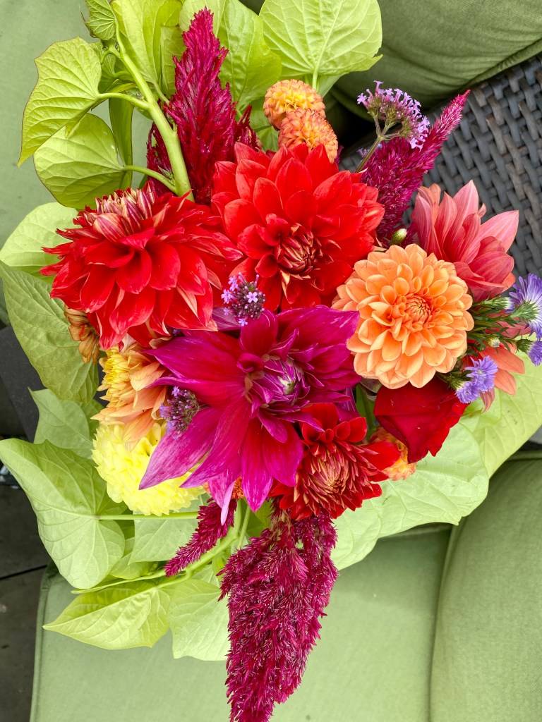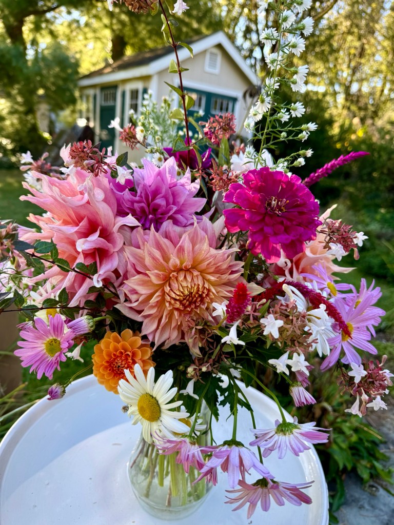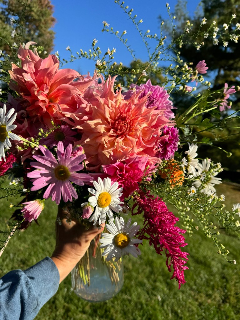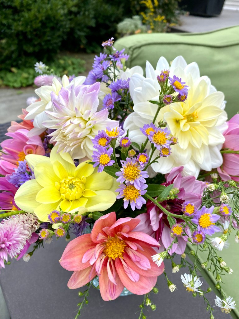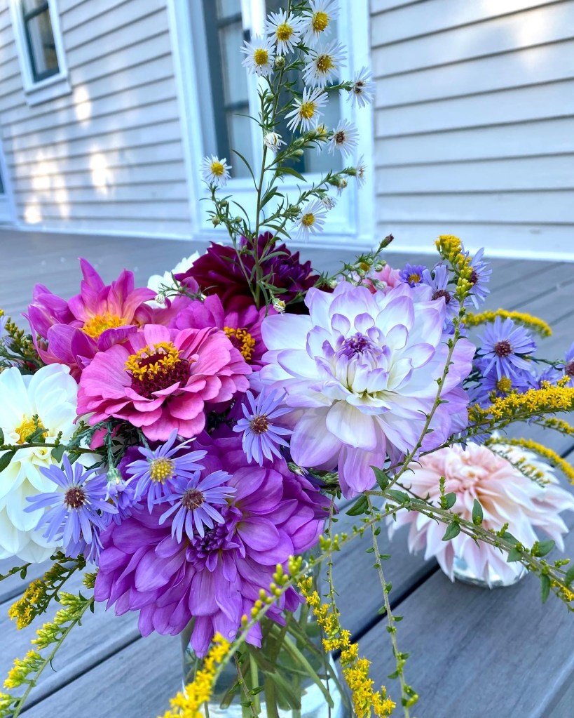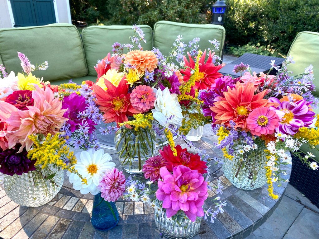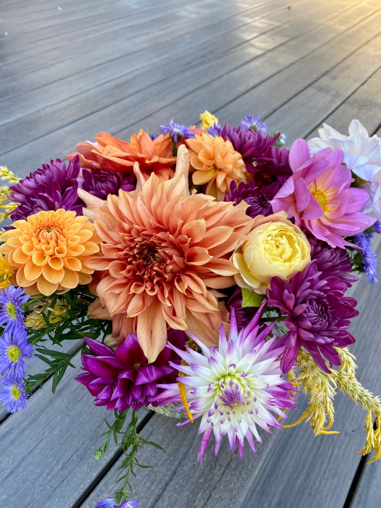October 18th 4 more gorgeous arrangements featuring the magnificent Dahlias October 112 regular vases, 8 smaller baptismal Celebration flowersMontauk daisies echoed white and yellow with white asters, anemone, lots of dahlias and a few zinniasSimilar to the one above. In love with the penhill watermelon Dahlia.Bridal shower centerpieces Oct 1Pastel request early OctoberThis image and the one below, bridal shower flowers with a statement piece and smaller arrangementsOctober 16-18 beautiesCelebratory flowers for a birthday luncheon, October 2Slapwrist corsage for a teen fall harvest dance in requested orange, blue and yellowMagical DahliasAut5 arrangements to go down a long rectangular table at a restaurant for a mid October birthday celebrationEarly October magicOctober 25th Dahlia magicPeach centerpiece, spoon-tipped chrysanthemum is a perennial that only blooms for a few weeks (an accent flower in each of these bouquets from mid-October). My garden has been designed to have perennials blooming from March through November. It makes every bouquet seasonal to those few weeks, mixed with annual blooms. Mid October centerpieces, with beauty berries soaked in glycerin for 10 days prior, and laurel leaves3 vases October 26 with oak-leaf hydrangeas, fragrant Abelia, dahlias, Celosia, and zinniasFour square vases were placed down a long table on a pink tablecloth to celebrate a 90th birthday, October 23. The coral pink Dahlia with golden highlights is Pennhill watermelon.One regular sized vase of happiness, two small mason jars; a customer is gifting to friends, October 1Two small square vases and two regular to celebrate Jewish holiday, family gatheringsThree gorgeous custom arrangements inspired by a client’s vases. October 6th, with magical monstera leaves and beauty berries on the bottom right.Late bloomer: giggles a collarette dahlia. The garden continues to surprise and delight. In addition to pre-potting Dahlia tubers I had dug up and stored last winter, I mail ordered new tubers varieties that arrived late Spring and had to keep turning over chunks of soil and amending it to get them in the ground. I was also working on several customer landscapes in the spring so the Dahlia picture today was one of the very last to get in the ground and its first bloom is today October 11. Three views of a glorious October 4 bouquetDahlias, Asters, Daisies, Roses…October 1stWeekly pickupCreams (sensational cafe au lait), pinks, and blush roseDahlia magic on October 8Client’s vase and a request for tall flowers is the jumping off point for this tall arrangement of flowering secretia, toad lillies, laurel, dahlias, and anenomeThree more vases of happiness October 3October 10thOctober 26, Oakleaf hydrangeas leaves, Abelia, dahlias, Zinnias and a roseOctober 26 overhead view3 beauties to brighten a home while a gardener mother visits. October 13October 24October 20October 30October 28thNovember 4Front door fall happiness with a twist for a fun customerNeutral tones requestedChampagne themed birthday partyNovember 8Bud Vases1st Communion Bud VasesPeach Spoon-tipped ChrysanthemumFollow me on Instagram at BluebellgardenjoyMonarch in OctoberMontauk DaisiesPerennials for Fall plantingEarly NovemberEarly NovemberEarly NovemberNovember 5