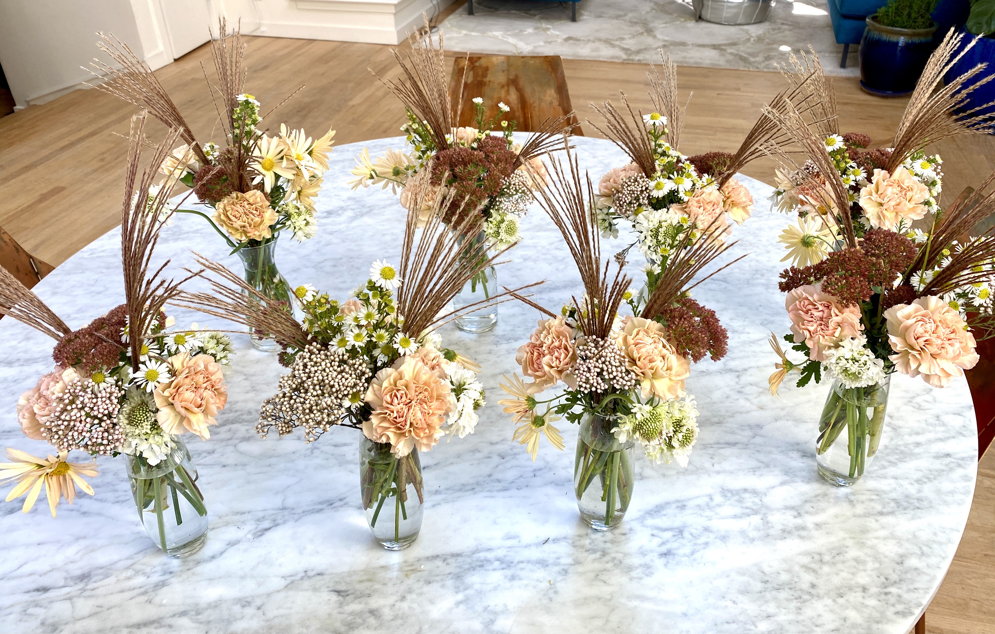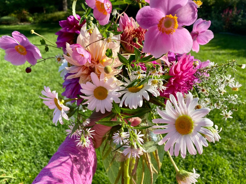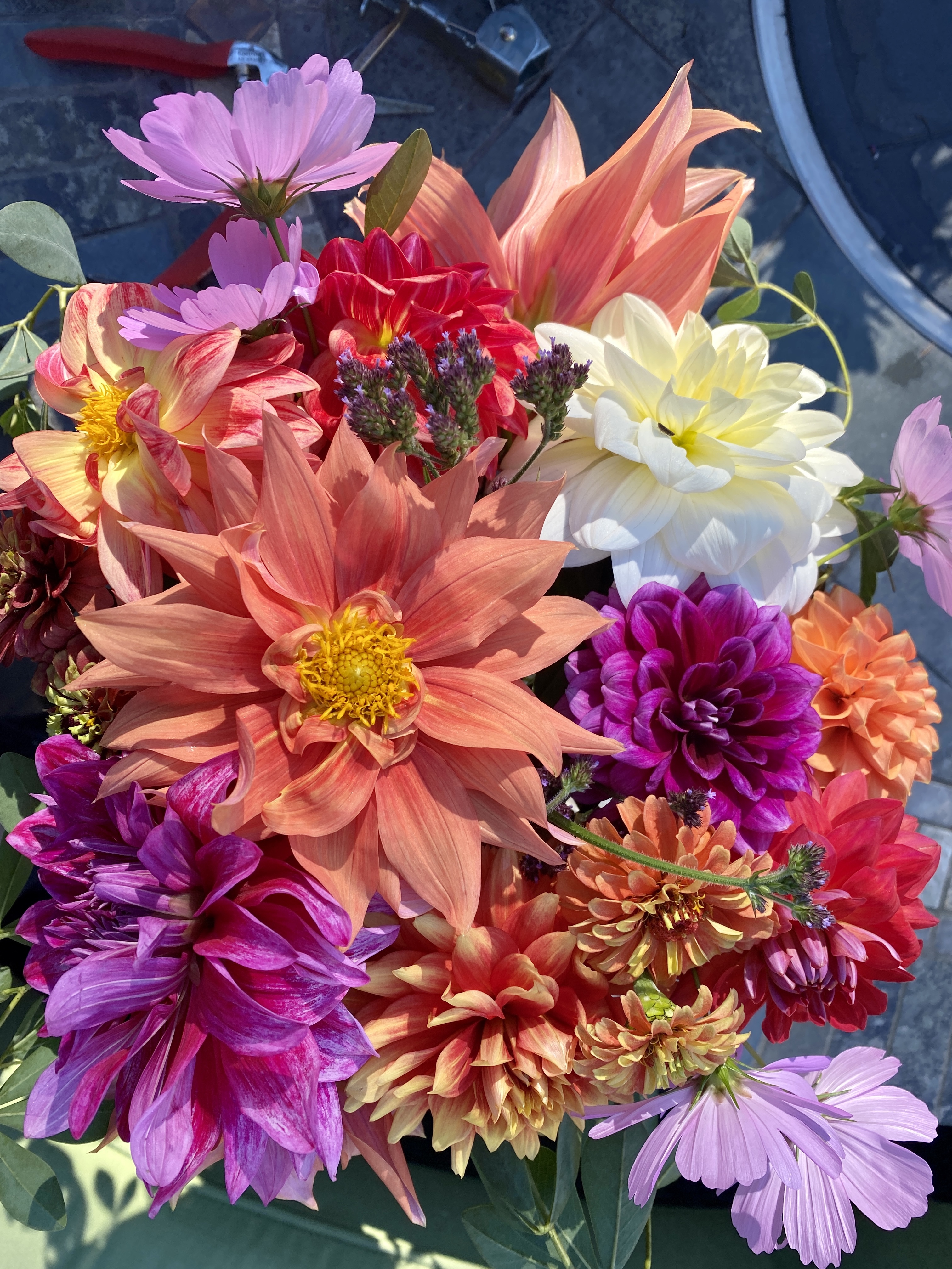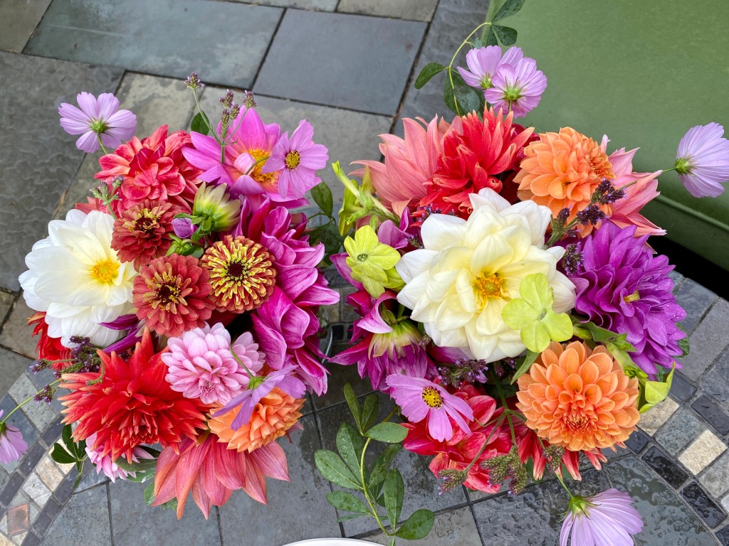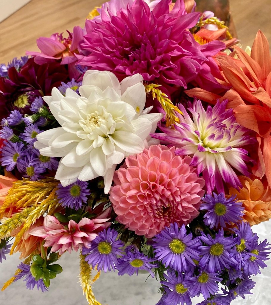 October 18th 4 more gorgeous arrangements featuring the magnificent Dahlias October 112 regular vases, 8 smaller baptismal Celebration flowersMontauk daisies echoed white and yellow with white asters, anemone, lots of dahlias and a few zinniasSimilar to the one above. In love with the penhill watermelon Dahlia.Bridal shower centerpieces Oct 1Pastel request early OctoberThis image and the one below, bridal shower flowers with a statement piece and smaller arrangementsOctober 16-18 beautiesCelebratory flowers for a birthday luncheon, October 2Slapwrist corsage for a teen fall harvest dance in requested orange, blue and yellowMagical DahliasAut5 arrangements to go down a long rectangular table at a restaurant for a mid October birthday celebrationEarly October magicOctober 25th Dahlia magicPeach centerpiece, spoon-tipped chrysanthemum is a perennial that only blooms for a few weeks (an accent flower in each of these bouquets from mid-October). My garden has been designed to have perennials blooming from March through November. It makes every bouquet seasonal to those few weeks, mixed with annual blooms. Mid October centerpieces, with beauty berries soaked in glycerin for 10 days prior, and laurel leaves3 vases October 26 with oak-leaf hydrangeas, fragrant Abelia, dahlias, Celosia, and zinniasFour square vases were placed down a long table on a pink tablecloth to celebrate a 90th birthday, October 23. The coral pink Dahlia with golden highlights is Pennhill watermelon.One regular sized vase of happiness, two small mason jars; a customer is gifting to friends, October 1Two small square vases and two regular to celebrate Jewish holiday, family gatheringsThree gorgeous custom arrangements inspired by a client’s vases. October 6th, with magical monstera leaves and beauty berries on the bottom right.Late bloomer: giggles a collarette dahlia. The garden continues to surprise and delight. In addition to pre-potting Dahlia tubers I had dug up and stored last winter, I mail ordered new tubers varieties that arrived late Spring and had to keep turning over chunks of soil and amending it to get them in the ground. I was also working on several customer landscapes in the spring so the Dahlia picture today was one of the very last to get in the ground and its first bloom is today October 11. Three views of a glorious October 4 bouquetDahlias, Asters, Daisies, Roses…October 1stWeekly pickupCreams (sensational cafe au lait), pinks, and blush roseDahlia magic on October 8Client’s vase and a request for tall flowers is the jumping off point for this tall arrangement of flowering secretia, toad lillies, laurel, dahlias, and anenomeThree more vases of happiness October 3October 10thOctober 26, Oakleaf hydrangeas leaves, Abelia, dahlias, Zinnias and a roseOctober 26 overhead view3 beauties to brighten a home while a gardener mother visits. October 13October 24October 20October 30October 28thNovember 4Front door fall happiness with a twist for a fun customerNeutral tones requestedChampagne themed birthday partyNovember 8Bud Vases1st Communion Bud VasesPeach Spoon-tipped ChrysanthemumFollow me on Instagram at BluebellgardenjoyMonarch in OctoberMontauk DaisiesPerennials for Fall plantingEarly NovemberEarly NovemberEarly NovemberNovember 5