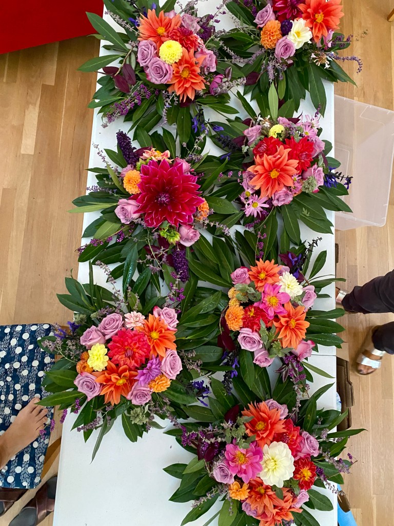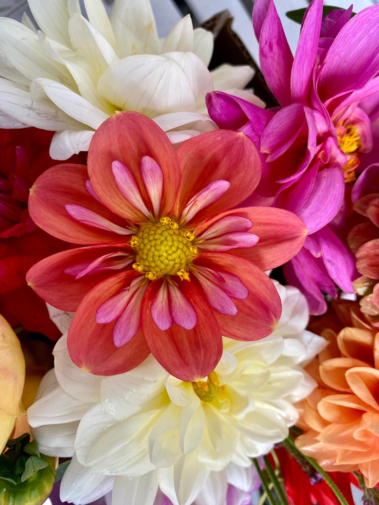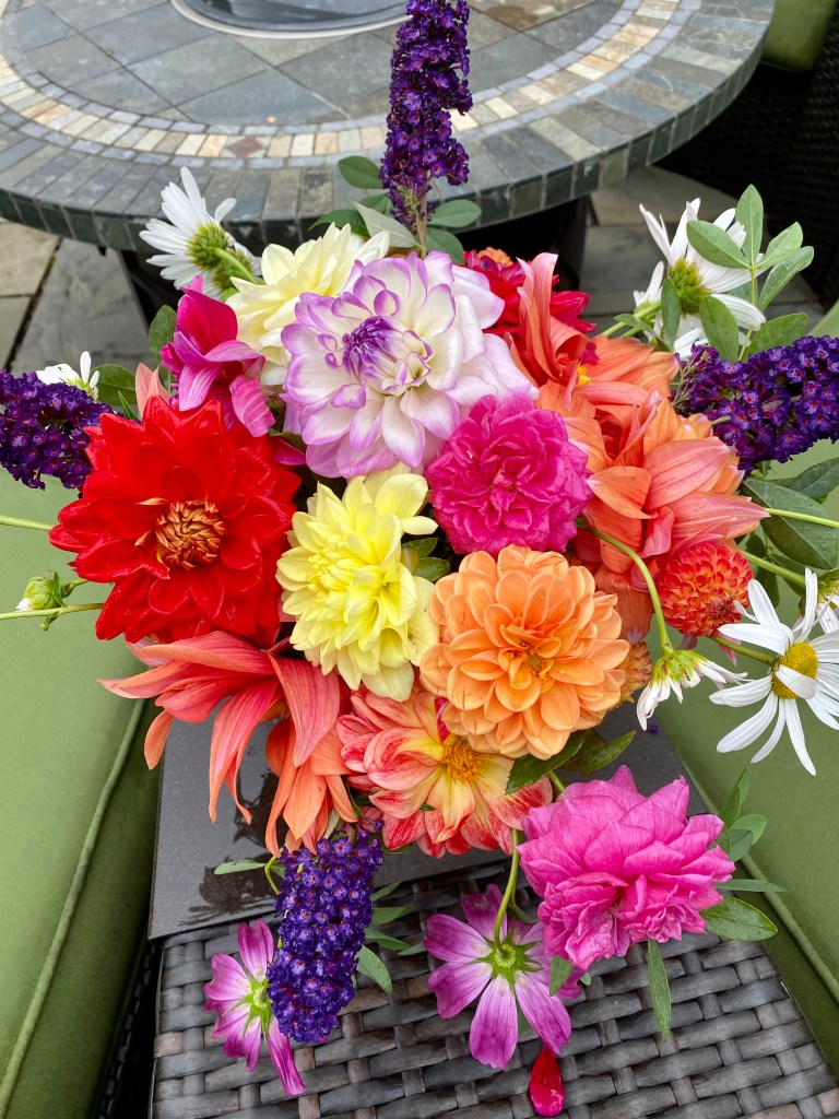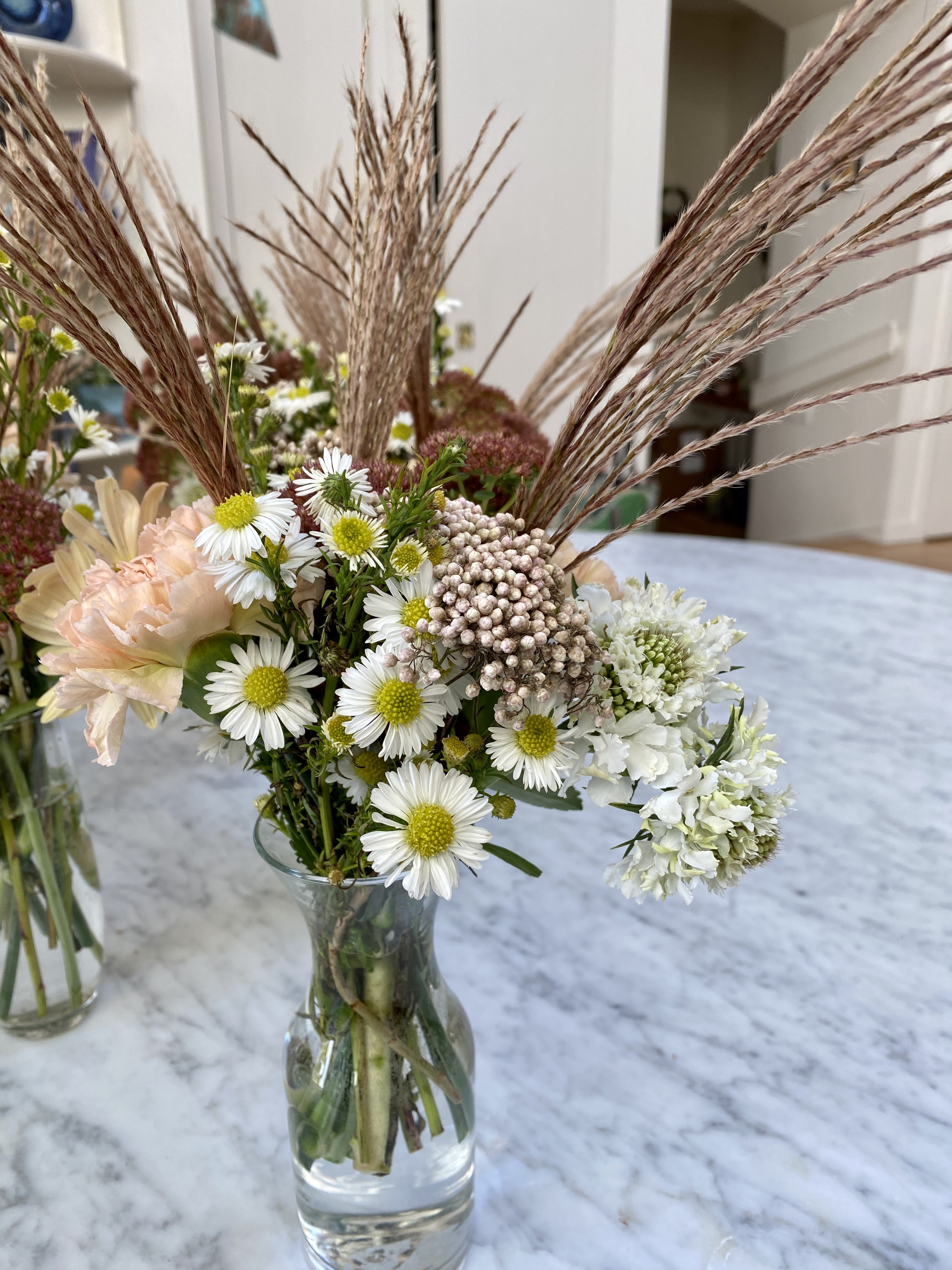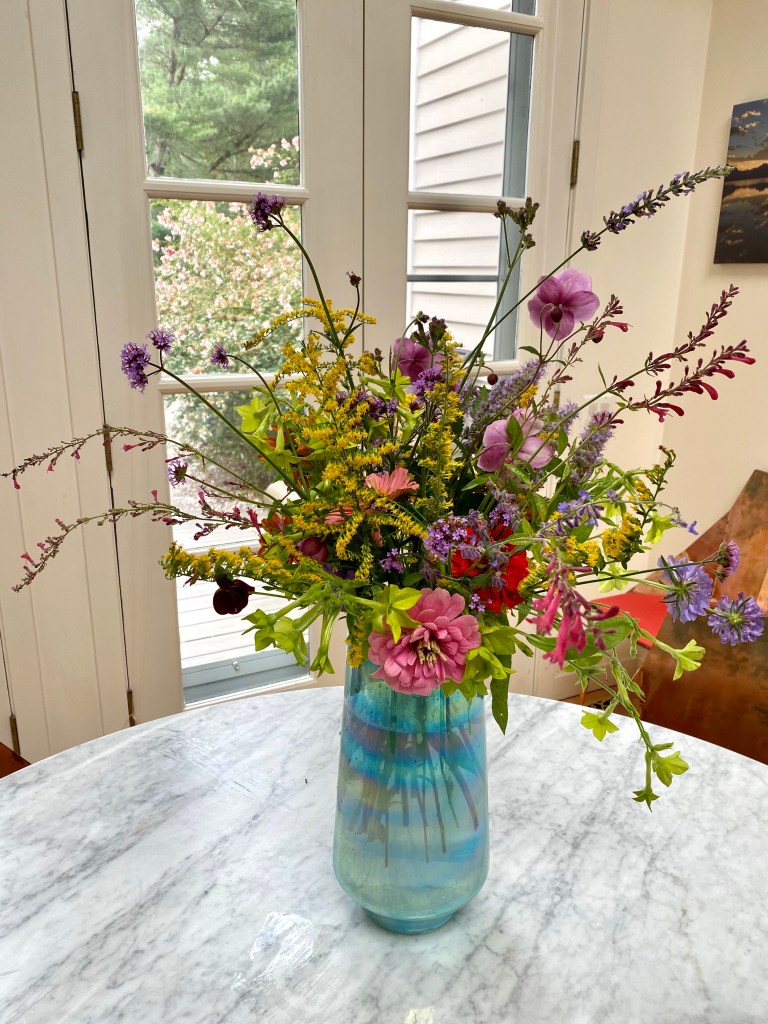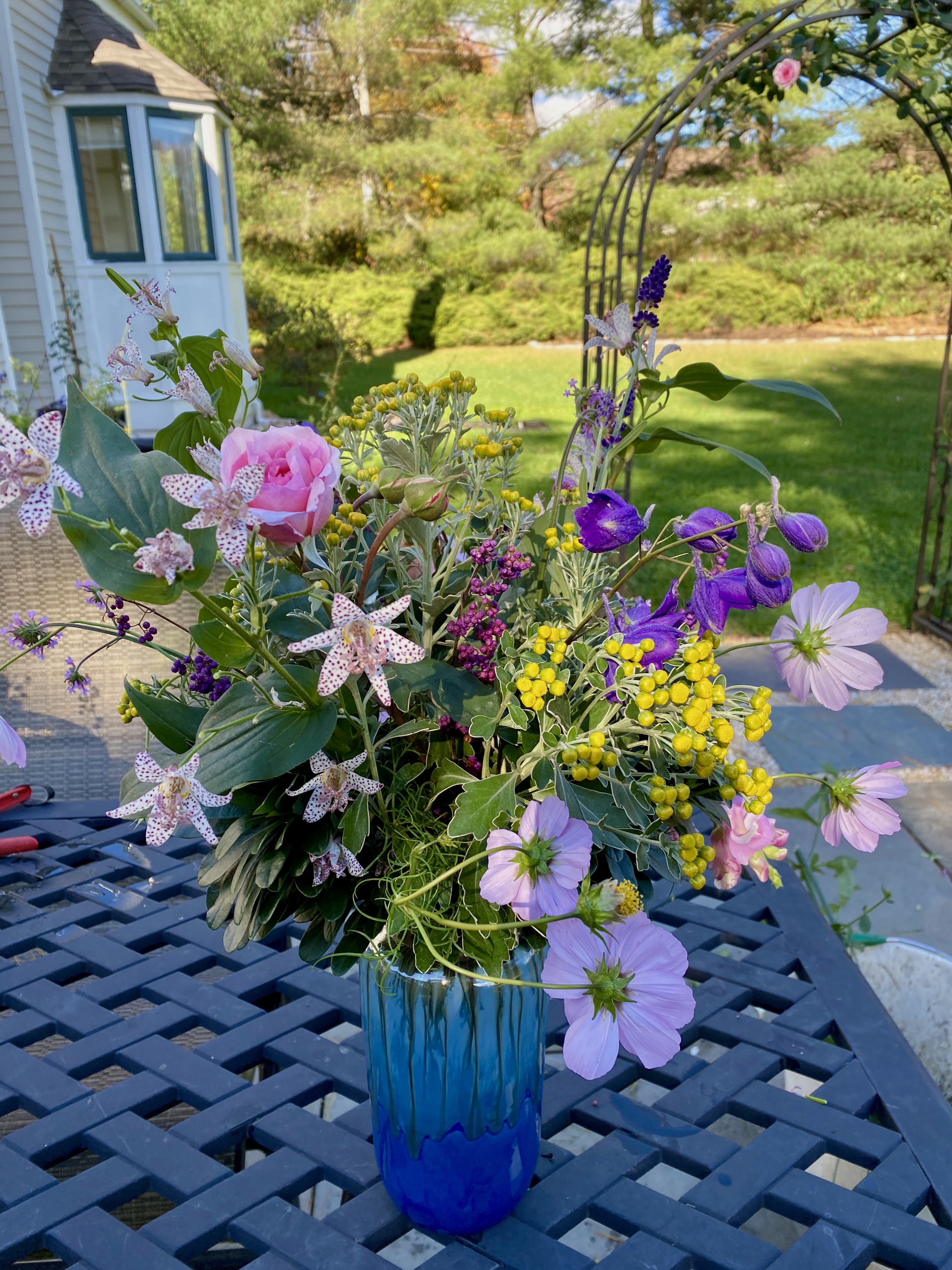 October 18th 4 more gorgeous arrangements featuring the magnificent Dahlias October 112 regular vases, 8 smaller baptismal Celebration flowersMontauk daisies echoed white and yellow with white asters, anemone, lots of dahlias and a few zinniasSimilar to the one above. In love with the penhill watermelon Dahlia.Bridal shower centerpieces Oct 1Pastel request early OctoberThis image and the one below, bridal shower flowers with a statement piece and smaller arrangementsOctober 16-18 beautiesCelebratory flowers for a birthday luncheon, October 2Slapwrist corsage for a teen fall harvest dance in requested orange, blue and yellowMagical DahliasAut5 arrangements to go down a long rectangular table at a restaurant for a mid October birthday celebrationEarly October magicOctober 25th Dahlia magicPeach centerpiece, spoon-tipped chrysanthemum is a perennial that only blooms for a few weeks (an accent flower in each of these bouquets from mid-October). My garden has been designed to have perennials blooming from March through November. It makes every bouquet seasonal to those few weeks, mixed with annual blooms. Mid October centerpieces, with beauty berries soaked in glycerin for 10 days prior, and laurel leaves3 vases October 26 with oak-leaf hydrangeas, fragrant Abelia, dahlias, Celosia, and zinniasFour square vases were placed down a long table on a pink tablecloth to celebrate a 90th birthday, October 23. The coral pink Dahlia with golden highlights is Pennhill watermelon.One regular sized vase of happiness, two small mason jars; a customer is gifting to friends, October 1Two small square vases and two regular to celebrate Jewish holiday, family gatheringsThree gorgeous custom arrangements inspired by a client’s vases. October 6th, with magical monstera leaves and beauty berries on the bottom right.Late bloomer: giggles a collarette dahlia. The garden continues to surprise and delight. In addition to pre-potting Dahlia tubers I had dug up and stored last winter, I mail ordered new tubers varieties that arrived late Spring and had to keep turning over chunks of soil and amending it to get them in the ground. I was also working on several customer landscapes in the spring so the Dahlia picture today was one of the very last to get in the ground and its first bloom is today October 11. Three views of a glorious October 4 bouquetDahlias, Asters, Daisies, Roses…October 1stWeekly pickupCreams (sensational cafe au lait), pinks, and blush roseDahlia magic on October 8Client’s vase and a request for tall flowers is the jumping off point for this tall arrangement of flowering secretia, toad lillies, laurel, dahlias, and anenomeThree more vases of happiness October 3October 10thOctober 26, Oakleaf hydrangeas leaves, Abelia, dahlias, Zinnias and a roseOctober 26 overhead view3 beauties to brighten a home while a gardener mother visits. October 13October 24October 20October 30October 28thNovember 4Front door fall happiness with a twist for a fun customerNeutral tones requestedChampagne themed birthday partyNovember 8Bud Vases1st Communion Bud VasesPeach Spoon-tipped ChrysanthemumFollow me on Instagram at BluebellgardenjoyMonarch in OctoberMontauk DaisiesPerennials for Fall plantingEarly NovemberEarly NovemberEarly NovemberNovember 5