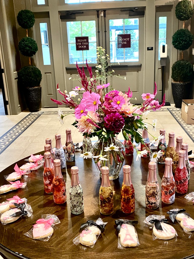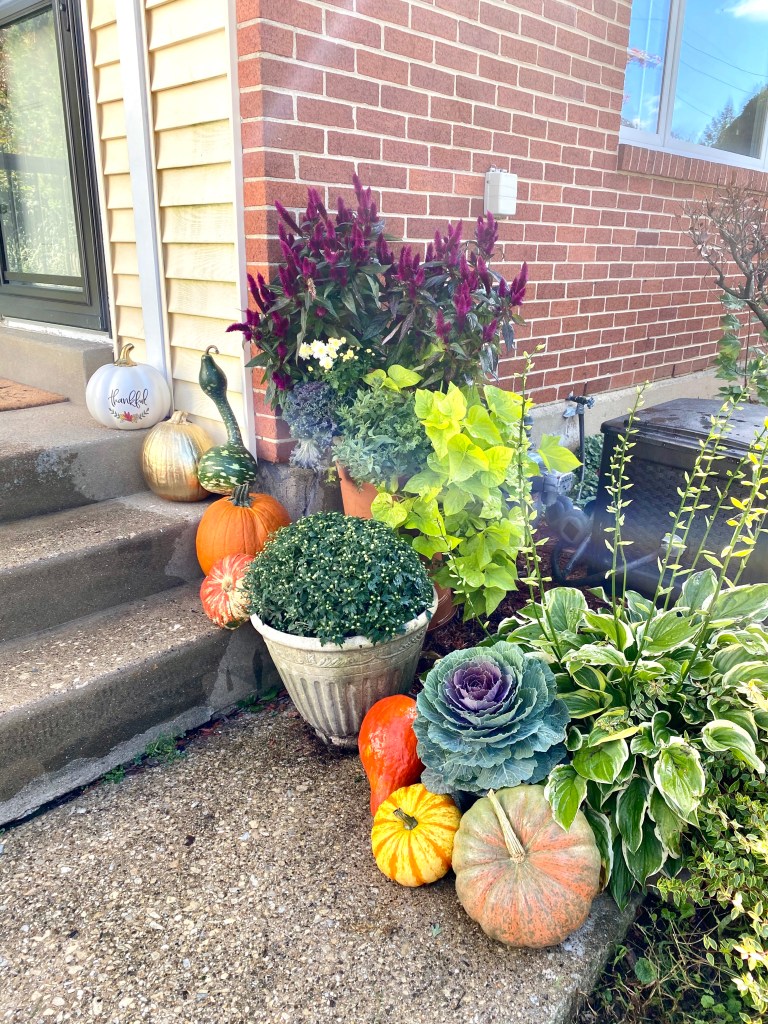 I also have created some whimsical front door fall festiveness, with a mixture of glass and real gourds and cold hardy plants. Bud vases brightened a first communion party. And it is quite a trick to not have the deer devour my hostas by October. These are things I help people with as a garden coach.