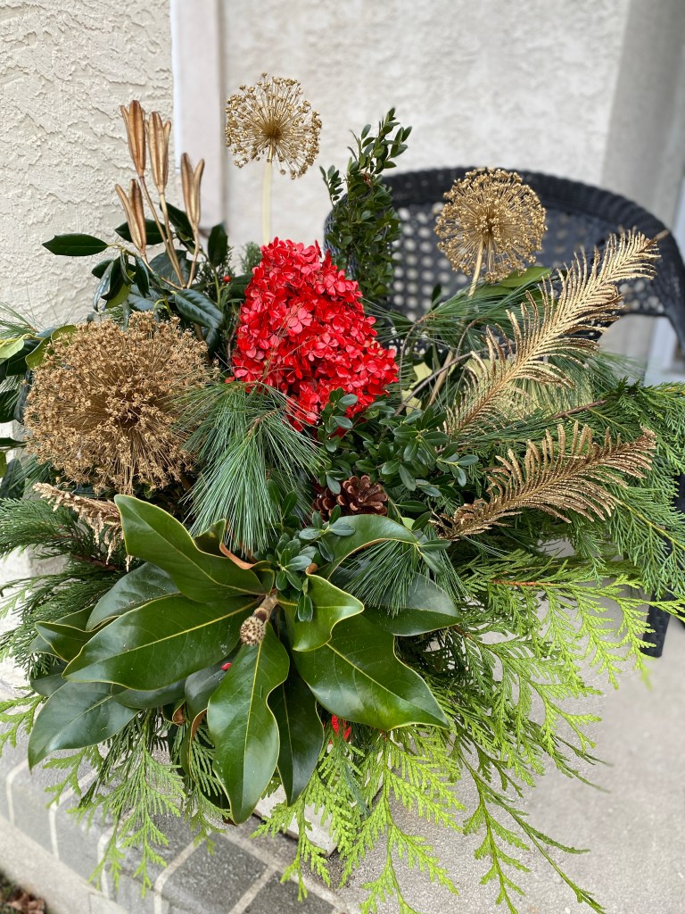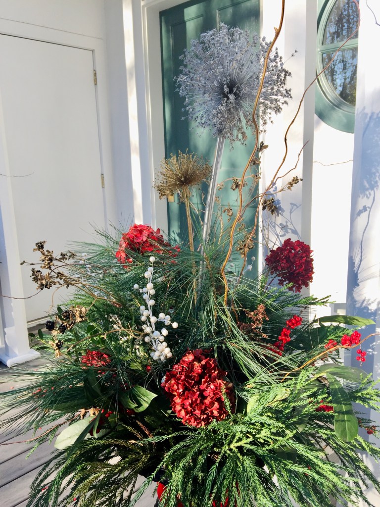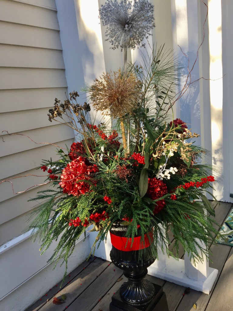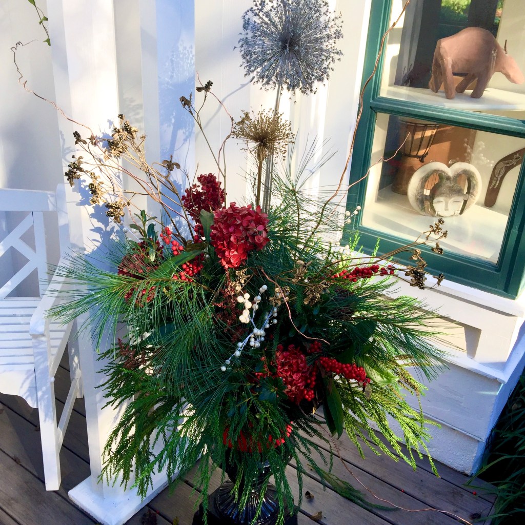 Let me design a spectacular, unique, and long lasting outdoor winter-themed planter for you. I use seven types of evergreens from my yard, dried and spray painted allium, hydrangeas, curly willow, and ribbon, starting at $50.