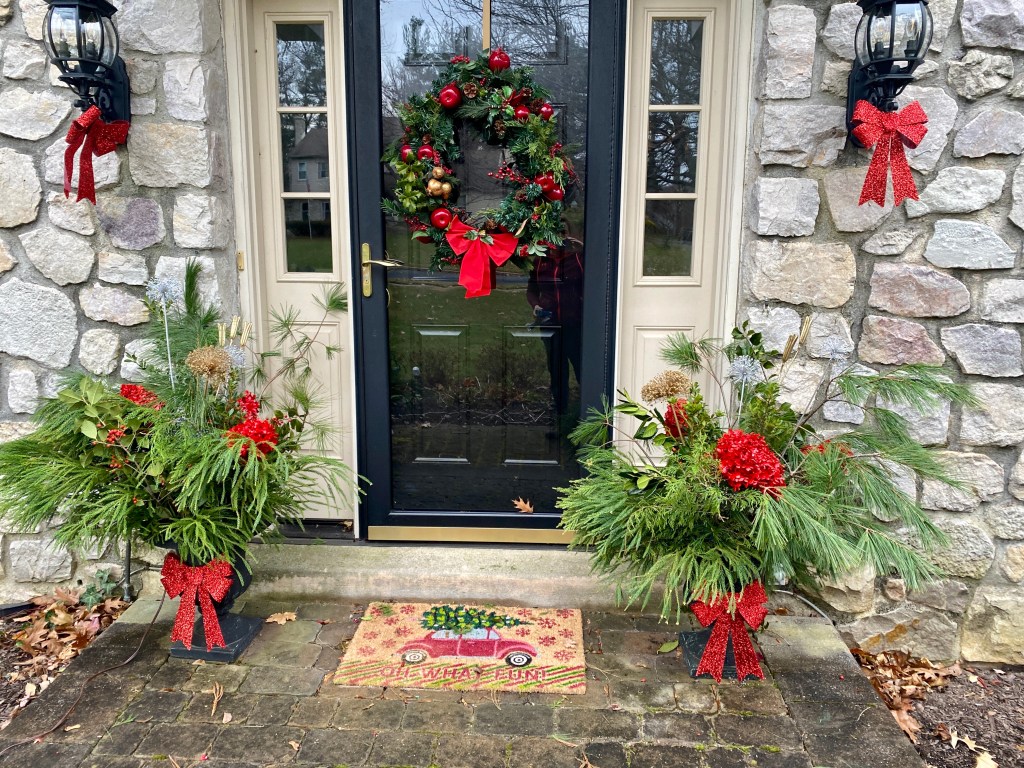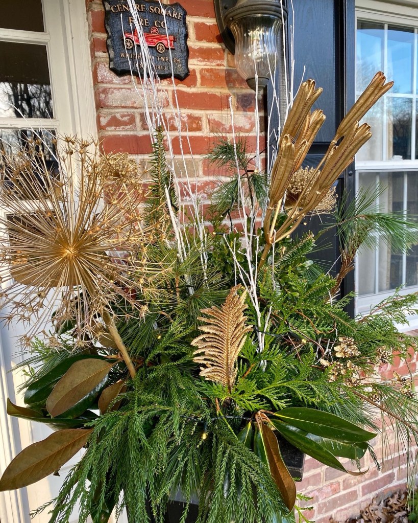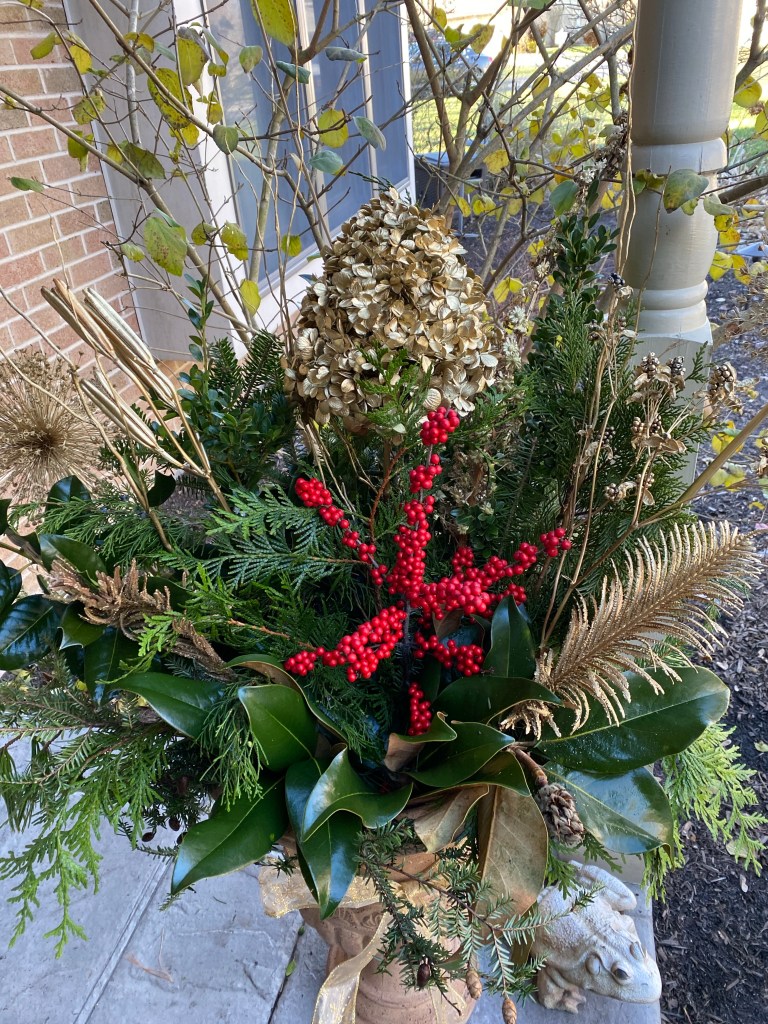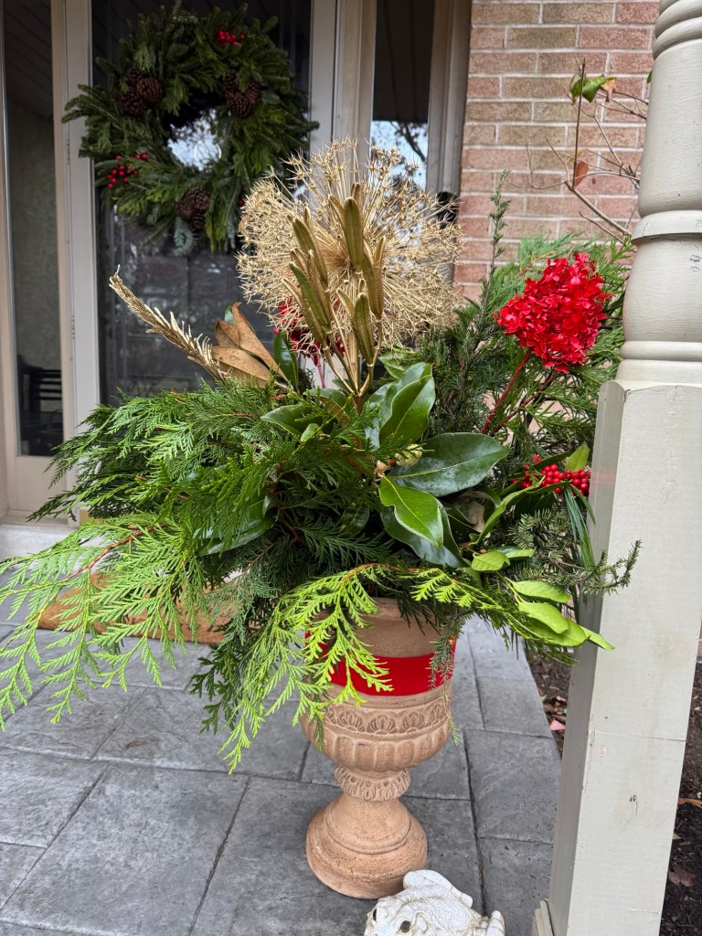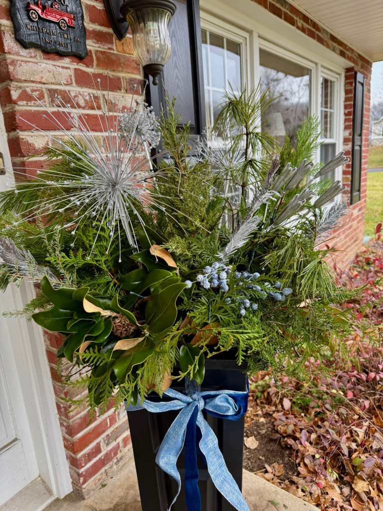 Let me design a spectacular, unique, and long lasting outdoor winter-themed planter for you. I use seven types of evergreens from my yard, dried and spray painted allium, hydrangeas, curly willow, and ribbon, starting at $50.