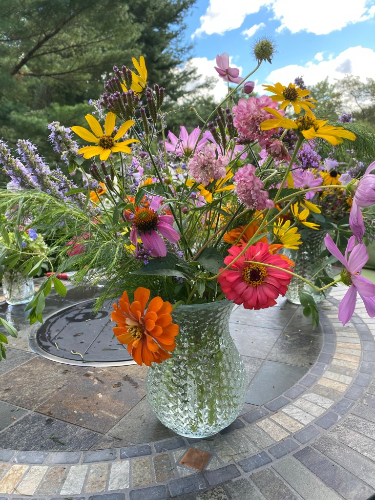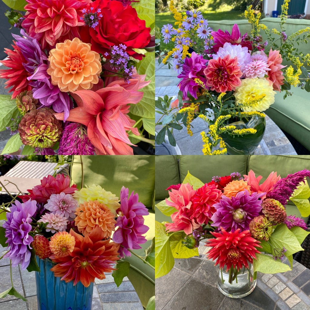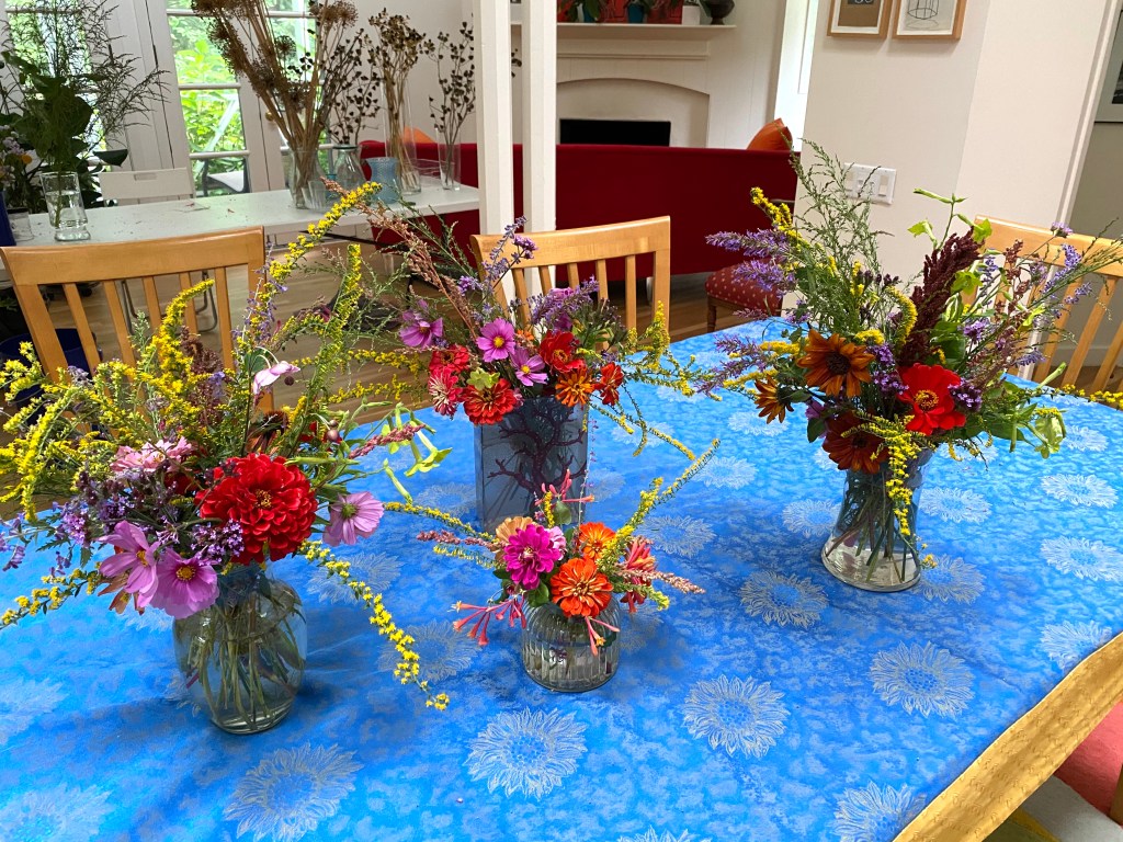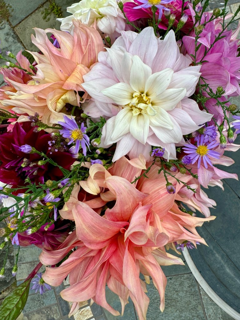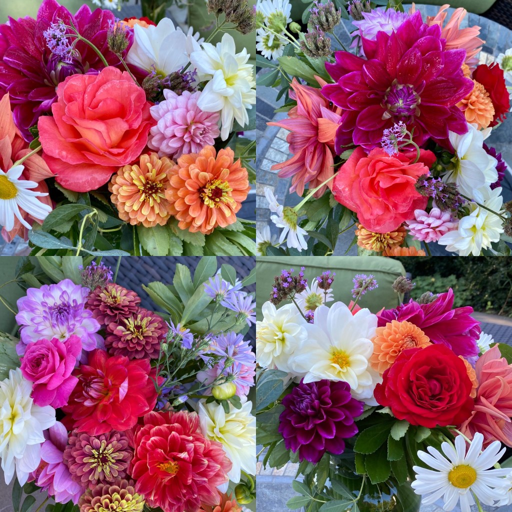 Floaty white woodland asters start blooming the end of SeptemberFour views of one bouquetSept 26 & 27th. Weekly flower pick ups and one celebratory individual pick upEarly September Dahlia Subscription pick upsSeptember 20-24 dahlia joy and so much moreAll the pinks in the garden, as requested by a client as a gift to the new mother of a baby girlMid-September Dahlia happinessPerennial Ast and blue mist flowers mixed in with Glorious, Dahlias and ZinniasSeptember 17-20Joyful Batmitvah flowers. Square clear vases wrapped with hosta leaves. “the flowers you did for Lauren were absolutely amazing! People were talking about them!!!! 🌸. And she got to use them again at night.”September 14 Weekly flower subscription pick up in two palettes.These flowers are all arranged in the beautiful vases of a beloved mother and grandmother and used at her memorial and then given to friends and family to keep. September 10.Last day of September includes Montauk Daisy joy, lots of dahlias and incredible roses.For the Powder RoomWater Lily DahliasJapanese AnenomeSoligado Late September