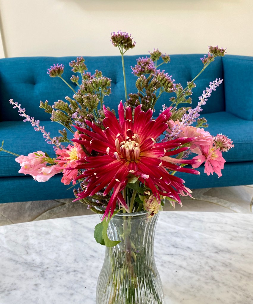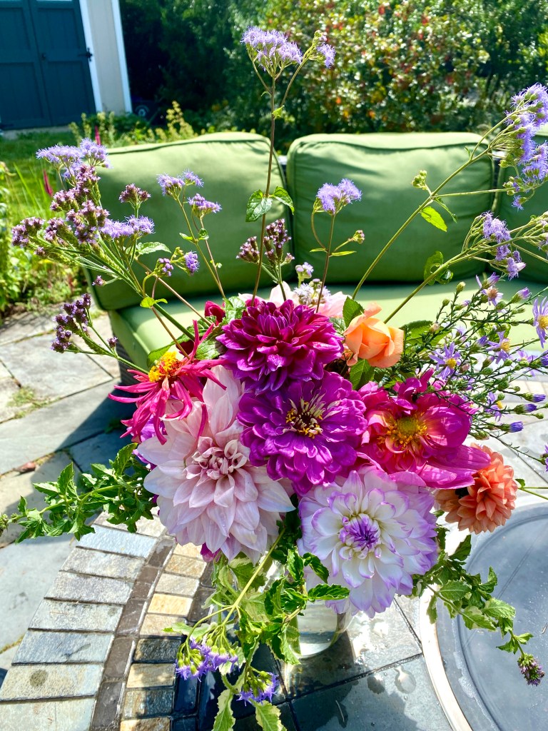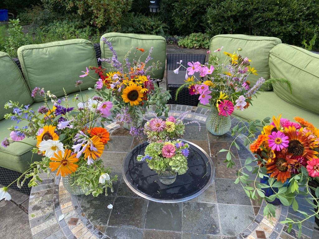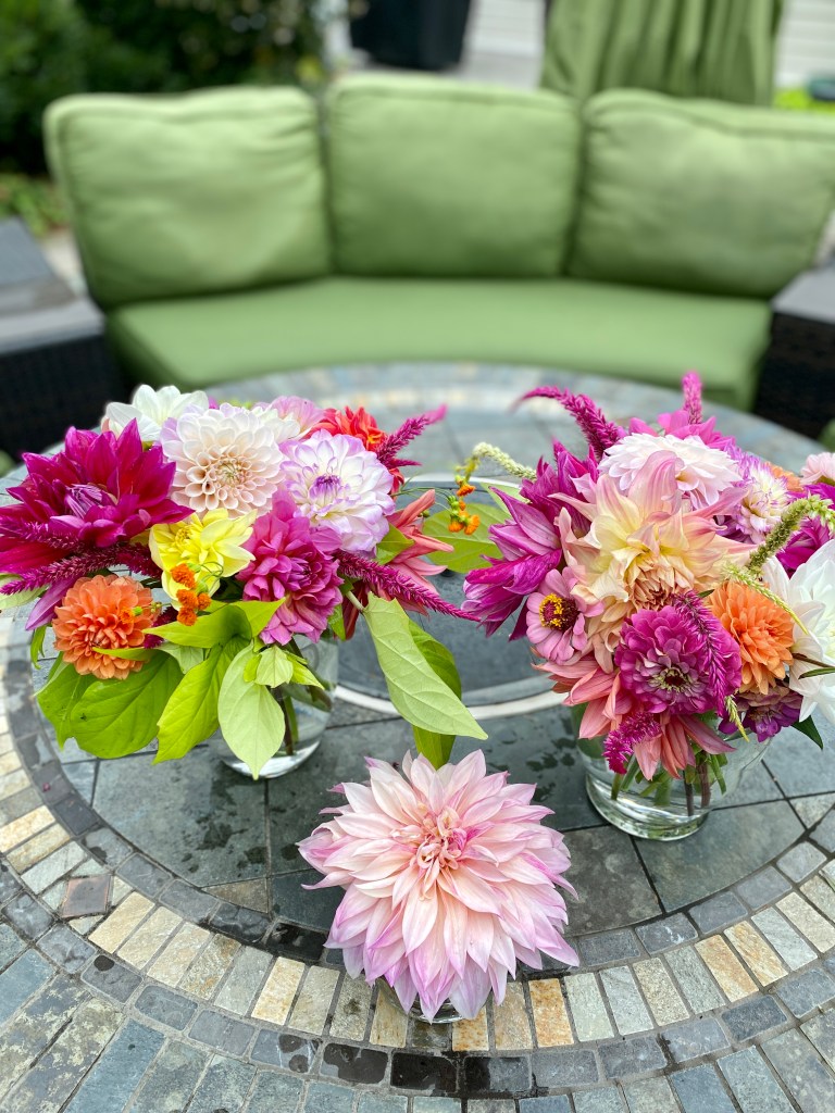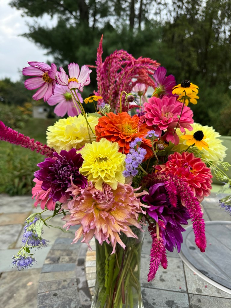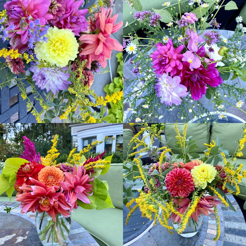 Floaty white woodland asters start blooming the end of SeptemberFour views of one bouquetSept 26 & 27th. Weekly flower pick ups and one celebratory individual pick upEarly September Dahlia Subscription pick upsSeptember 20-24 dahlia joy and so much moreAll the pinks in the garden, as requested by a client as a gift to the new mother of a baby girlMid-September Dahlia happinessPerennial Ast and blue mist flowers mixed in with Glorious, Dahlias and ZinniasSeptember 17-20Joyful Batmitvah flowers. Square clear vases wrapped with hosta leaves. “the flowers you did for Lauren were absolutely amazing! People were talking about them!!!! 🌸. And she got to use them again at night.”September 14 Weekly flower subscription pick up in two palettes.These flowers are all arranged in the beautiful vases of a beloved mother and grandmother and used at her memorial and then given to friends and family to keep. September 10.Last day of September includes Montauk Daisy joy, lots of dahlias and incredible roses.For the Powder RoomWater Lily DahliasJapanese AnenomeSoligado Late September