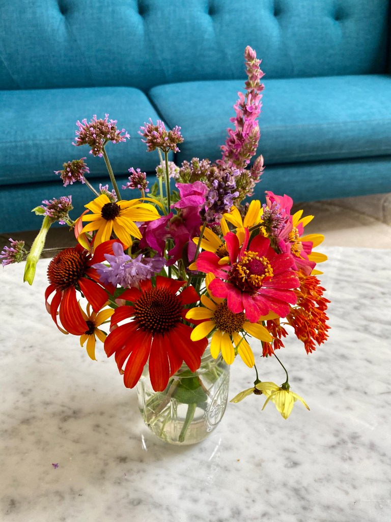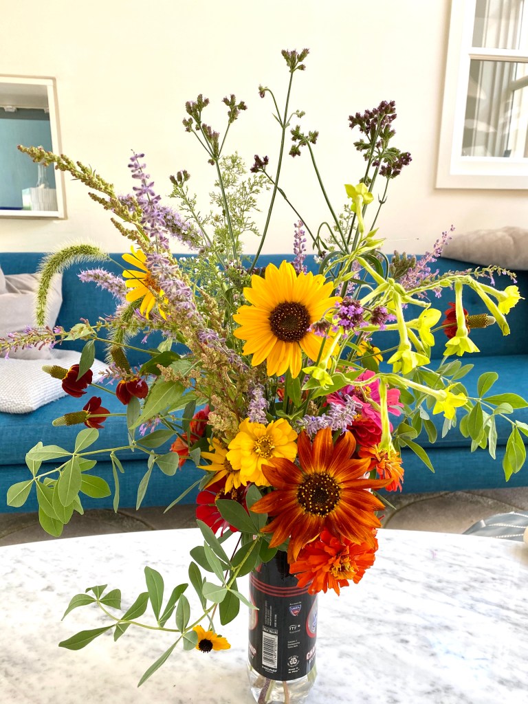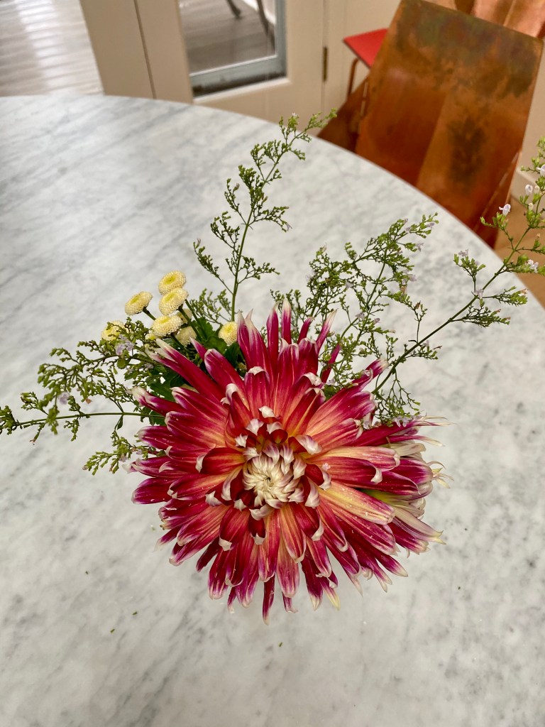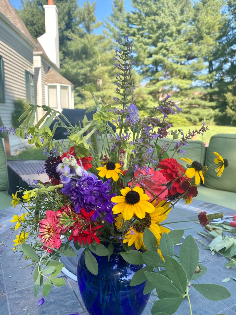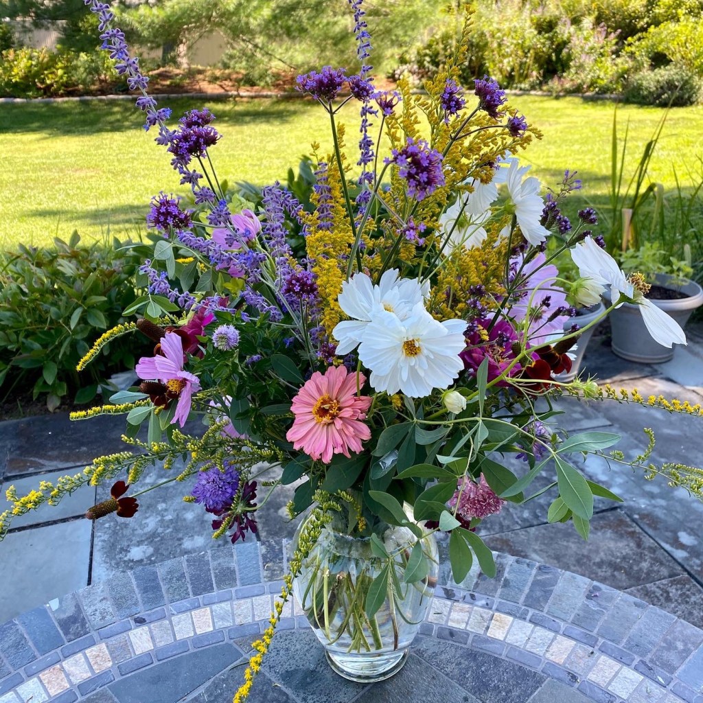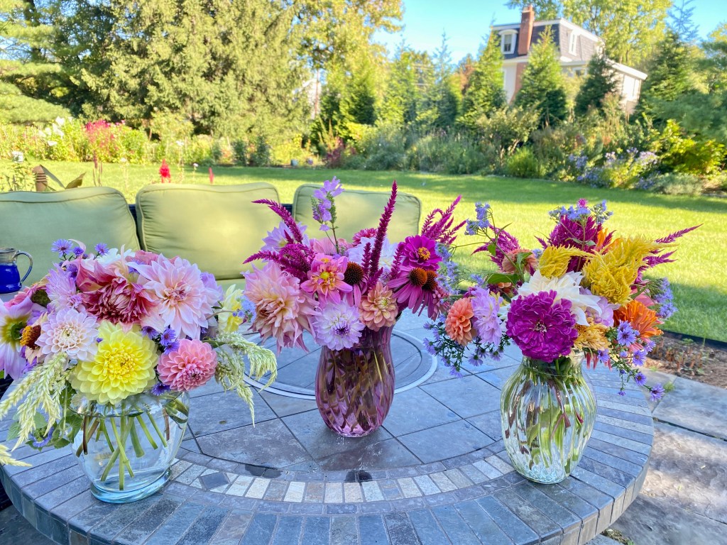 Floaty white woodland asters start blooming the end of SeptemberFour views of one bouquetSept 26 & 27th. Weekly flower pick ups and one celebratory individual pick upEarly September Dahlia Subscription pick upsSeptember 20-24 dahlia joy and so much moreAll the pinks in the garden, as requested by a client as a gift to the new mother of a baby girlMid-September Dahlia happinessPerennial Ast and blue mist flowers mixed in with Glorious, Dahlias and ZinniasSeptember 17-20Joyful Batmitvah flowers. Square clear vases wrapped with hosta leaves. “the flowers you did for Lauren were absolutely amazing! People were talking about them!!!! 🌸. And she got to use them again at night.”September 14 Weekly flower subscription pick up in two palettes.These flowers are all arranged in the beautiful vases of a beloved mother and grandmother and used at her memorial and then given to friends and family to keep. September 10.Last day of September includes Montauk Daisy joy, lots of dahlias and incredible roses.For the Powder RoomWater Lily DahliasJapanese AnenomeSoligado Late September