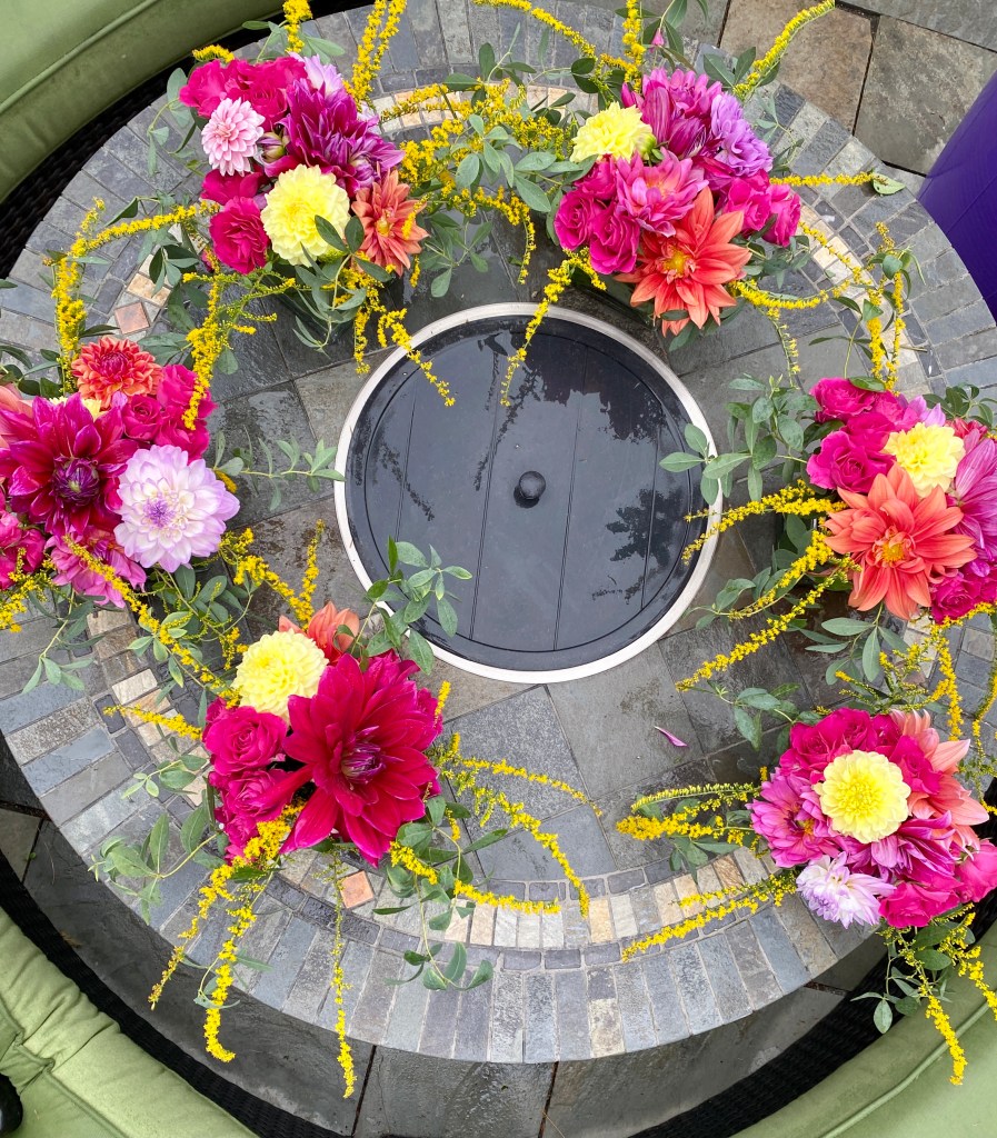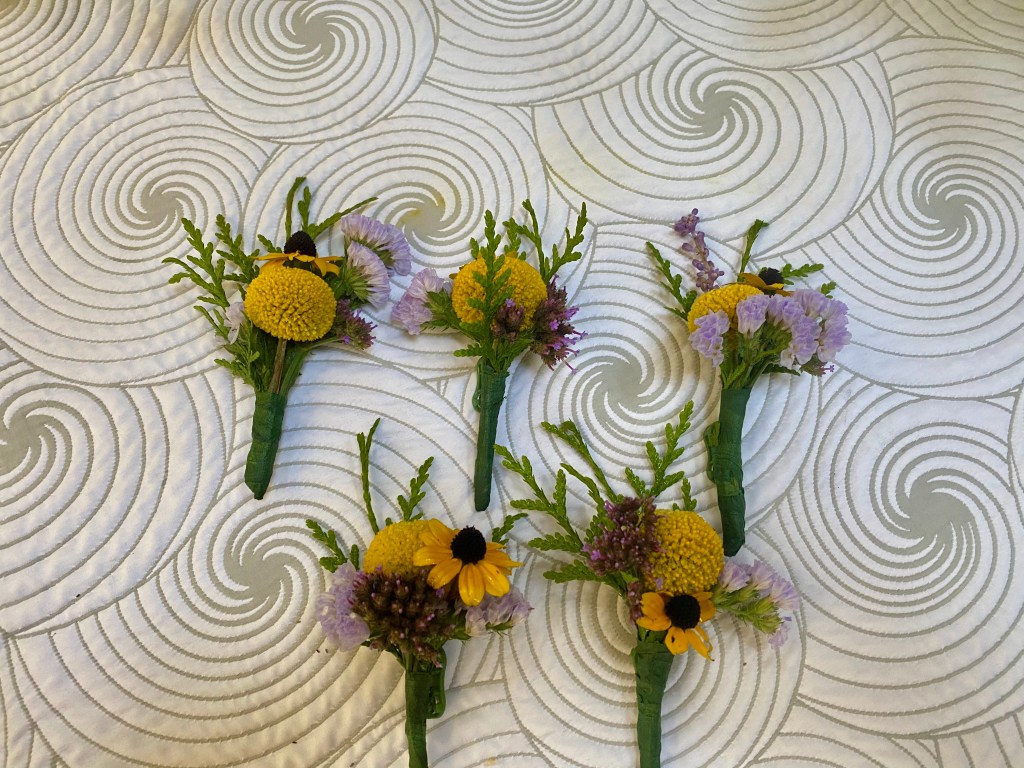 Magical dahlias anyone? They come in so many shapes and colors, they are irresistible! I initially grew two varieties of water lily type dahlias successfully (i.e. not eaten by deer, learned to stake them and give them enough light), so I expanded a garden bed to accommodate many more varieties. So many more varieties have been added. Because, yes, I LOVE flowers and would grow all of them if I could (and you do need to dig up all the tubers and store them for the winter here in zone 7a, as well as stake them and fertilize and water frequently, and ideally give then an indoor head start in a pot—so not low maintenance). Dahlias, zinnias, black-eyed susan, cosmos, celosia, roses, ageratum, aster, calamint, and nicotinia are all in bloom as is the magical yellow fireworks sprays of Solidago. And I just added many varieties of roses which bloom throughout the summer into fall and will be more prolific with time. The purple and yellow themed boutonnieres, bridesmaid bouquets, and table arrangements were for a micro family wedding in September, and 90% from my garden.