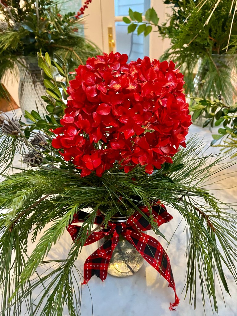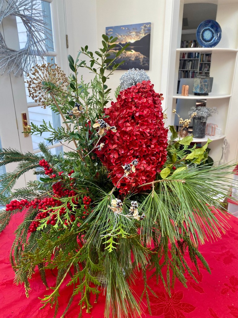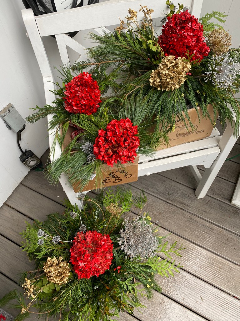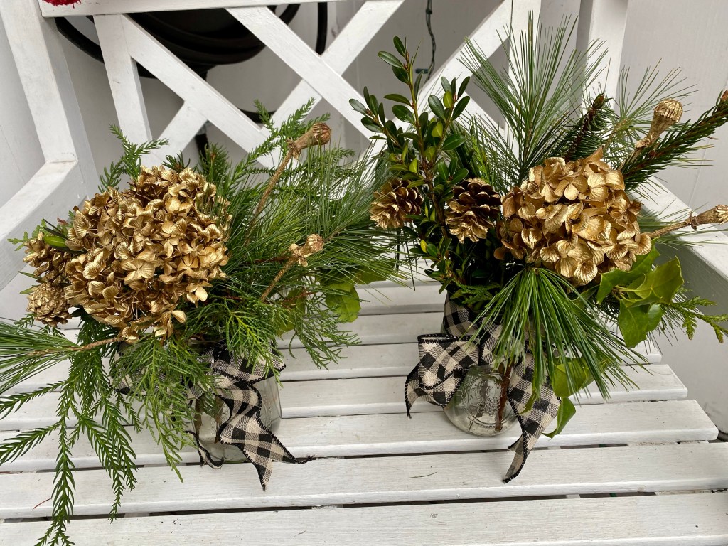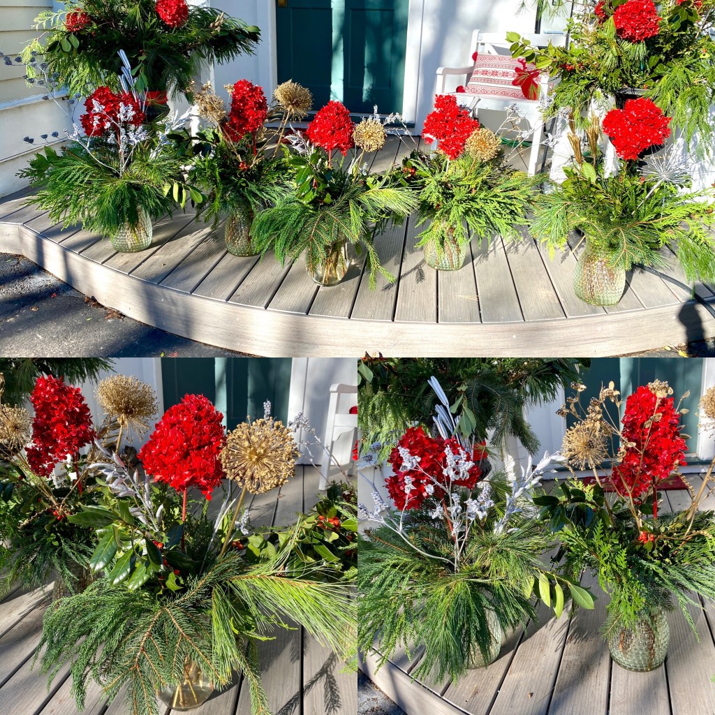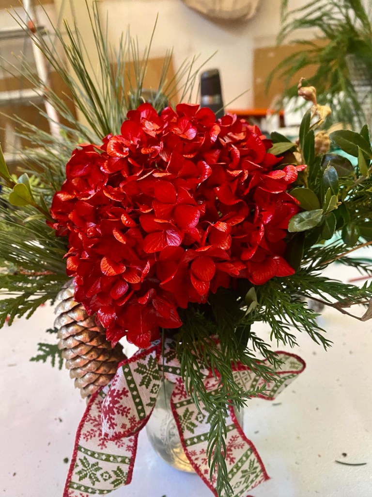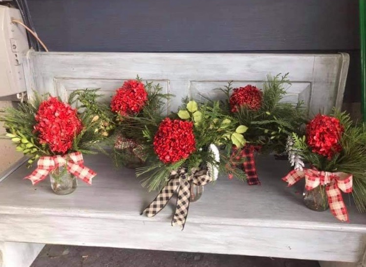 Let me design a spectacular, unique, and long lasting (5 weeks if you change the water once a week) holiday tall vase of happiness or cute mason jars for your own holiday festiveness, or as gifts. I use 7 types of evergreens from my yard, dried and spray painted allium, hydrangeas, formosa lilies, velvetleaf pods, blackberry lily pods, poppy seed pods and pinecones and festive ribbon. Vases $45-55 each (can make premium vases for more, which one customer used as a substitute Christmas tree), mason jars $12 each.