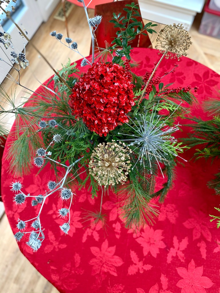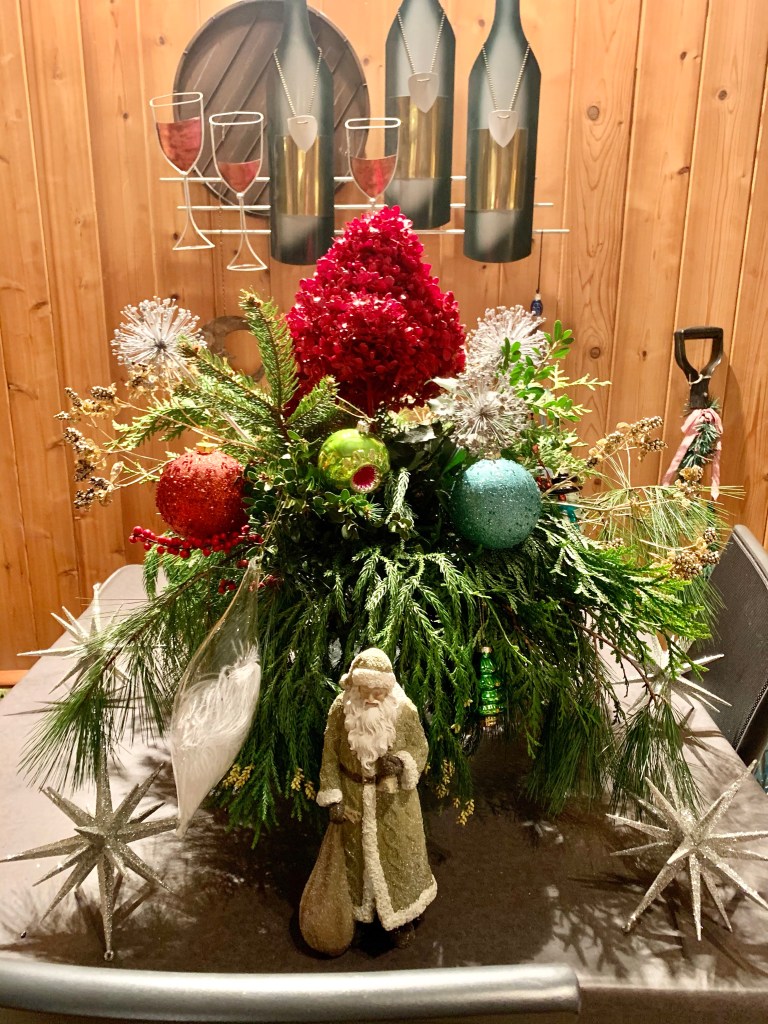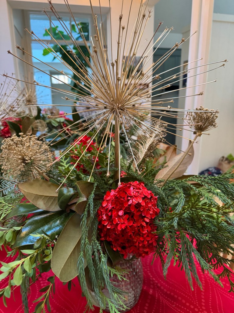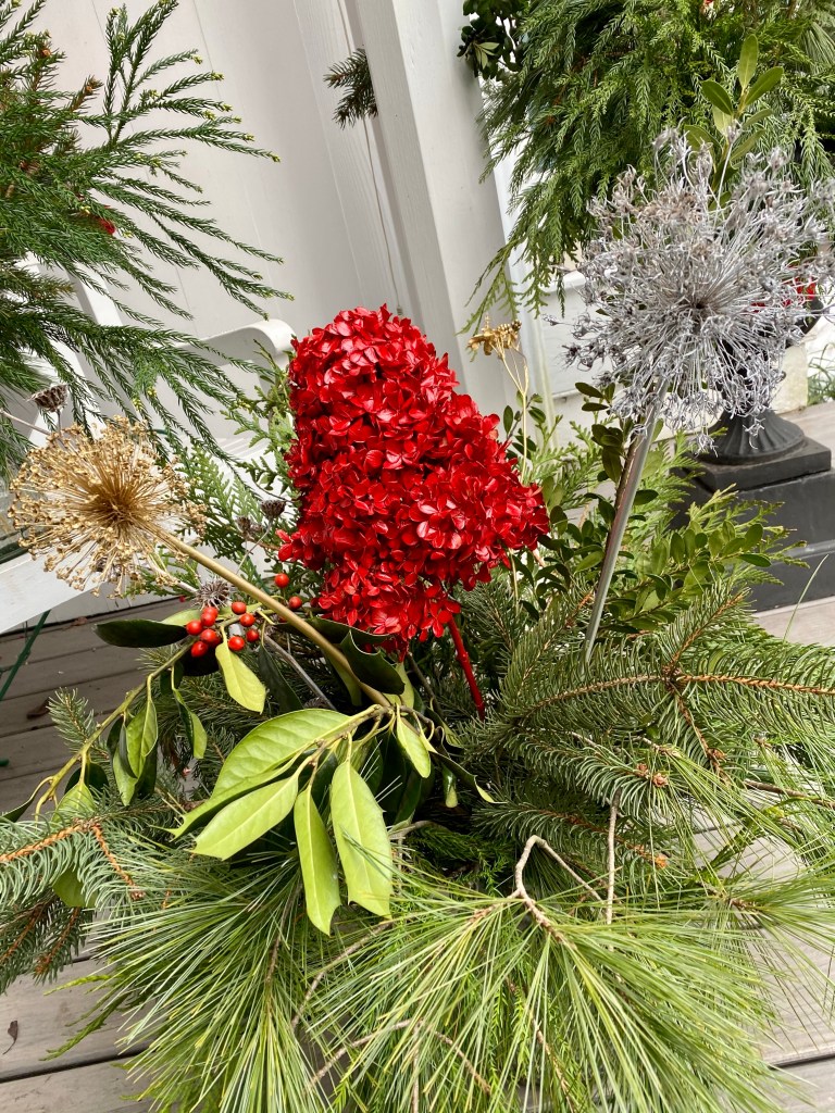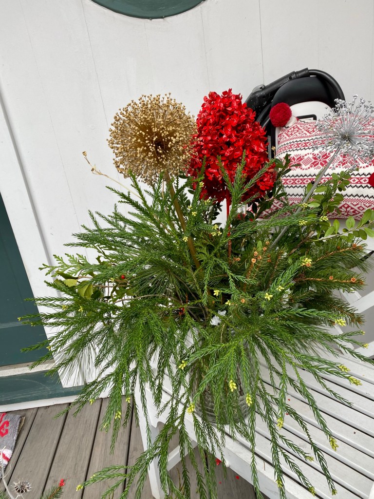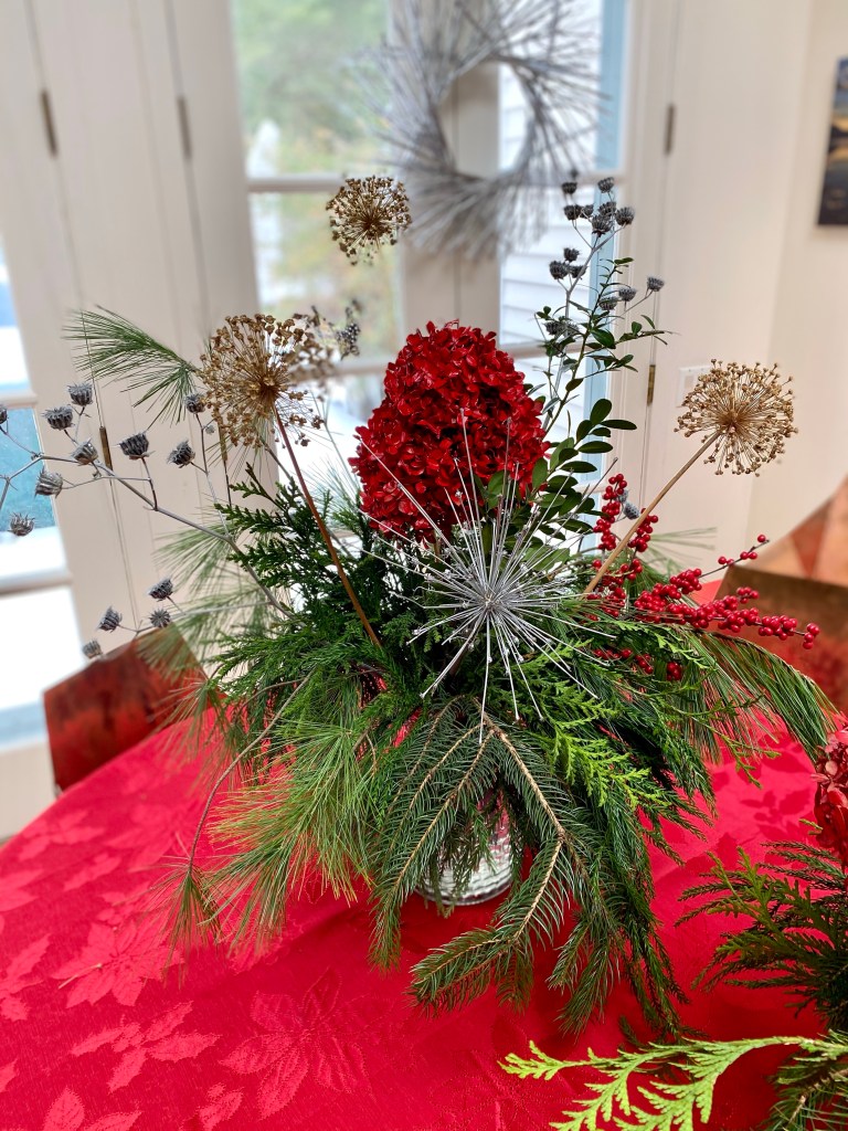 Let me design a spectacular, unique, and long lasting (5 weeks if you change the water once a week) holiday tall vase of happiness or cute mason jars for your own holiday festiveness, or as gifts. I use 7 types of evergreens from my yard, dried and spray painted allium, hydrangeas, formosa lilies, velvetleaf pods, blackberry lily pods, poppy seed pods and pinecones and festive ribbon. Vases $45-55 each (can make premium vases for more, which one customer used as a substitute Christmas tree), mason jars $12 each.