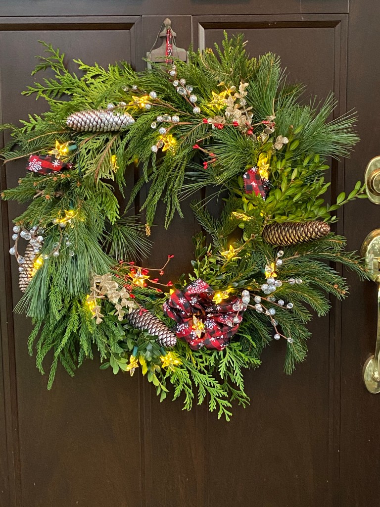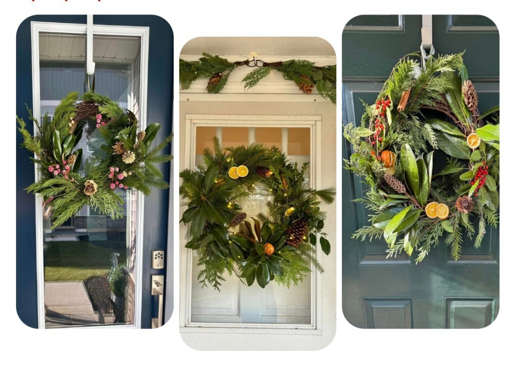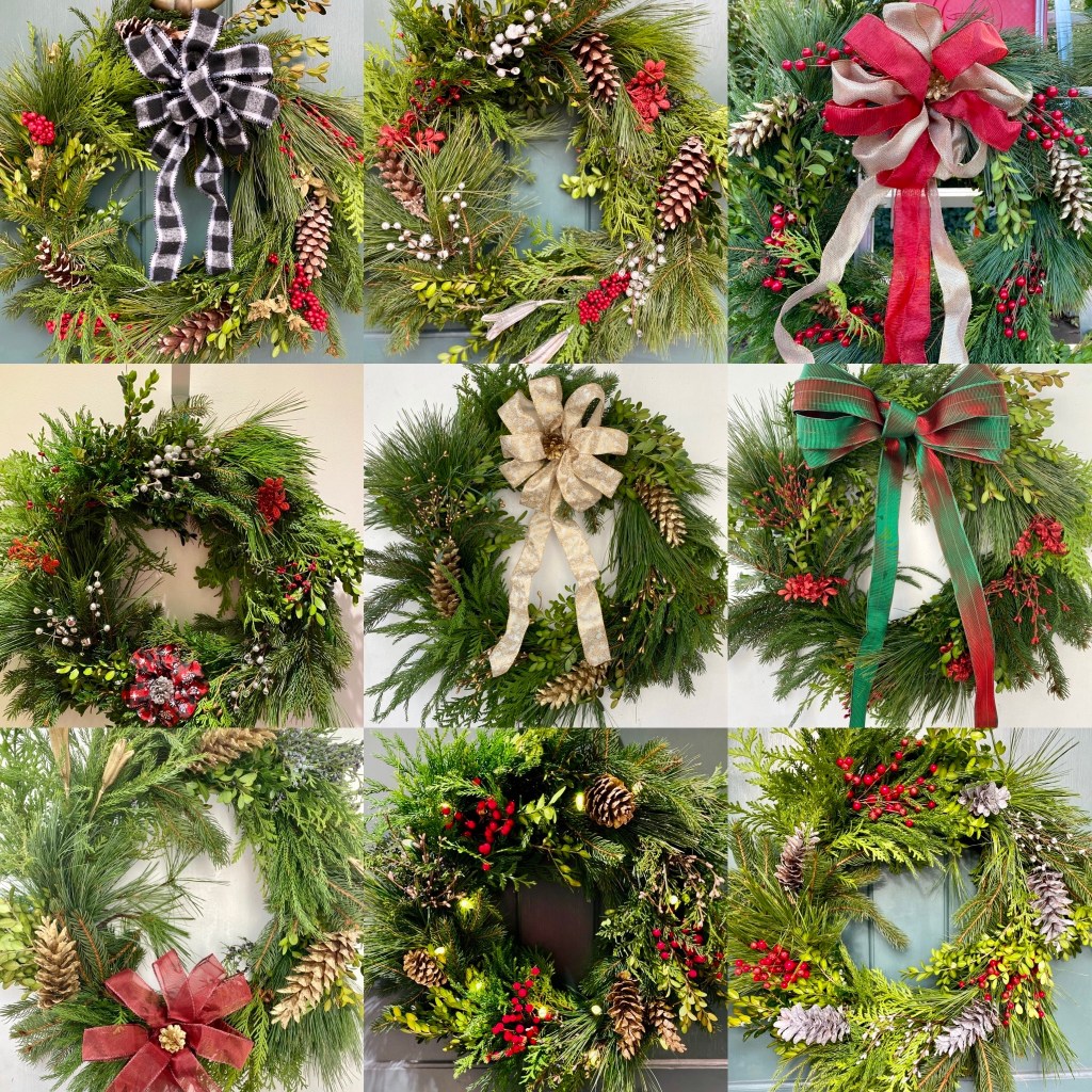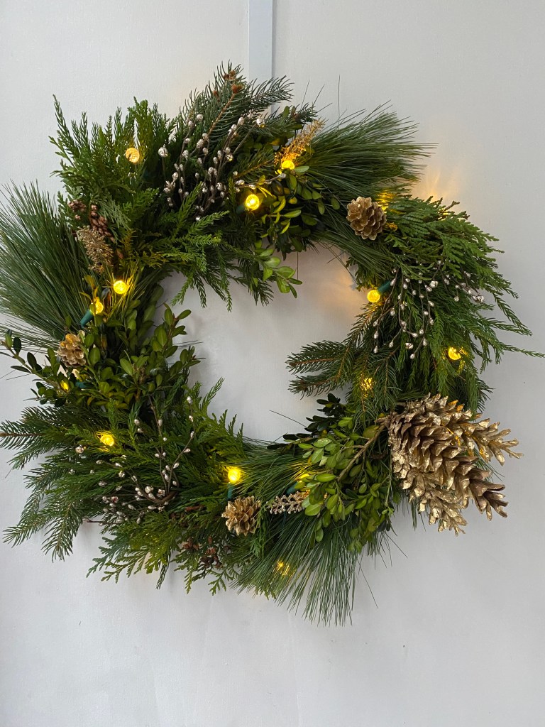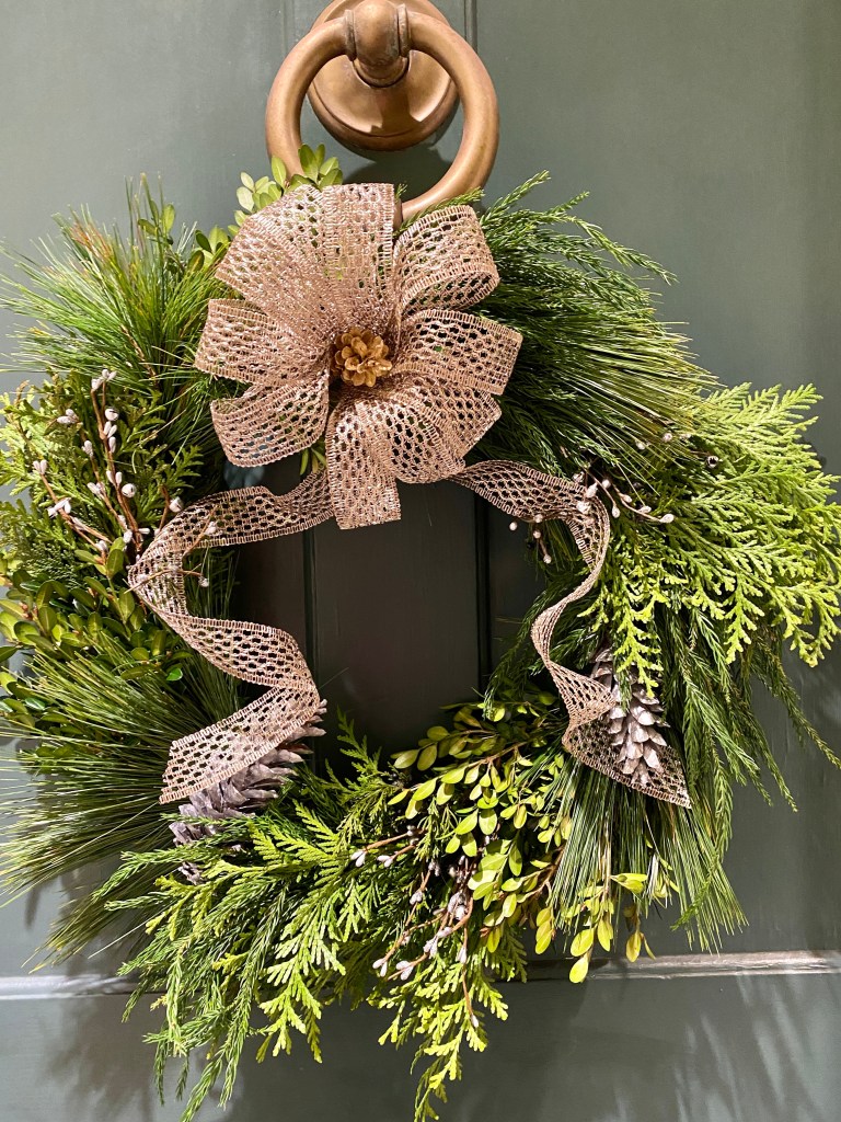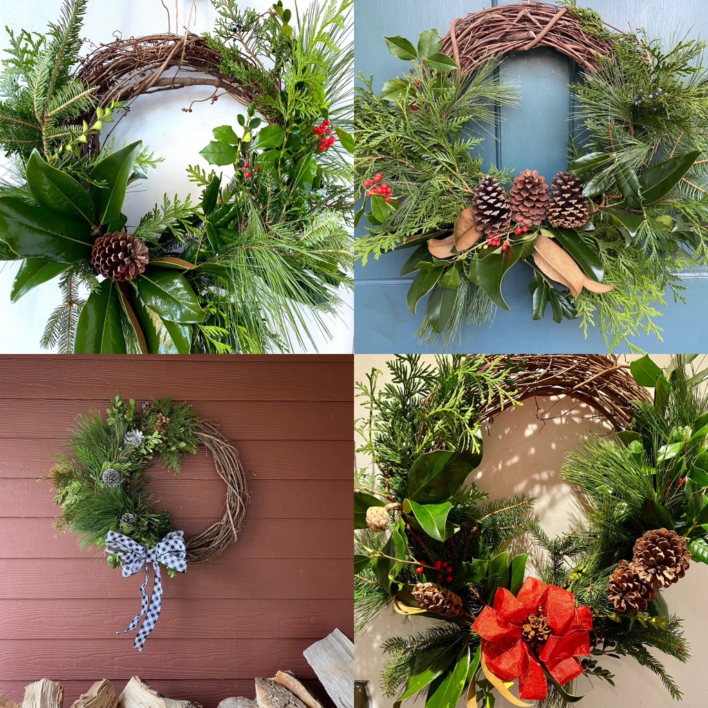 Order one with natural, gold, or silver accents. With or without battery operated lights or bow… grapevine style highlights premium greens or Evergreen all the way around on a wire frame. Or come to our annual pop-up sale at my house the first Saturday of December from 11 to 3 and pick one out.  December 6, 2025.