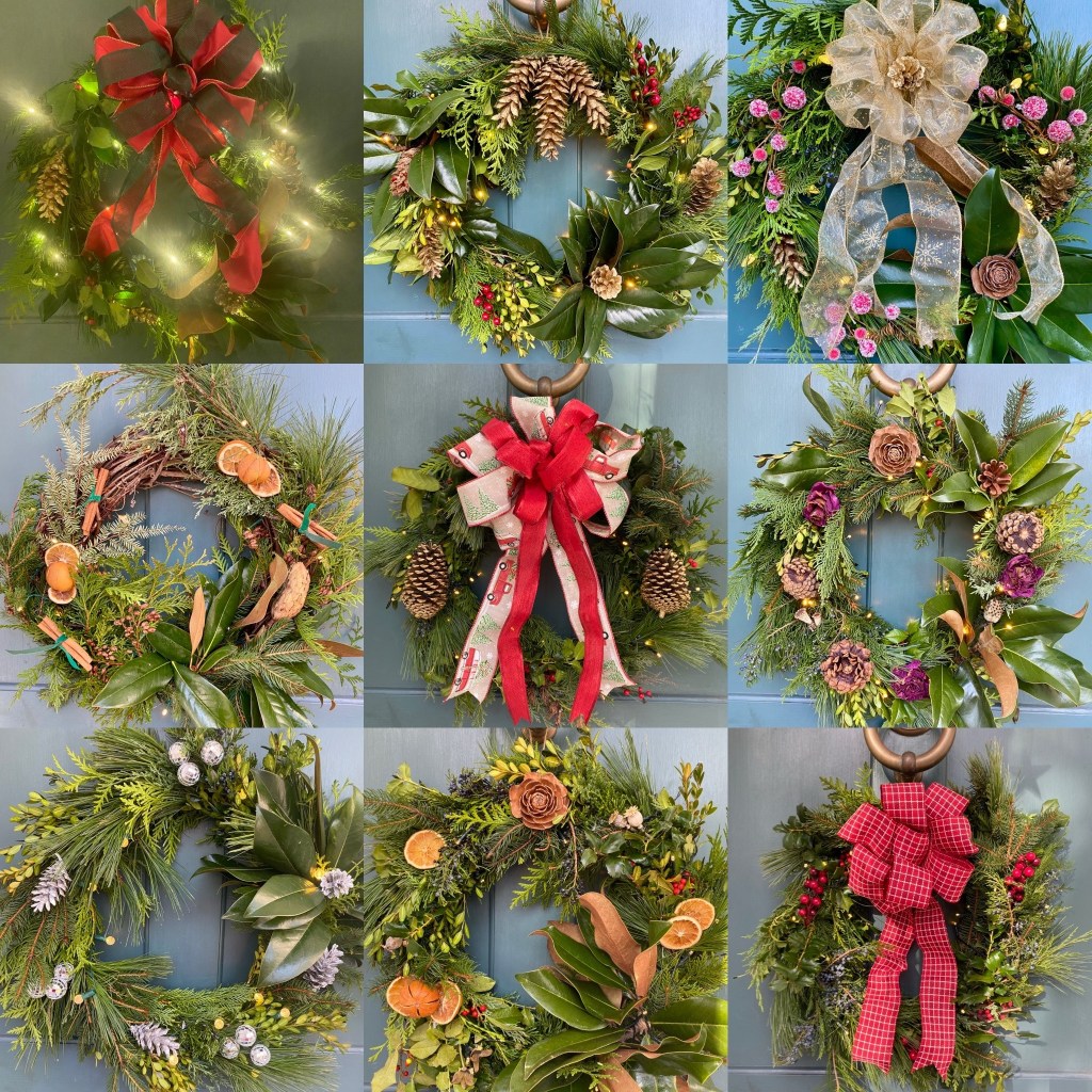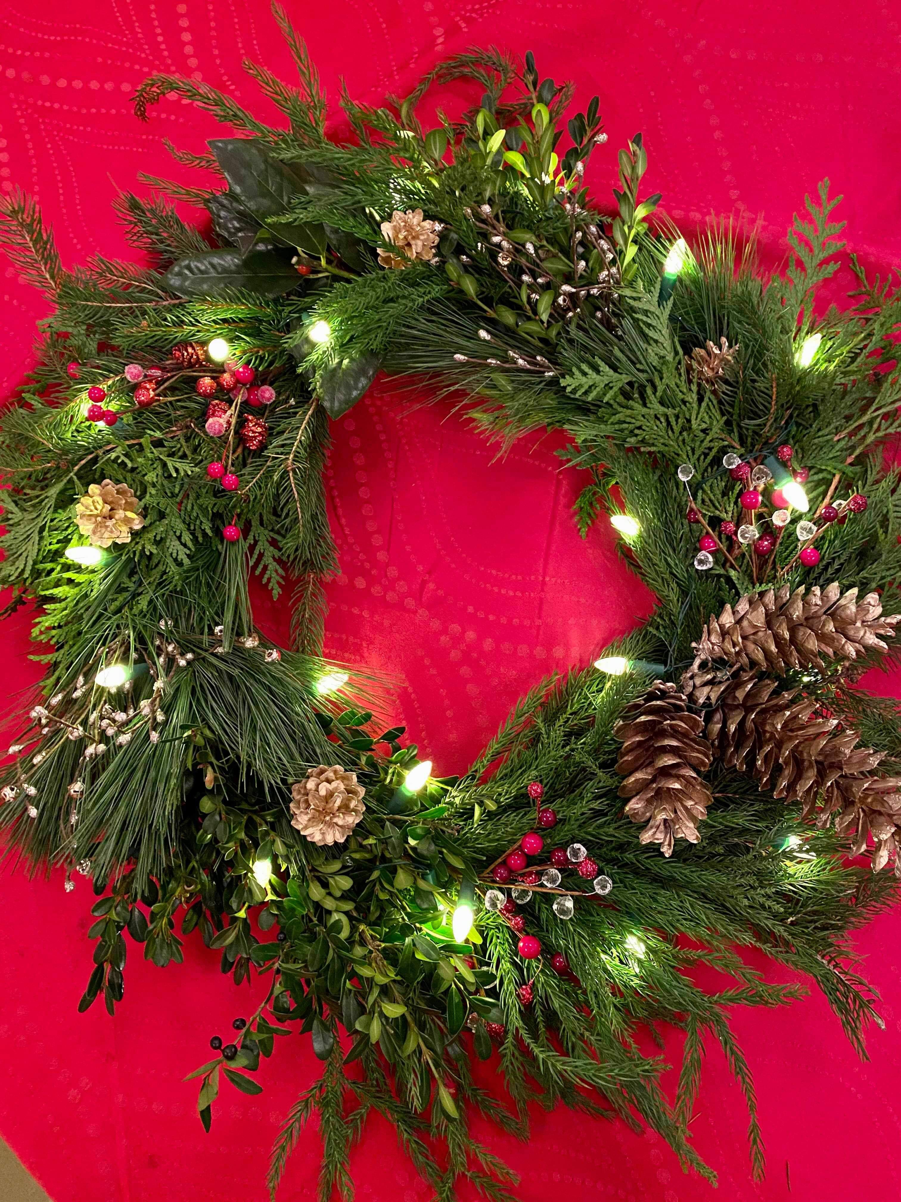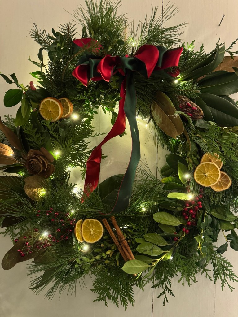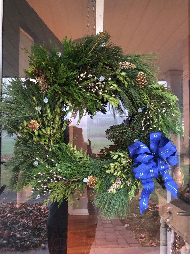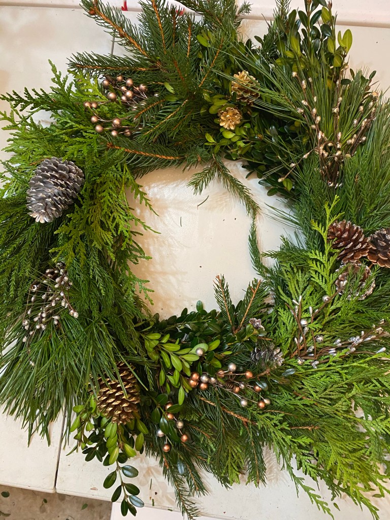 Order one with natural, gold, or silver accents. With or without battery operated lights or bow… grapevine style highlights premium greens or Evergreen all the way around on a wire frame. Or come to our annual pop-up sale at my house the first Saturday of December from 11 to 3 and pick one out.  December 6, 2025.