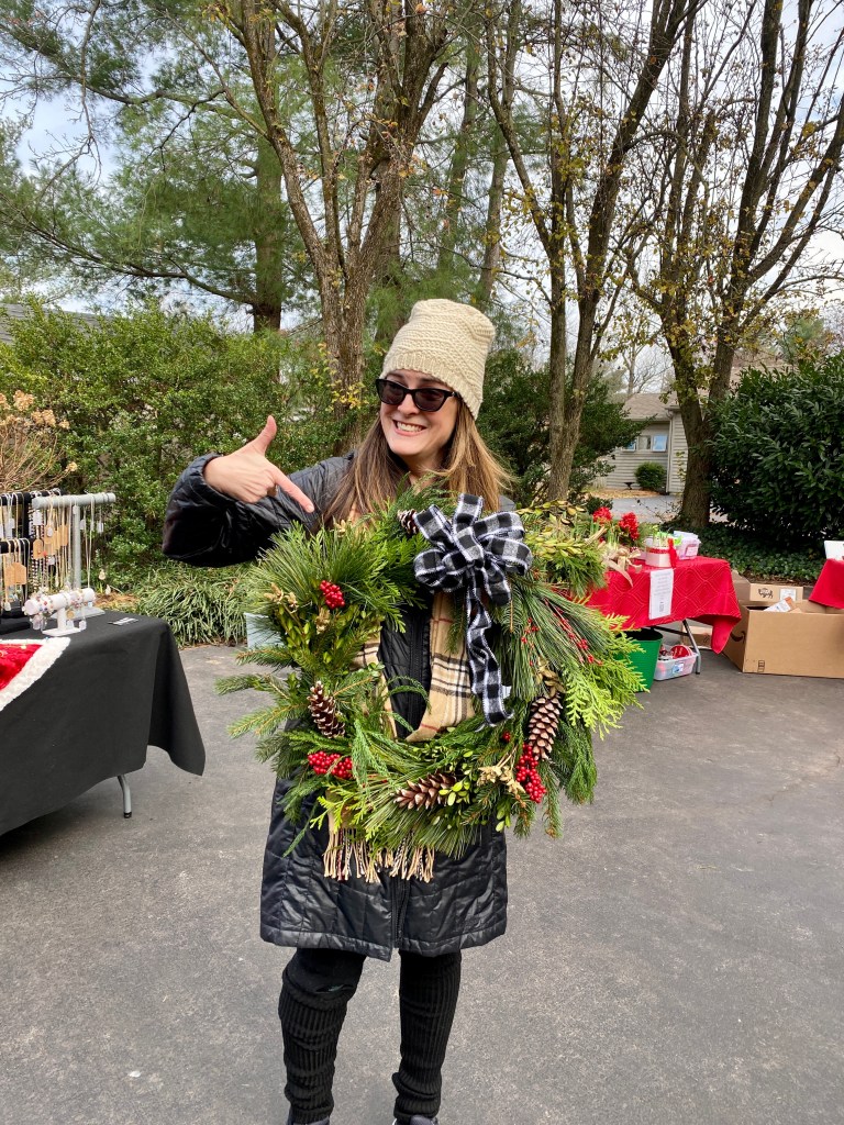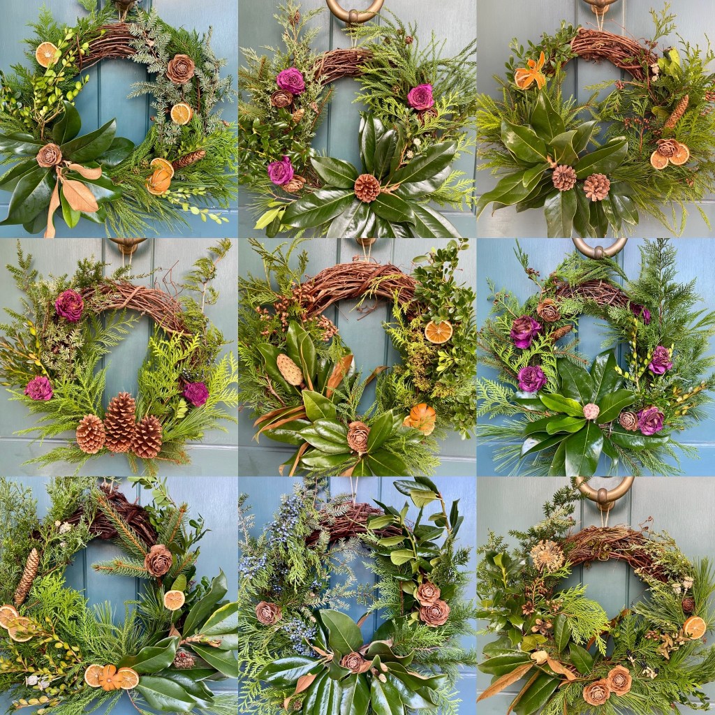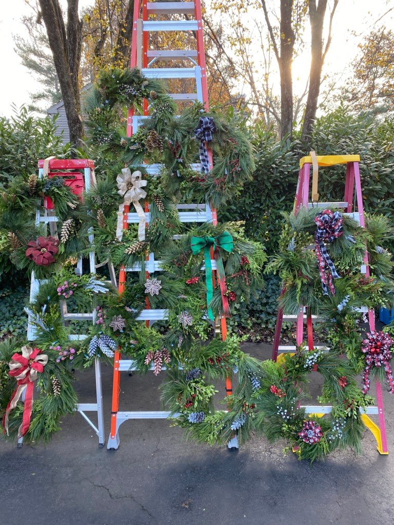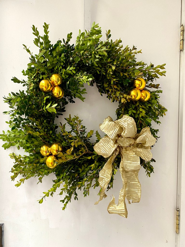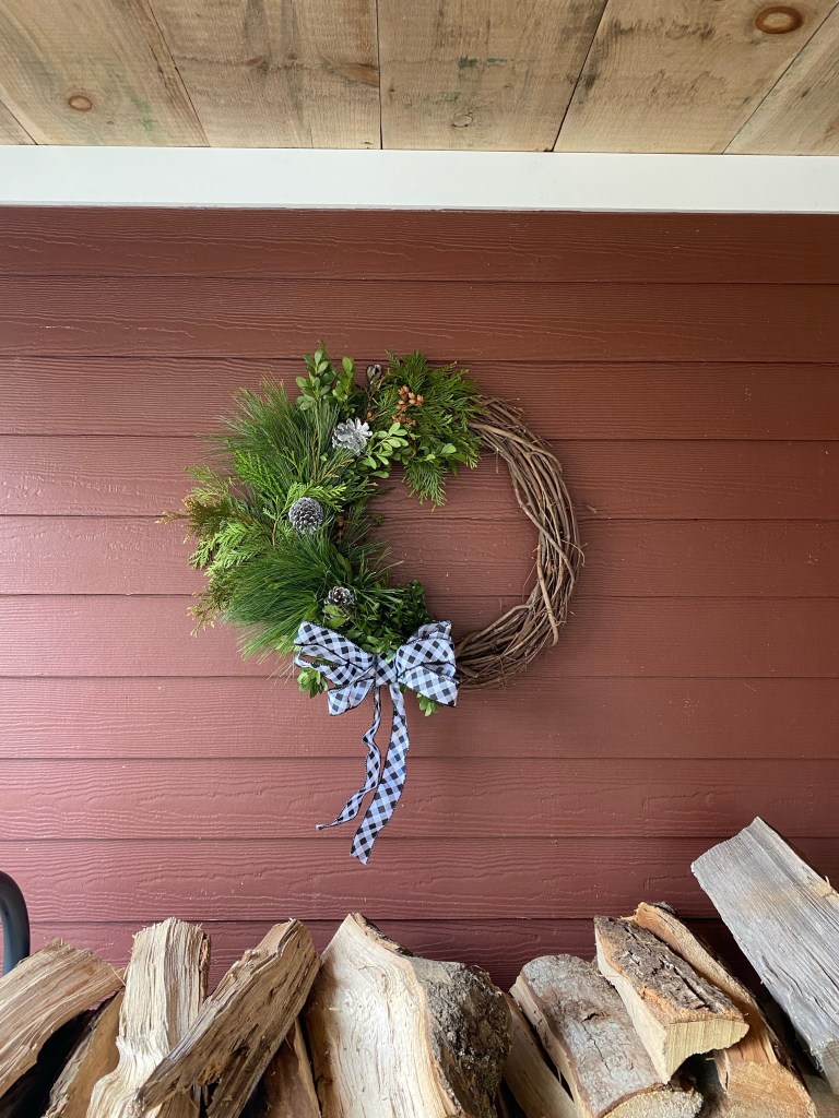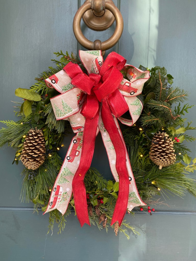 Order one with natural, gold, or silver accents. With or without battery operated lights or bow… grapevine style highlights premium greens or Evergreen all the way around on a wire frame. Or come to our annual pop-up sale at my house the first Saturday of December from 11 to 3 and pick one out.  December 6, 2025.