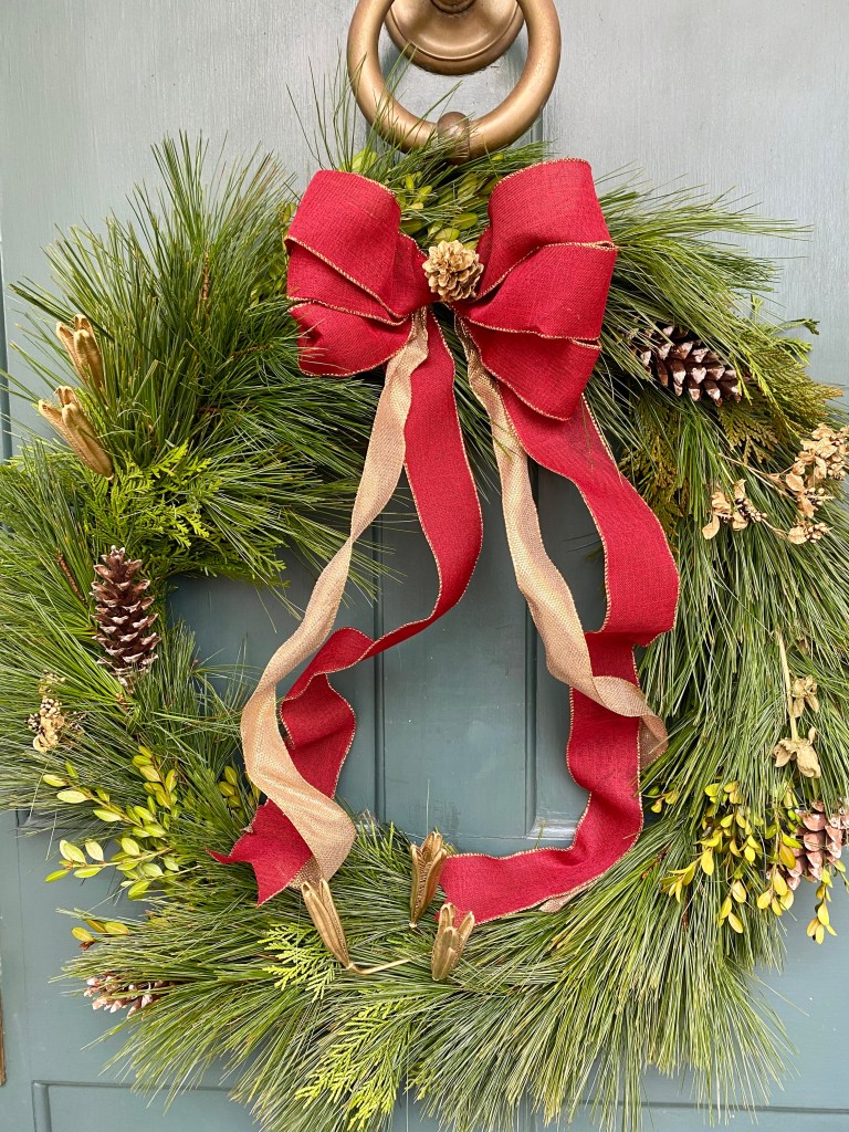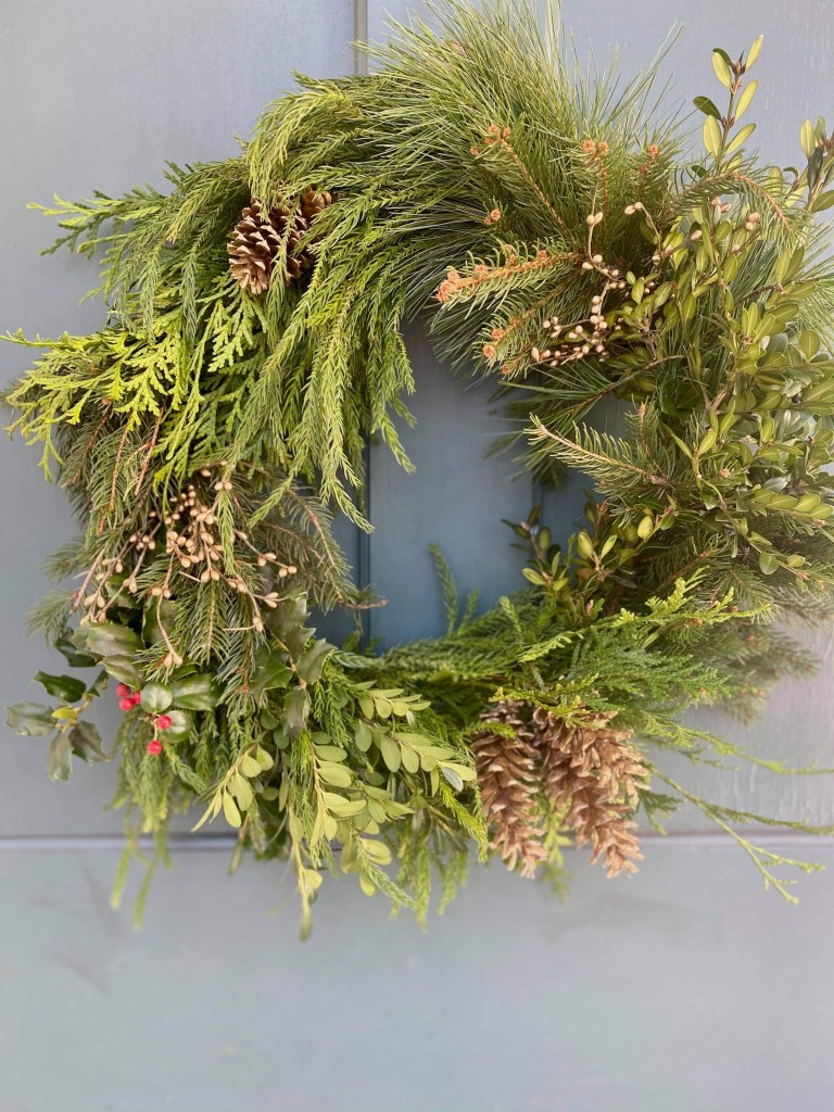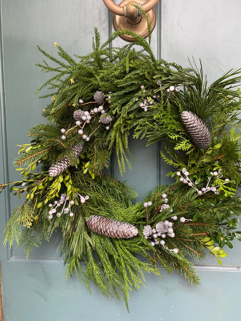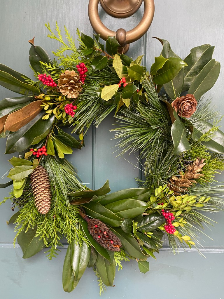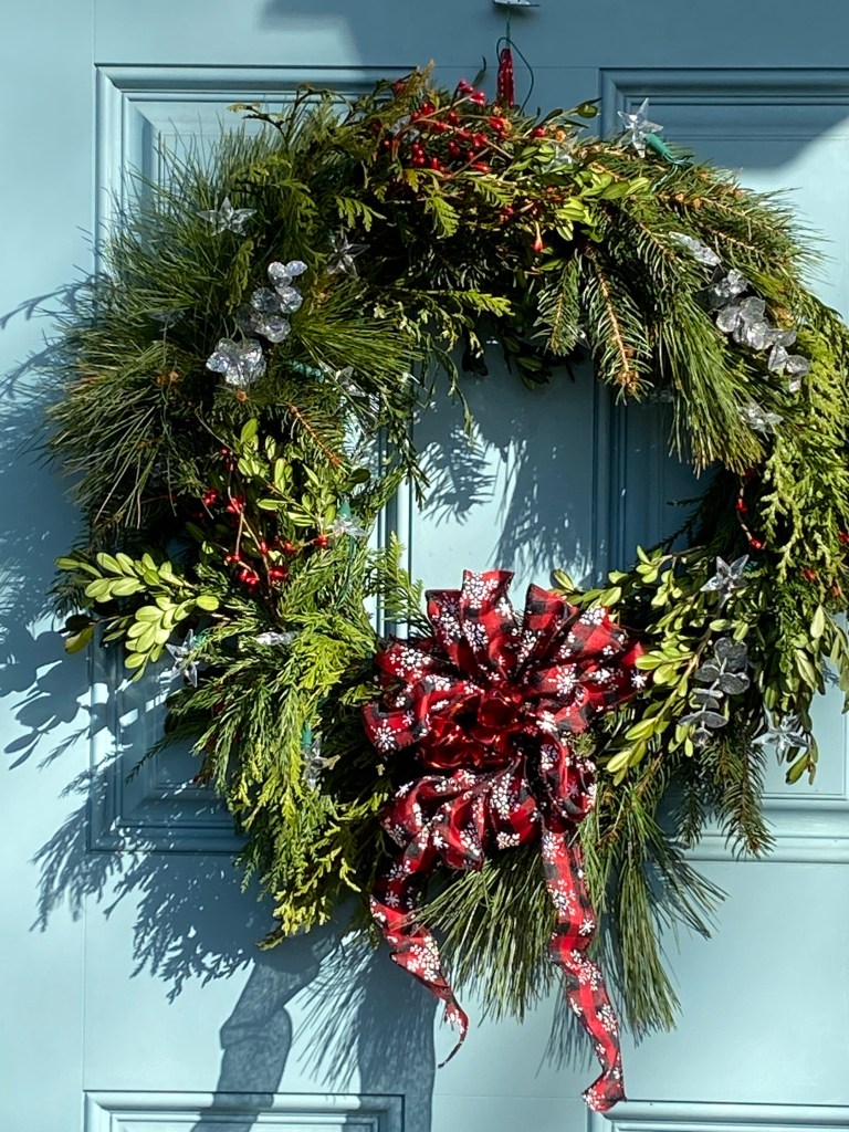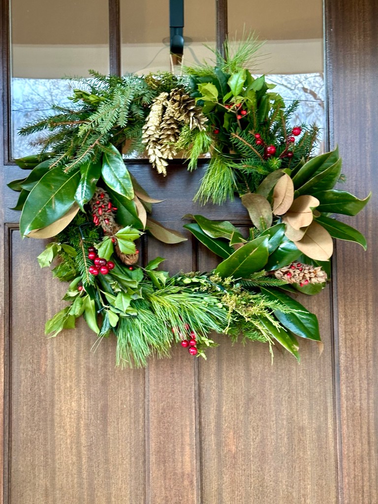 Magical and fragrant fresh evergreens to brighten your front door. Let me design a spectacular, unique, and long lasting, loving pre-hydrated (three step process no other wreath maker/seller does) and treated for longevity (8-10 weeks depending on how much direct sun) wreath to brighten your front door. I use many types of evergreens from my yard (including Japanese cedar, the sacred tree of Japan that you won’t find anywhere else), southern magnolia from my mother’s trees in Virginia , spray painted and natural pine-cones, blackberry lily pods, formosa lily pods, poppy pods, peony pods…and some craft store elements.