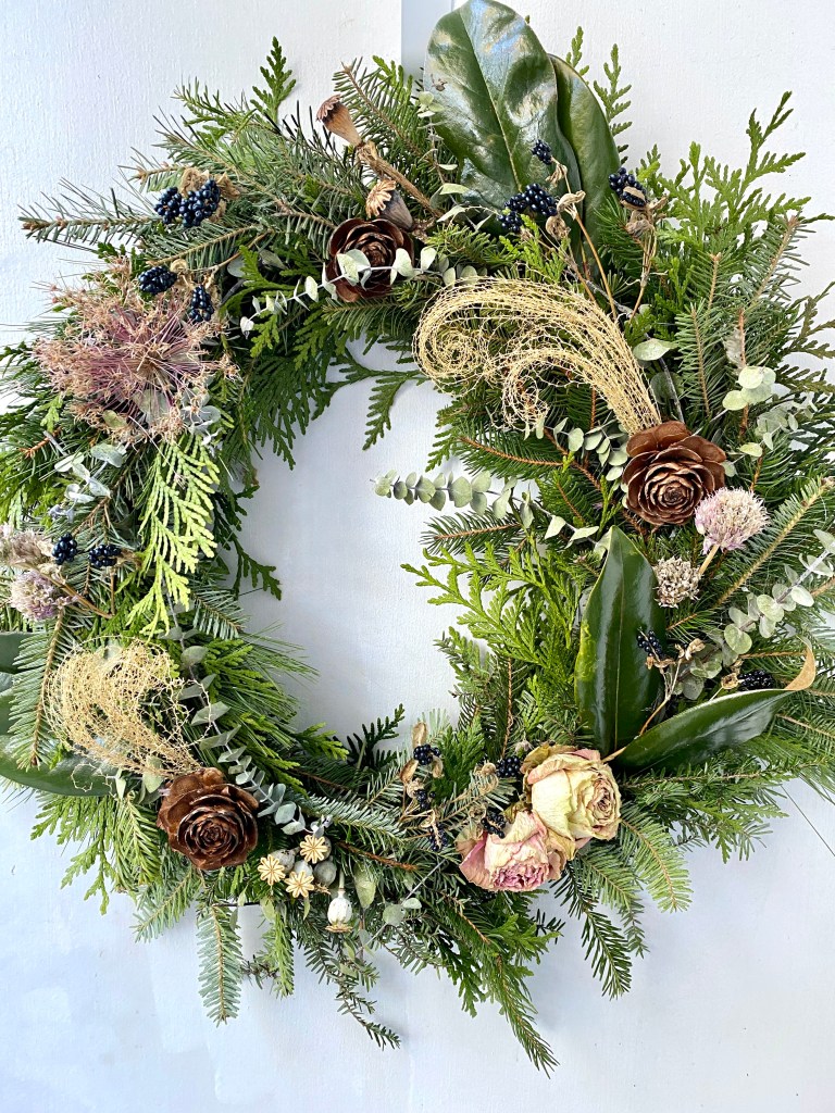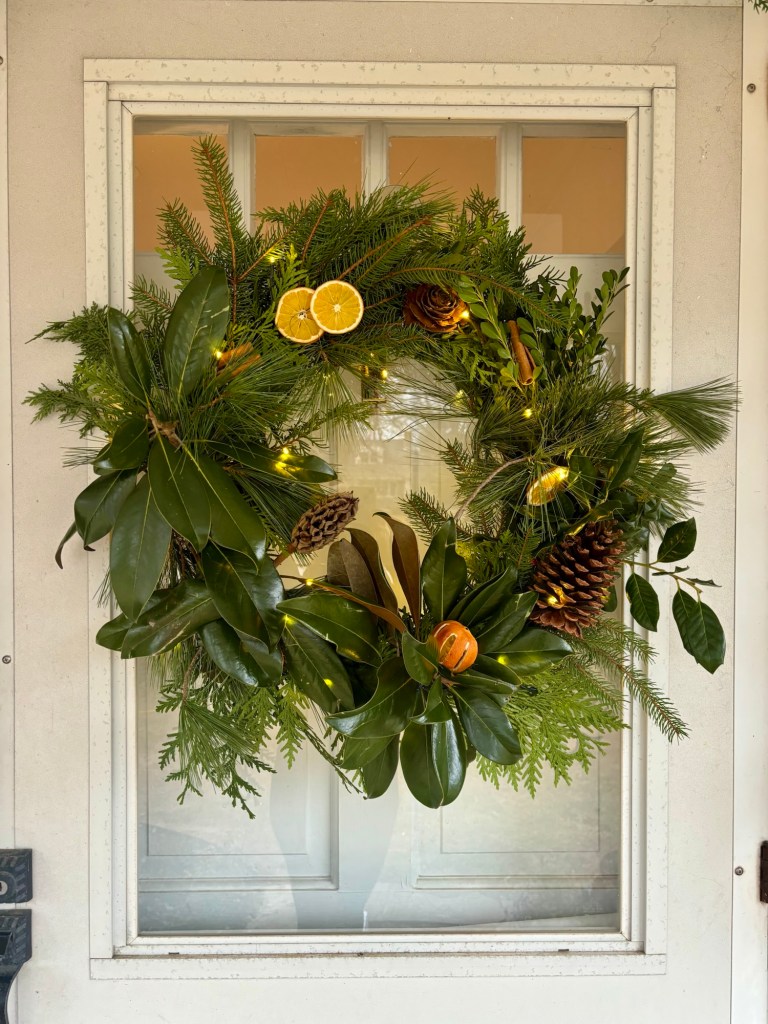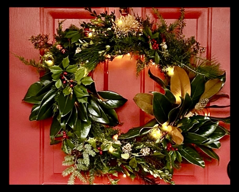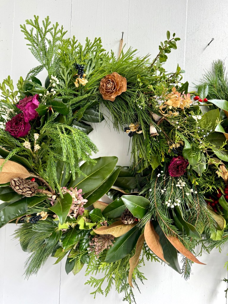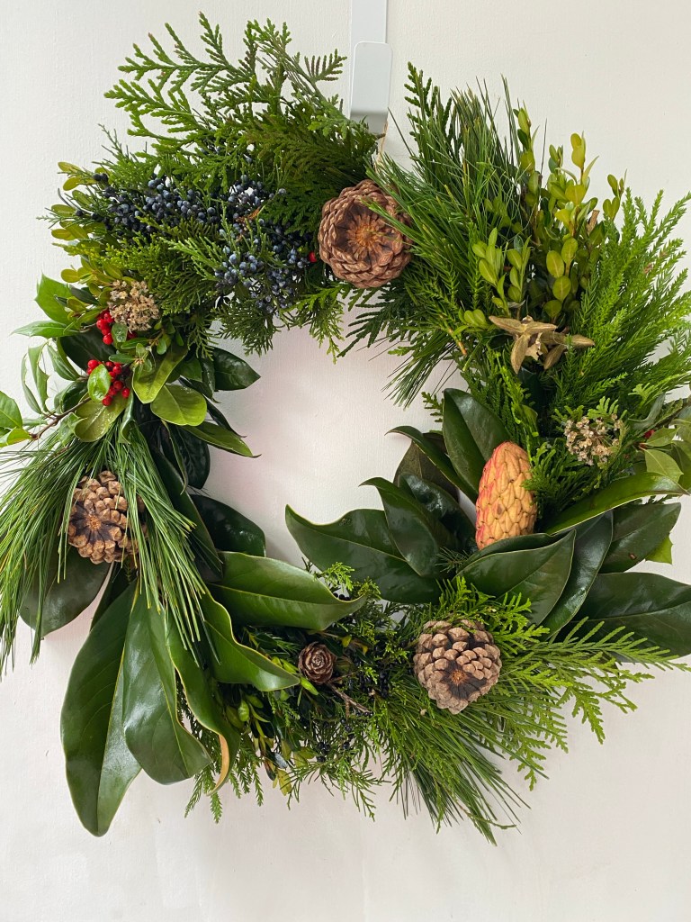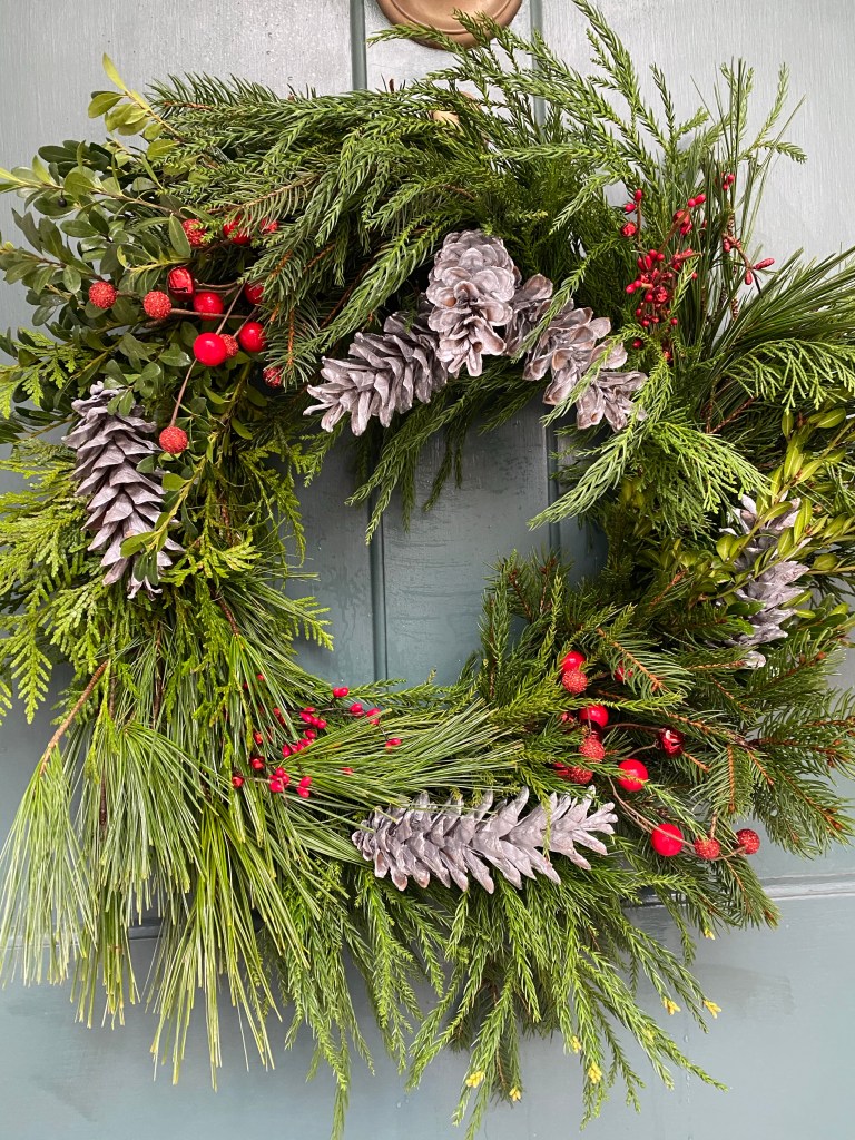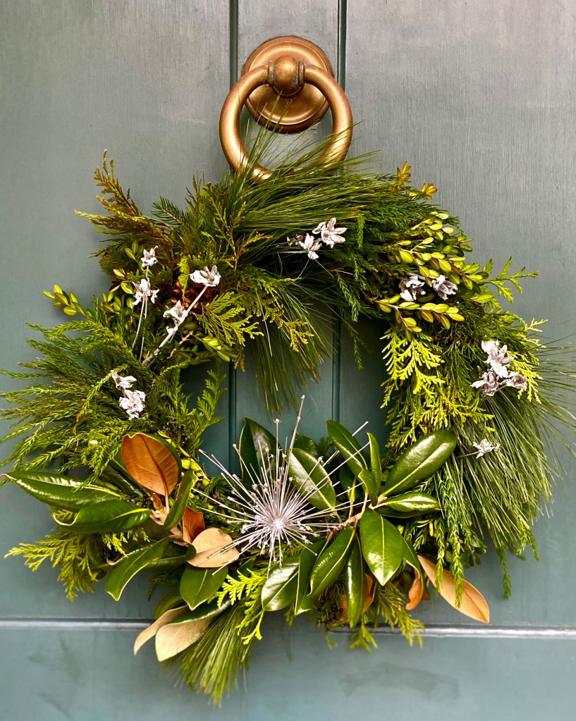 Magical and fragrant fresh evergreens to brighten your front door. Let me design a spectacular, unique, and long lasting, loving pre-hydrated (three step process no other wreath maker/seller does) and treated for longevity (8-10 weeks depending on how much direct sun) wreath to brighten your front door. I use many types of evergreens from my yard (including Japanese cedar, the sacred tree of Japan that you won’t find anywhere else), southern magnolia from my mother’s trees in Virginia , spray painted and natural pine-cones, blackberry lily pods, formosa lily pods, poppy pods, peony pods…and some craft store elements.