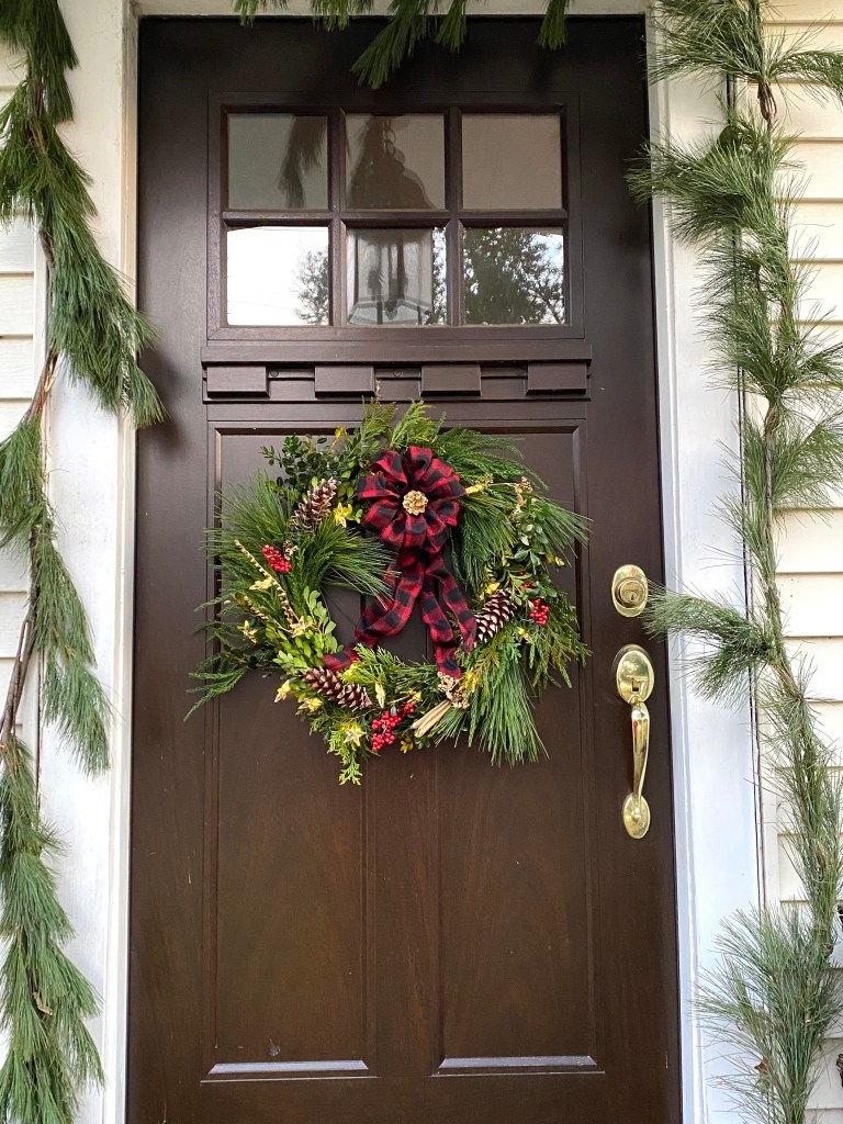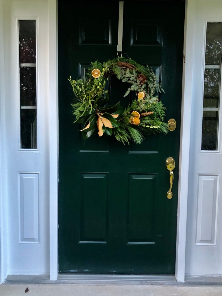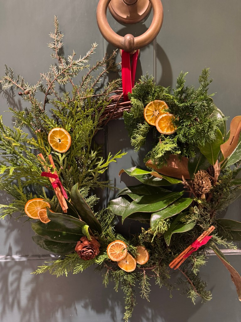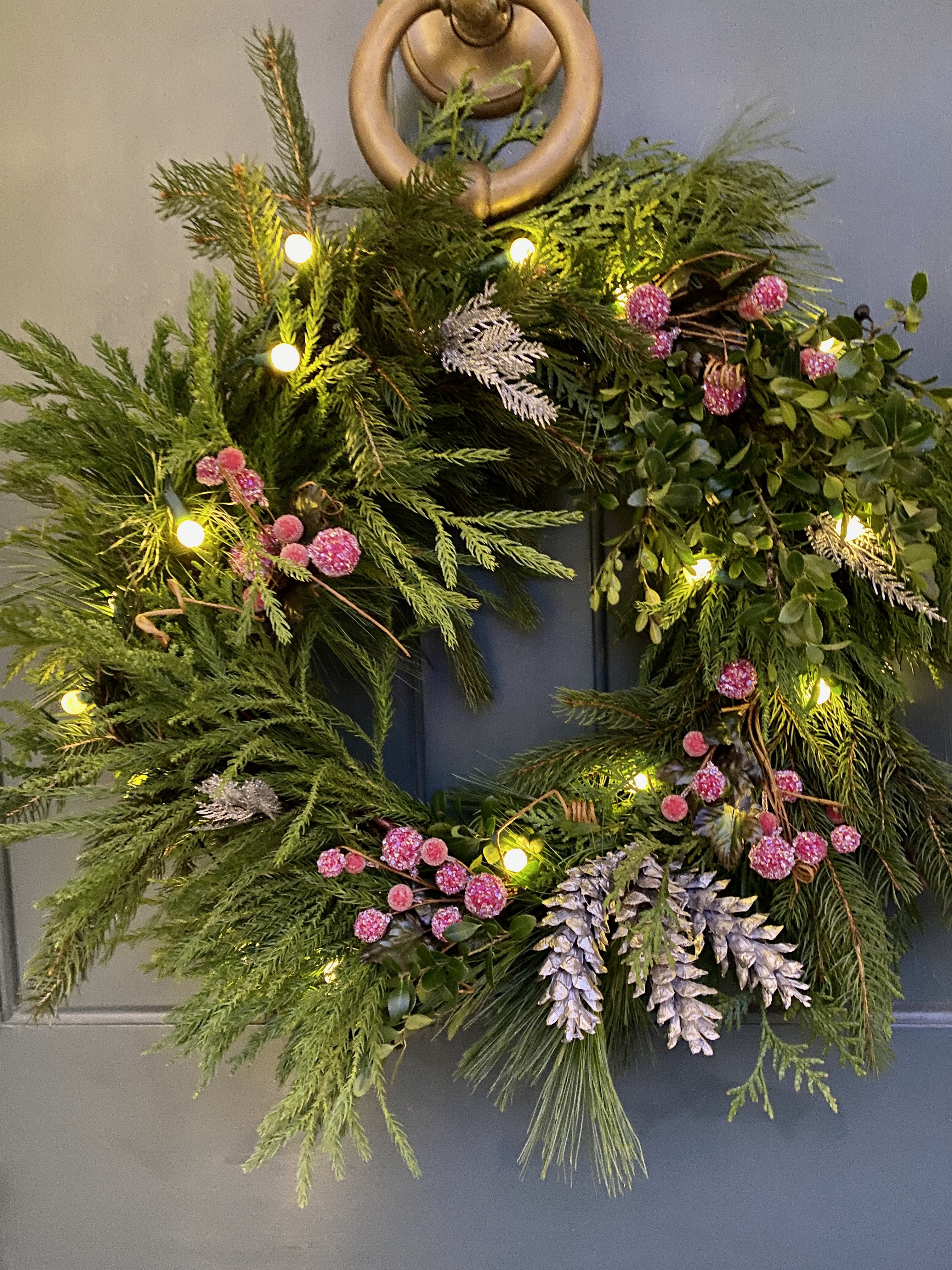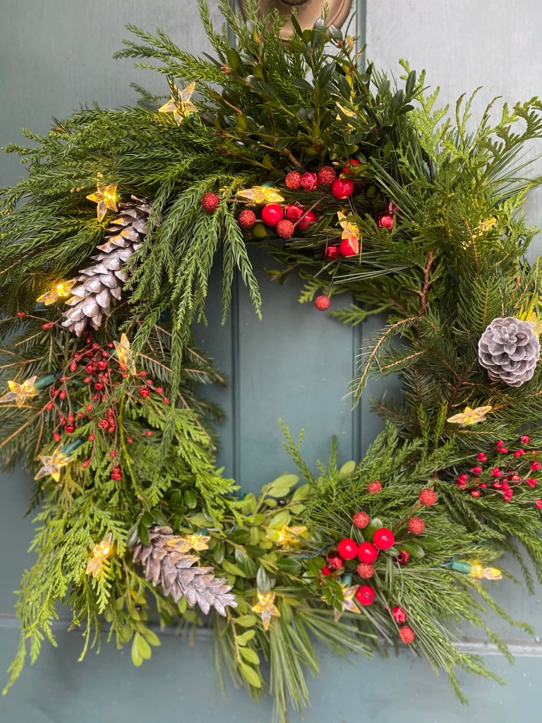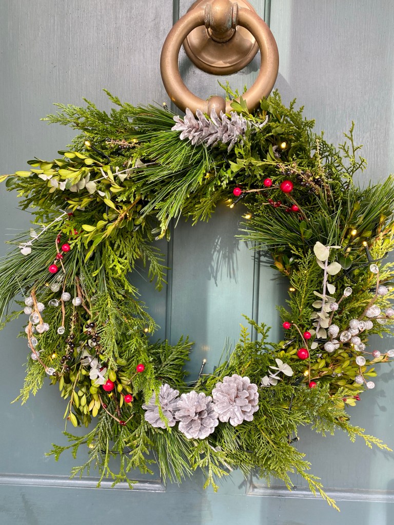 Magical and fragrant fresh evergreens to brighten your front door. Let me design a spectacular, unique, and long lasting, loving pre-hydrated (three step process no other wreath maker/seller does) and treated for longevity (8-10 weeks depending on how much direct sun) wreath to brighten your front door. I use many types of evergreens from my yard (including Japanese cedar, the sacred tree of Japan that you won’t find anywhere else), southern magnolia from my mother’s trees in Virginia , spray painted and natural pine-cones, blackberry lily pods, formosa lily pods, poppy pods, peony pods…and some craft store elements.