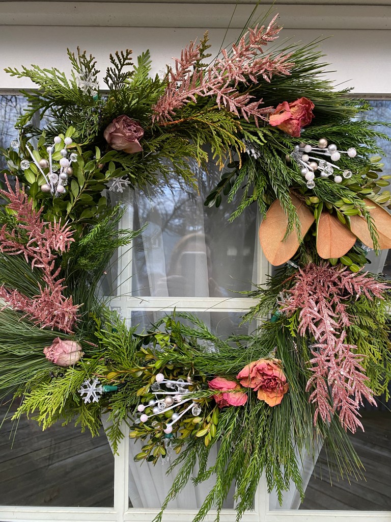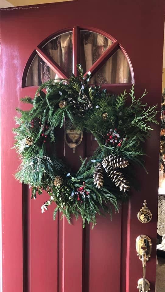 $50 for an 18” frame (about , grapevine or wire frame (24-28” with greens) perfect for most doors, $20 more with battery and timer operated lights. Can make larger or smaller. Many customers told me they lasted longer than any wreath they have ever had, and they took it down right before Valentine’s Day.